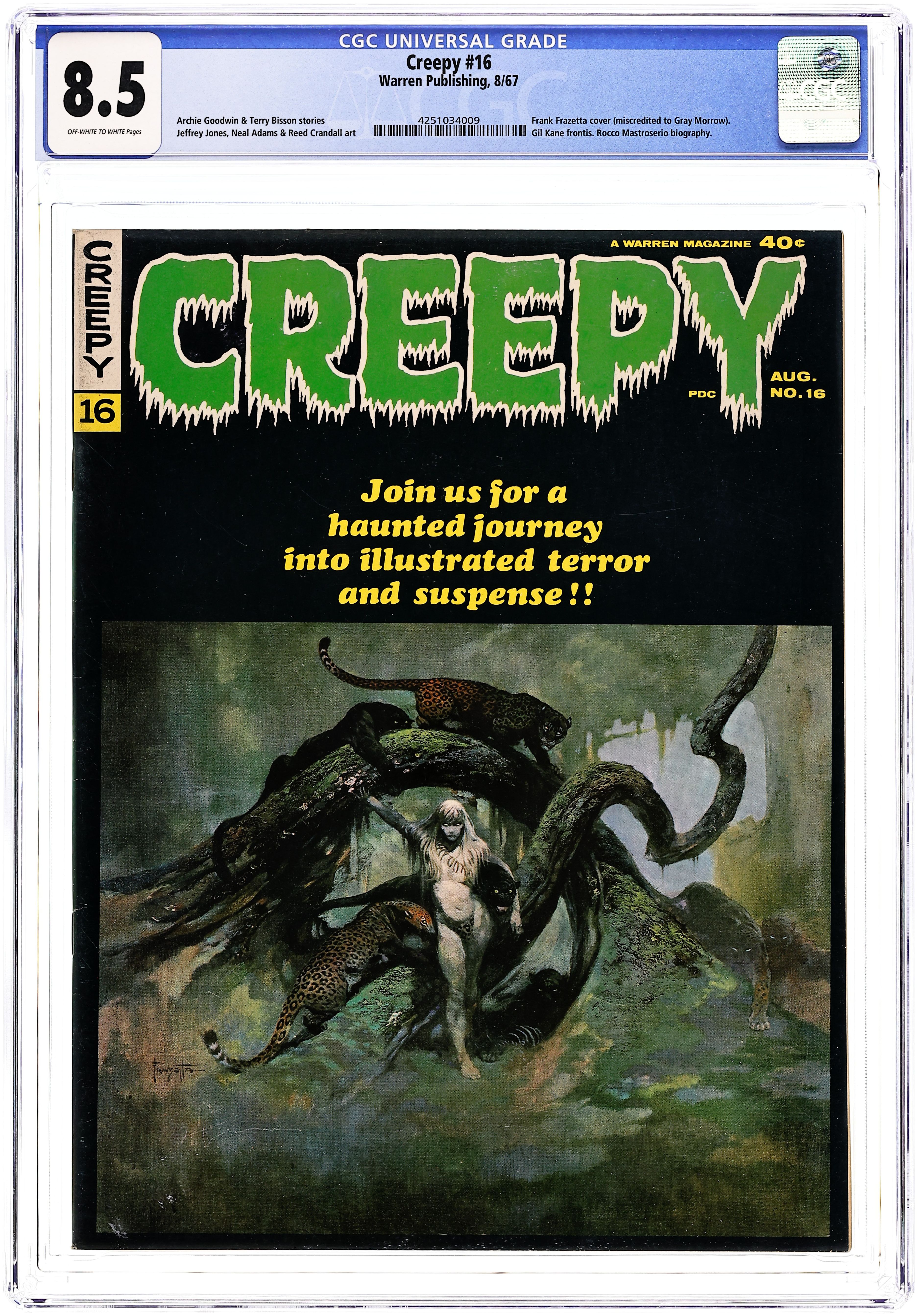 Stories in this issue include: A Curse of Claws by Archie Goodwin and Neal Adams; Frozen Fear by Archie Goodwin and Reed Crandall; Thane: Angel of Doom by Archie Goodwin and Jeff Jones; The Frankenstein Tradition by Archie Goodwin and Rocco Mastroserio; There Was an Old Lady by Daniel Bubacz, Archie Goodwin, and Rocco Mastroserio; Haunted Castle by Archie Goodwin and Donald Norman; and The Sands that Change by Clark Dimond, Terry Bisson, and Steve Ditko. Cover by Frank Frazetta. Cover price $0.40.