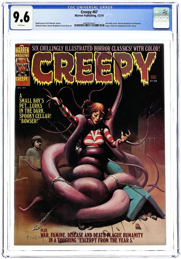 Stories in this issue include: Excerpts from the Year Five! by Budd Lewis and Jose Ortiz; The Haunted Abbey by Budd Lewis and Vicente Alcazar; The Happy Abbey by Budd Lewis and Vicente Alcazar; The Happy Undertaker by Carl Wessler and Martin Salvador; Edgar Allan Poe's The Raven by Richard Corben (in color); Holy War by Budd Lewis and Adolfo Abellan; and Oil of Dog by Jack Butterworth and Isidro Mones (from the story by Ambrose Bierce). Cover art by Ken Kelly. Cover price $1.00.