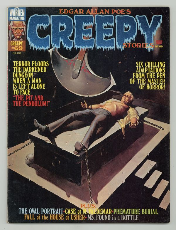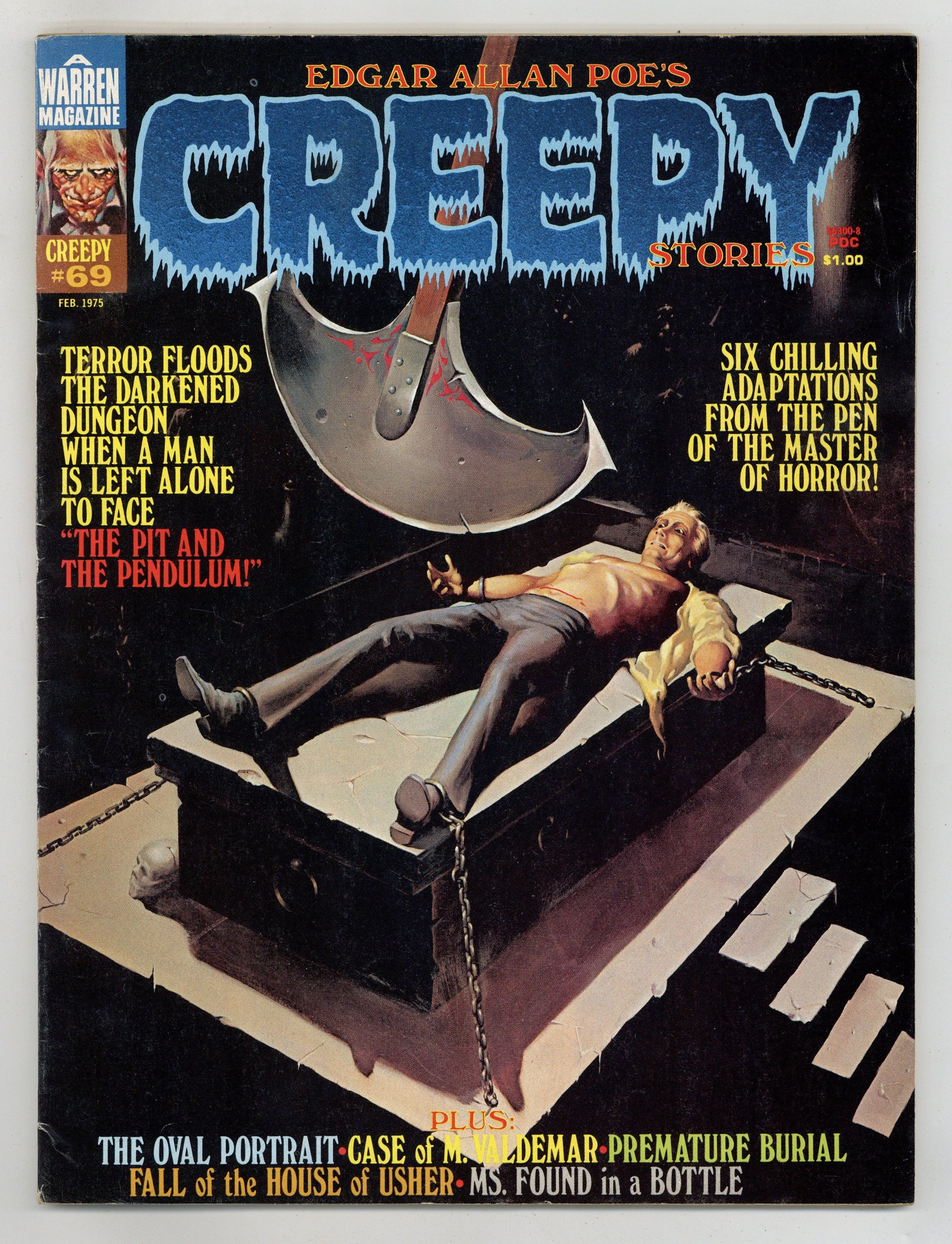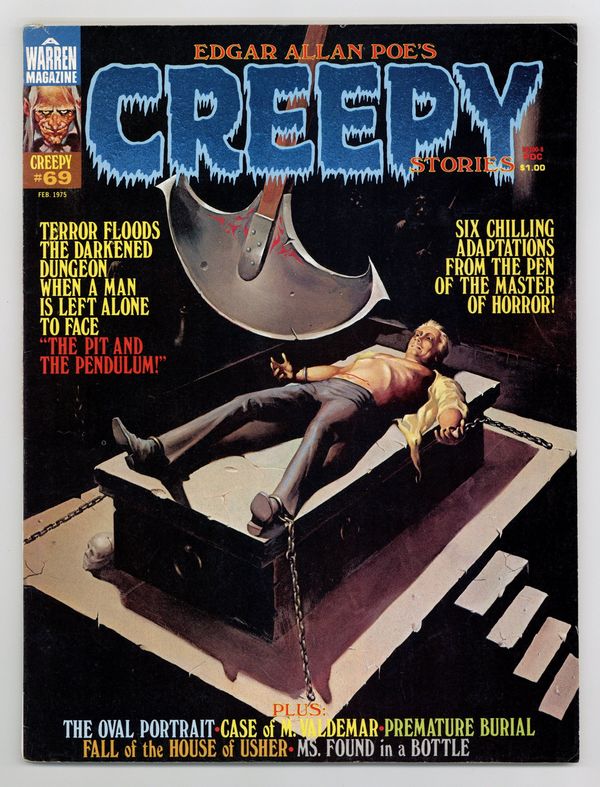 This special Edgar Allan Poe issue includes the following stories: The Pit and the Pendulum by Rich Margopoulos and Jose Ortiz; Premature Burial by Rich Margopoulos and Vicente Alcazar; The Fall of the House of Usher by Rich Margopoulos and Martin Salvador; The Oval Portrait by Rich Margopoulos and Richard Corben; Ms. Found in a Bottle! by Rich Margopoulos and Leo Summers; and Facts in the Case of M. Valdemar by Rich Margopoulos and Isidro Mones. Cover art by Ken Kelly. Cover price $1.00.