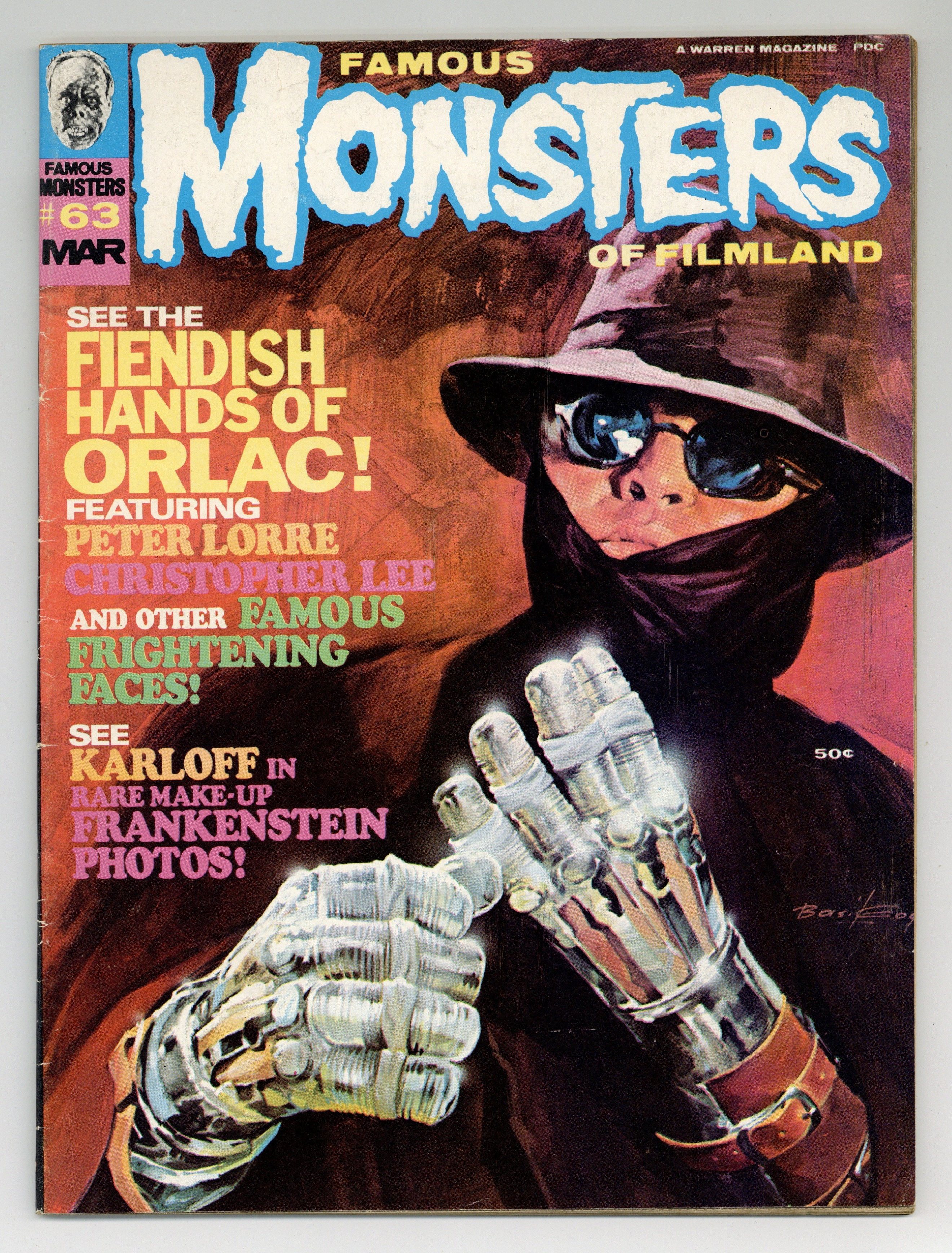 Features in this issue include: a "Mystery Photo" of Boris Karloff's daughter; "The Weird and Wonderful Pictures of Edgar Allan Poe"; "The Many Hands of Orlac" (an article about the various films based on the story); and more. Famed cover artist Basil Gogos painted the striking figure of Peter Lorre from The Hands of Orlac. The back of the mag features an ad for Monster World magazine. Cover price $0.50.