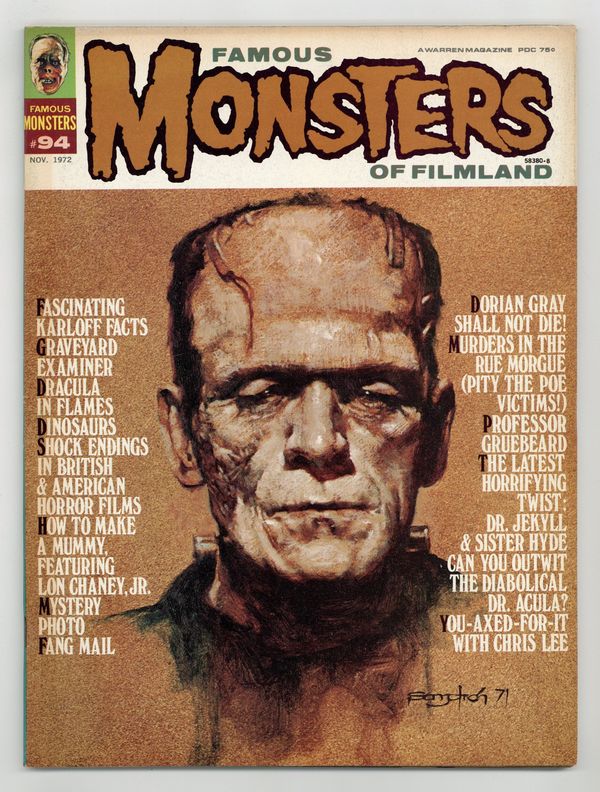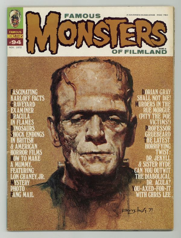$30.00Features in this issue include: an article by Thomas Rogers about surprise endings in horror films; a synopsis of Dr. Jekyll and Sister Hyde; "How to Make a Mummy" reprint; "In the Days of the Dinosaurs" reprint; an overview of the Rue Morgue films; "Fascinating Karloff Facts" reprint; and more. Gracing the cover is a stunning painting of the Frankenstein monster (from Bride of Frankenstein) by Sanjulian. Cover price $0.75.