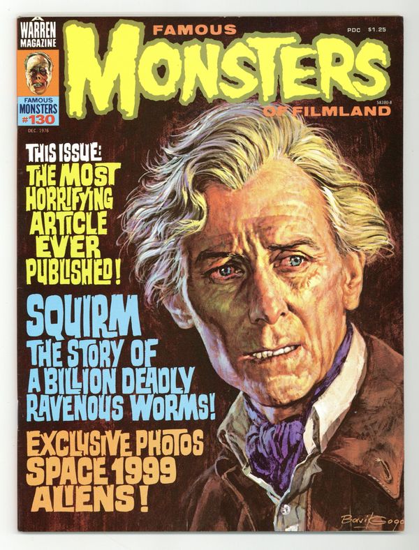 Features in this issue include: filmbook reprint of The Mad Ghoul; Richard Arlen obituary; article by Randy Palmer on gimmickry in film promotion; "The Aliens of Space 1999"; and more. Stunning cover painting of Peter Cushing is by Basil Gogos. Cover price $1.25.