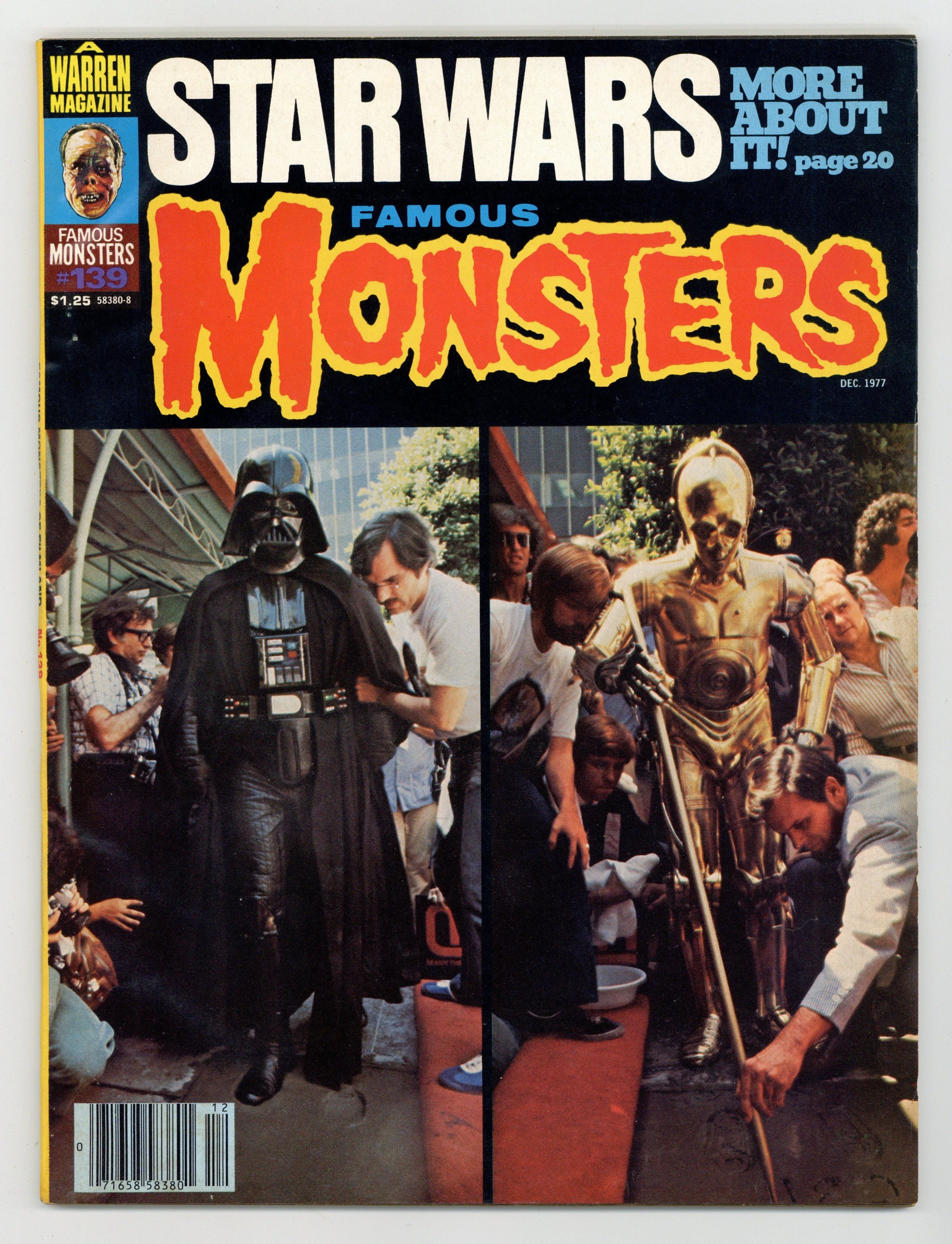 $18.00Features in this issue include: part two of The Fearless Vampire Killers filmbook; Obituaries of Allison Hayes and Ricardo Cortez; article on werewolf lore and myth; feature on The Tribe; speculation on life in outer space; and more. The cover, which is the third one in a row featuring Star Wars, shows Darth Vader and C-3PO immersing their feet in cement outside Mann's Theatre. Cover price $1.25.