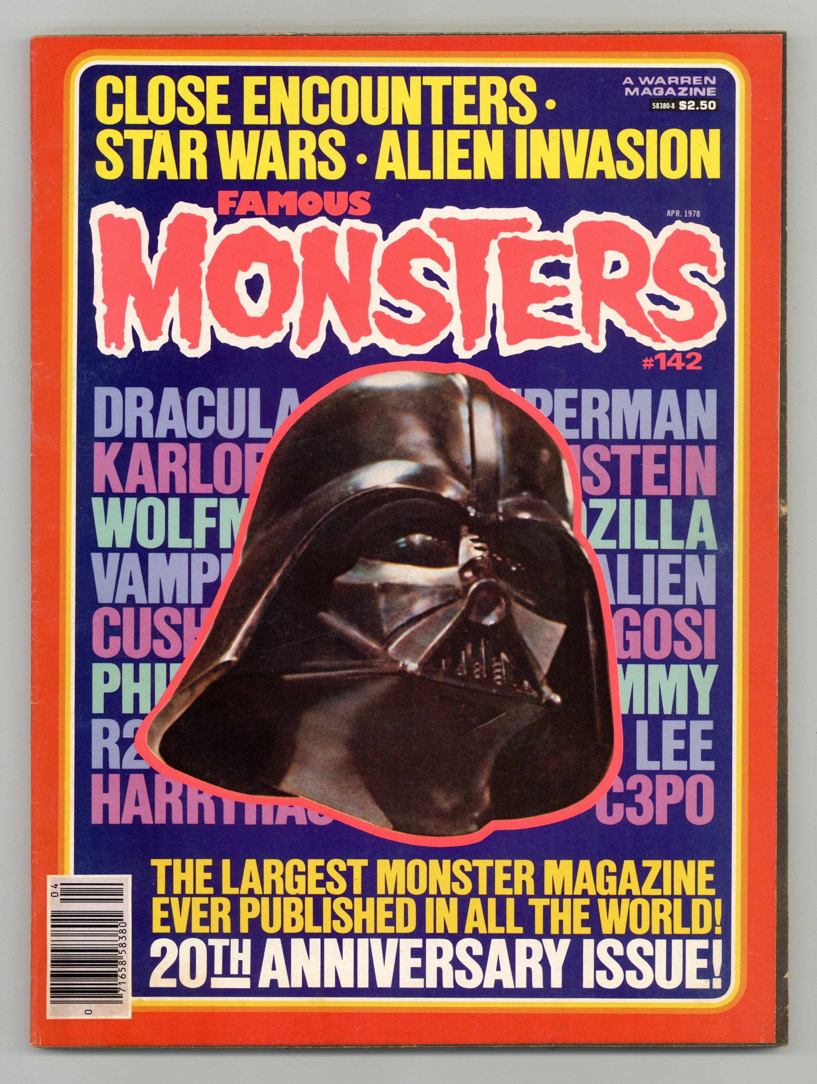 This 20th anniversary issue includes the following: Forry's favorite films from 1958-1977; the story of Samuel Arkoff; Ray Harryhausen tribute by Ray Bradbury; part one of feature on the new Ackermansion; an alphabetical index of FM movie titles or actor names from issues 1-140; article on Star Trek and the possibility of the old crew coming back for more episodes (too bad it didn't happen!); FM publisher Jim Warren's induction into the Horror Hall of Fame; Richard Carlson obituary; celebrities who read FM; and more. Yet another Star Wars cover, this time of Darth Vader's mug before a bunch of film titles. Cover price $2.50.
