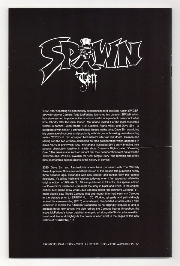 Published Dec 2020 by Aardvark-Vanaheim.$35.00Promotional Edition - Limited to 120 copies. A 48 page deluxe, expanded edition with updated art, new covers, and rarities! Cover by Dave Sim, David Birdsong. Story by Dave Sim. Art by Todd McFarlane, Dave Sim. "Crossing Over!" Guest-starring Cerebus. Todd Mcfarlane's masterful inking style radically changed the aesthetics of comic-books forever. Transforming the 1980s homogeneous bullpen style of the Big 2 to the hyper-dynamic style that dominates the modern era. McFarlane's loose, detailed, energetic art alongside Sims cartoon realism brush and line work highlights the power of each artist in the pages of this new edition of SPAWN No. 10! Still as fresh and relevant today as when it first appeared, Dave Sim and Aardvark-Vanaheim have partnered with The Waverly Press to present Sim's new modified version of this classic tale published nearly three decades ago, expanded with new content and rarities from this comics milestone. While the original edition of SPAWN No. 10 was published in full color, this special edition - at Dave Sims insistence - presents the story in black and white. In the original edition, McFarlane drew what Dave Sim has called the definitive Cerebus (...more people saw Todds Cerebus that one month than had seen my Cerebus in the decade prior to SPAWN No. 10). "Remastered" pages with Dave Sim's new art! Working gingerly and painstakingly around his career-ending (2015) wrist ailment, Sim fulfilled what he calls a last ambition to render the Kitchener Sequence as he originally pictured it. He also redrew the Cerebus figures throughout the issue. B&W. 48pgs.