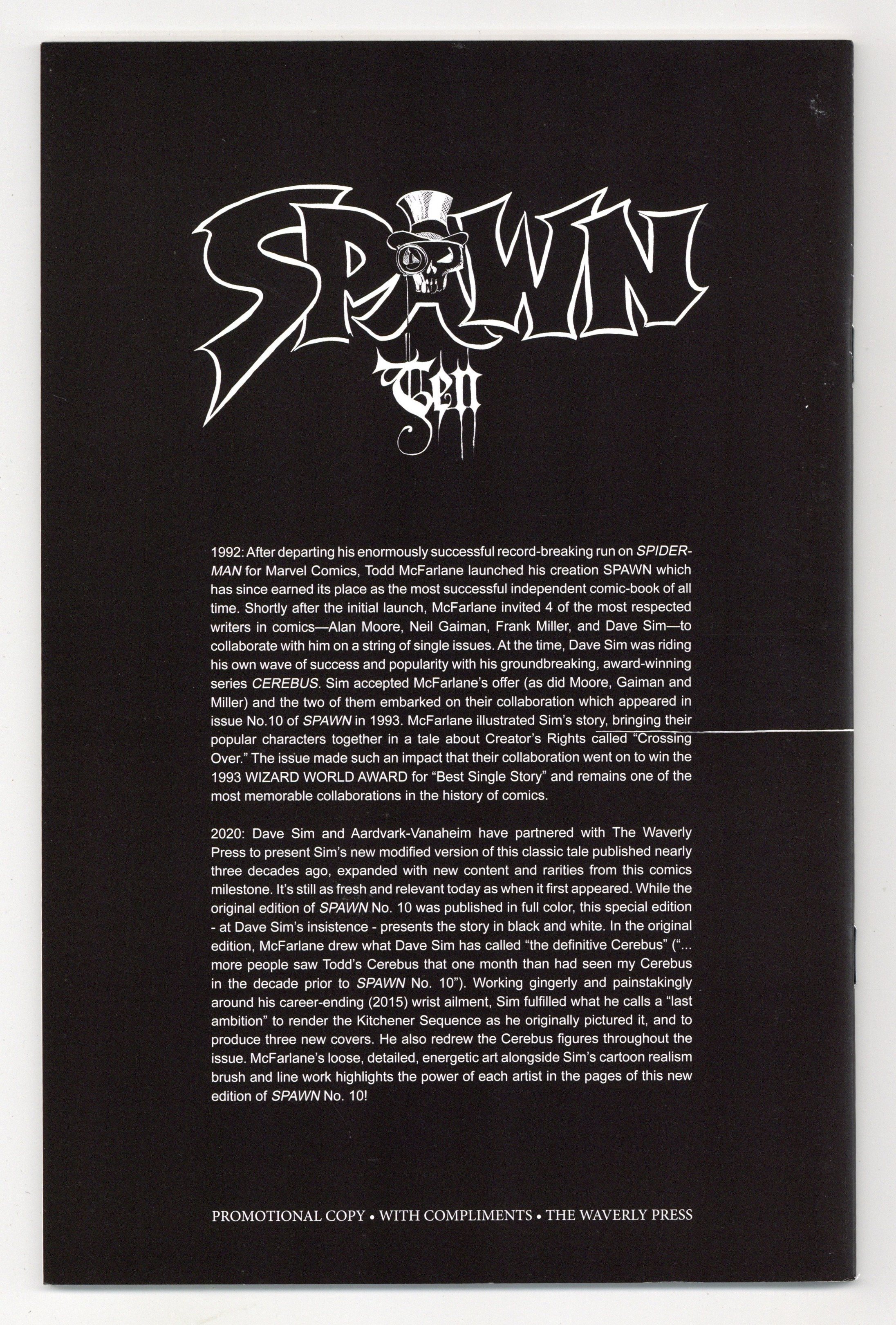 Published Dec 2020 by Aardvark-Vanaheim.$39.00Promotional Edition - Limited to 120 copies. A 48 page deluxe, expanded edition with updated art, new covers, and rarities! Cover by Dave Sim, David Birdsong. Story by Dave Sim. Art by Todd McFarlane, Dave Sim. "Crossing Over!" Guest-starring Cerebus. Todd Mcfarlane's masterful inking style radically changed the aesthetics of comic-books forever. Transforming the 1980s homogeneous bullpen style of the Big 2 to the hyper-dynamic style that dominates the modern era. McFarlane's loose, detailed, energetic art alongside Sims cartoon realism brush and line work highlights the power of each artist in the pages of this new edition of SPAWN No. 10! Still as fresh and relevant today as when it first appeared, Dave Sim and Aardvark-Vanaheim have partnered with The Waverly Press to present Sim's new modified version of this classic tale published nearly three decades ago, expanded with new content and rarities from this comics milestone. While the original edition of SPAWN No. 10 was published in full color, this special edition - at Dave Sims insistence - presents the story in black and white. In the original edition, McFarlane drew what Dave Sim has called the definitive Cerebus (...more people saw Todds Cerebus that one month than had seen my Cerebus in the decade prior to SPAWN No. 10). "Remastered" pages with Dave Sim's new art! Working gingerly and painstakingly around his career-ending (2015) wrist ailment, Sim fulfilled what he calls a last ambition to render the Kitchener Sequence as he originally pictured it. He also redrew the Cerebus figures throughout the issue. B&W. 48pgs.