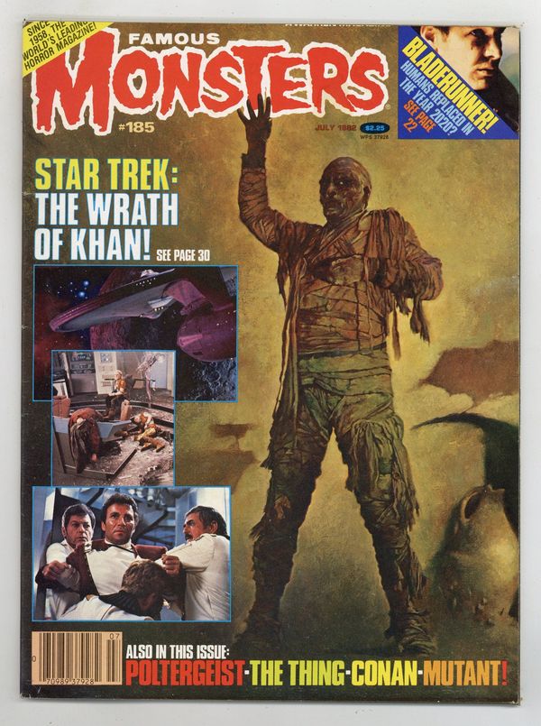 $15.00Features in this issue include: previews of Bladerunner, Poltergeist, The Thing, The Wrath of Khan, and Conan the Barbarian; article on friendly film aliens; overview of The Mutant; feature on Alex Gordon; and more. Cover painting is of Lon Chaney Jr. as Kharis the Mummy; photos are from Star Trek II. Cover price $2.00.
