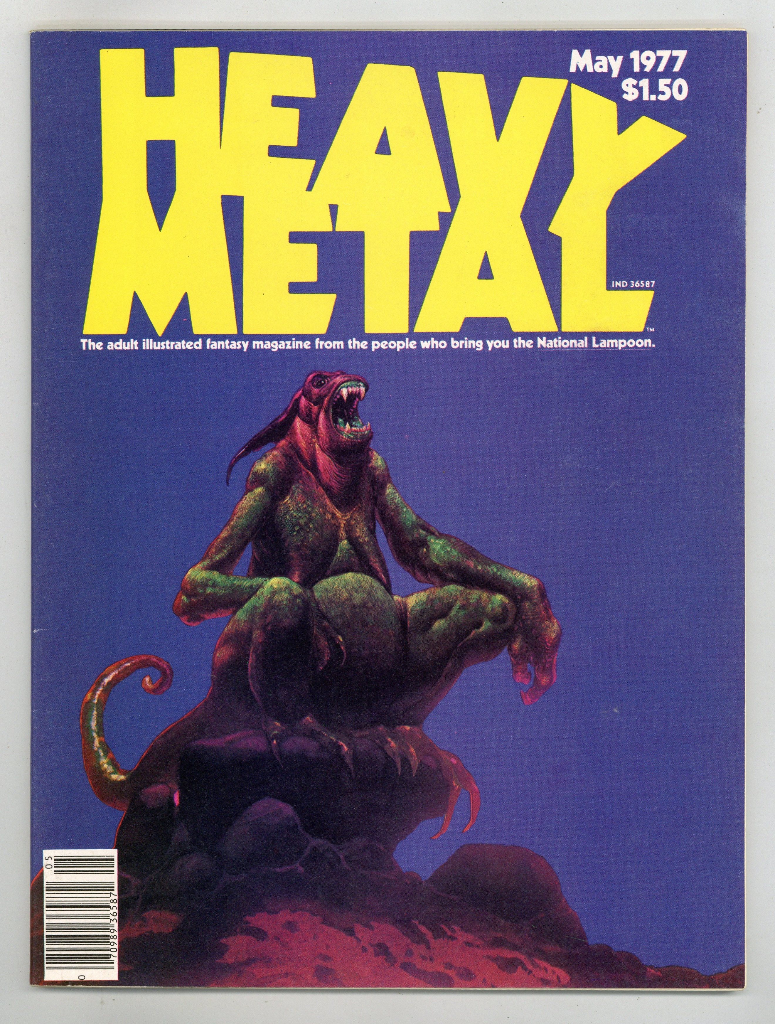 Published May 1977 by HM Communications.$25.00Rich Corben, Moebius, & Bode art May 1977, issue 2. Dubbed "The adult illustrated fantasy magazine," Heavy Metal also publishes tales of horror, science fiction, and adventure. This second issue includes the following stories: MEAOBbIN MECRU by Tardi; The Adventures of Yriss by Druillet and Alexis; Sunpot by Vaughn Bodé; Agorn by Druillet; 1996 by Montellier; Den by Richard Corben; Age of Ages by Rubington; Conquering Armies by Dionnet and Gal; Roger by Locquet and Souchu; The Star-Death of Margaret Omali by James Tiptree Jr.; Virgo by Caza; Harzak by Moebius; and Festival by Picaret and Baret. Cover art by Moebius. Cover price $1.50.