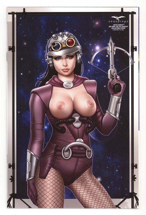 May The 4th Topless Cosplay Collectible cover by Keith Garvey - Limited to 100 copies. Written by Lou Iovino. Art by Vicente Cifuentes. Van Helsing is heading to Los Angeles with every intention of soaking up the sun for a much-needed vacation. But, not even a trip to the west coast can be easy for the famed vampire hunter, as a new team of steam-powered villains are going to do their part to cut this trip short. Liesel will have to use every trick in her book to stand a chance against this new threat! 40 pages, full color. Rated T Cover price $5.99.