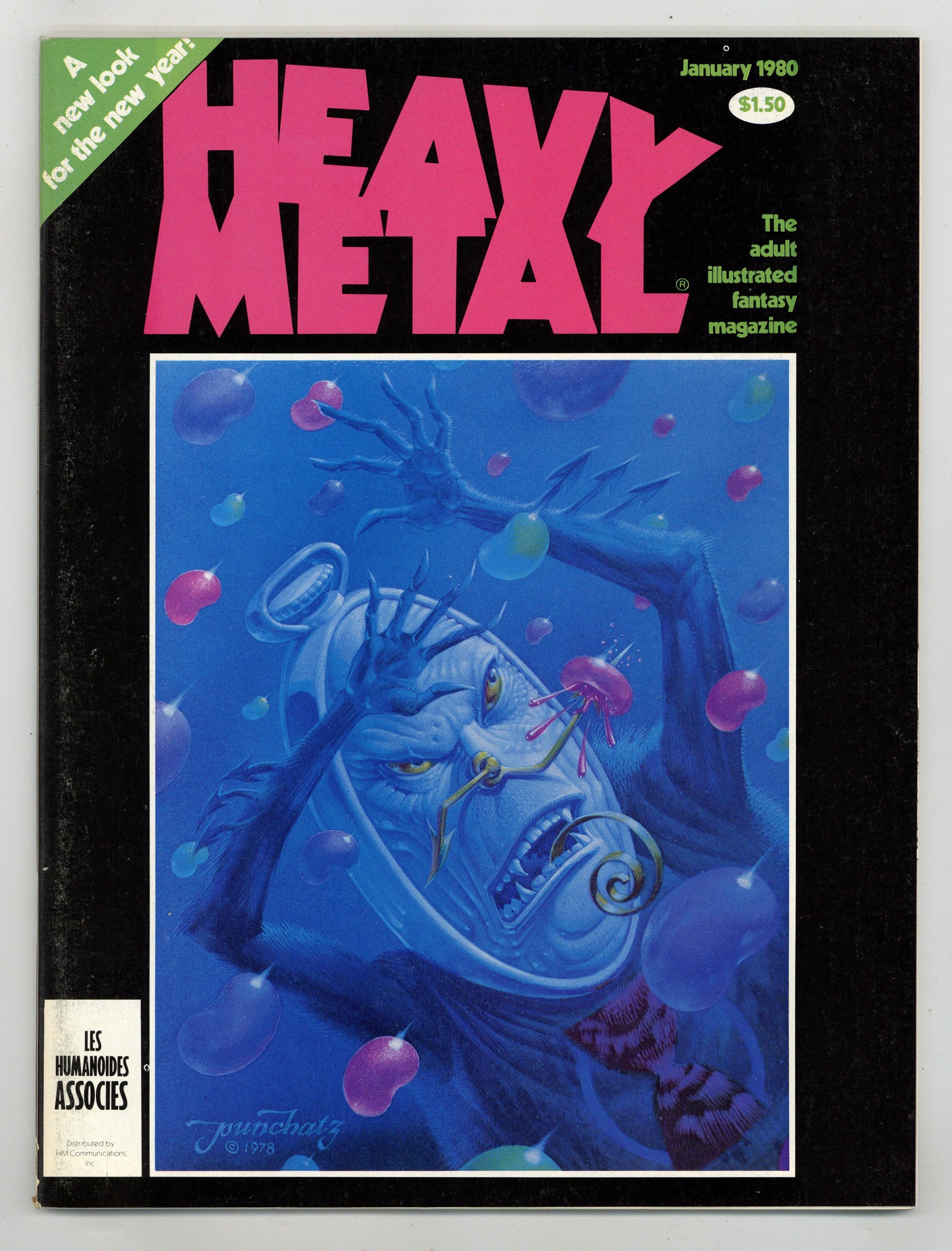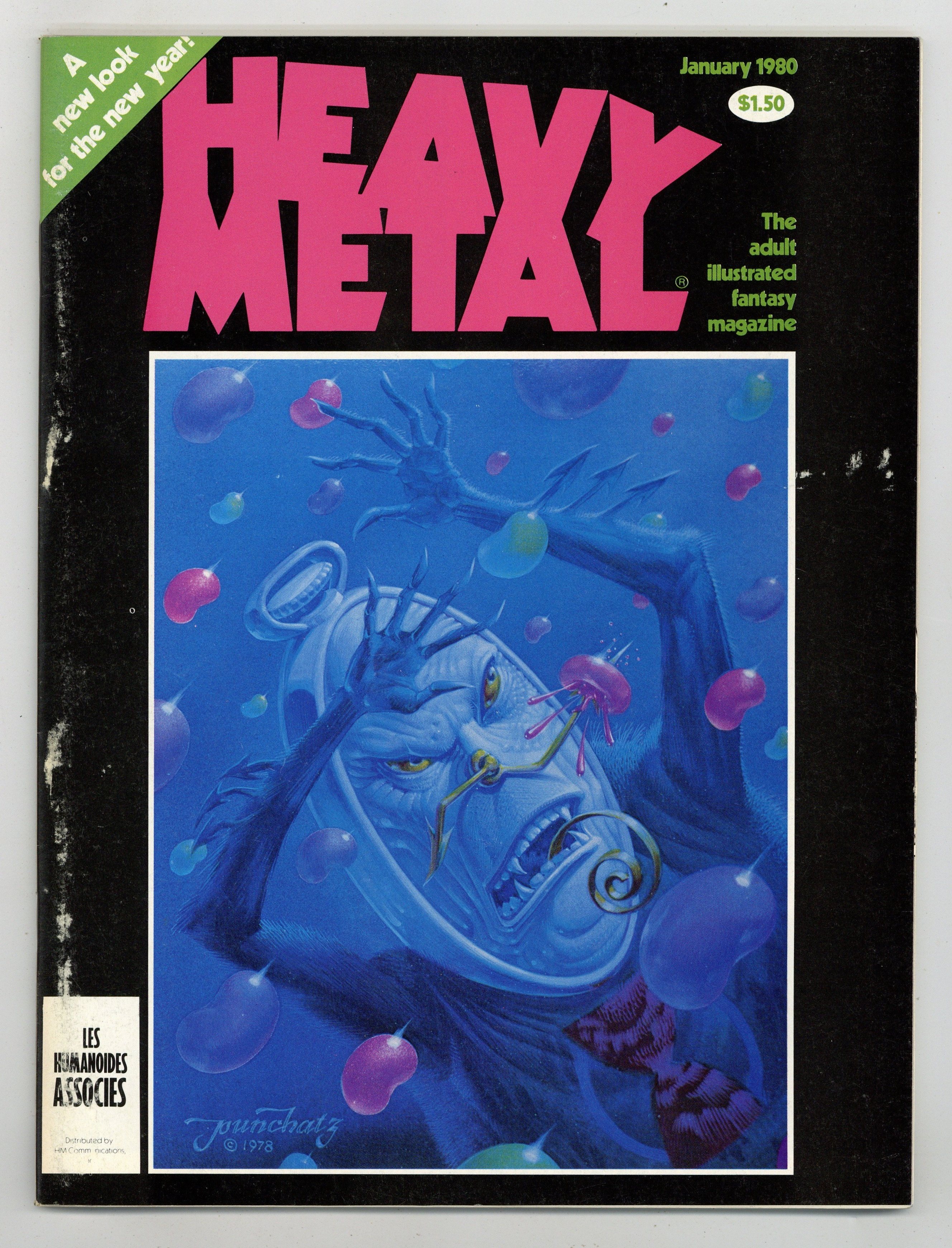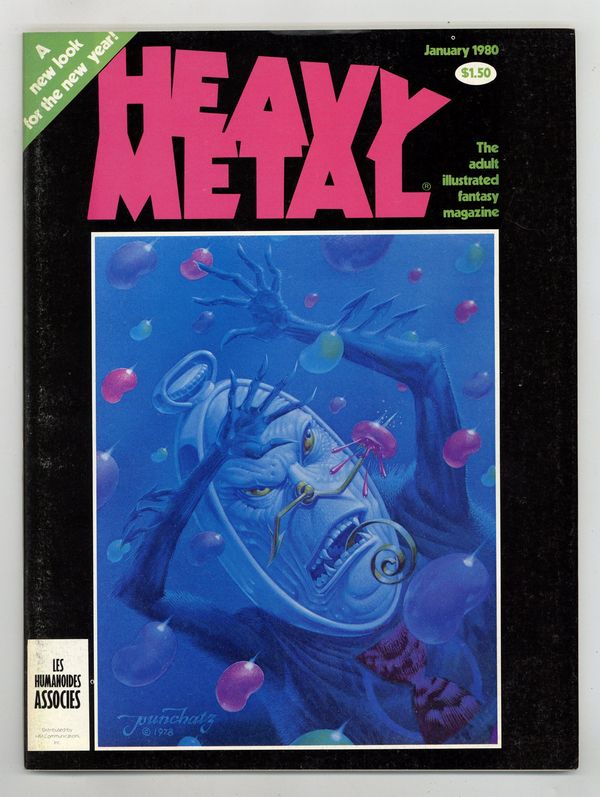 Published Jan 1980 by HM Communications.$13.75The adult illustrated fantasy magazine. Cover art by Don Ivan Punchatz. Michael William Kaluta contents page and intro art. The Story of Rowlf, script and art by Richard Corben. The Pause That Refreshes, script and art by Val Mayerik. Womb with a View, script and art by Dan Steffan. Exit/In, script and art by Neal McPheeters. Paradise Lost, script by John Milto and Terrance Lindall (adaptation), art by Terrance Lindall. Space Race 3000--Stellar Journals, script and art by Karl B. Kofoed. Zooks!, script and art by Vaughn Bode. The Swords of Heaven, the Flowers of Hell--Gallery Section: New Books, script and art by Howard Chaykin. Food for the Children, script and art by Arthur Suydam. Alien Comix Presents, script and art by Rick Veitch. Shoot Out at the Fantasy Factory, script by Trey Aven, art by Stephen Hill. Hive, script and art by Paul Kirchner. Jan, 1980, issue 34. 100 pgs. Cover price $1.50. Cover price $1.50.