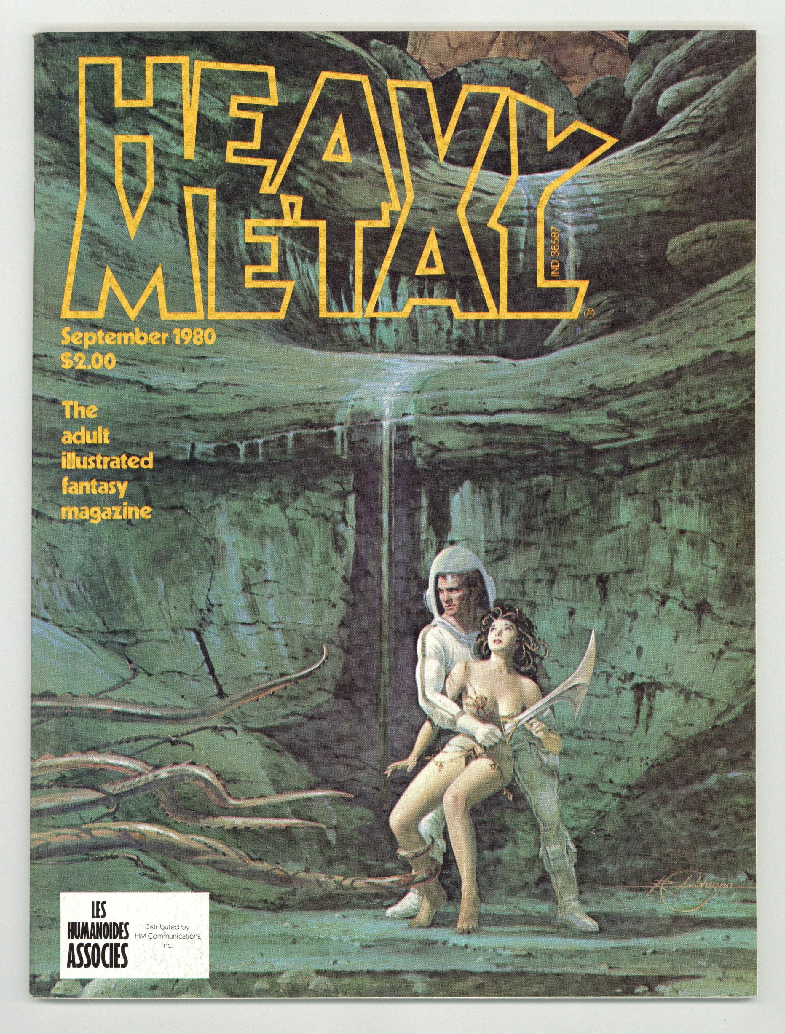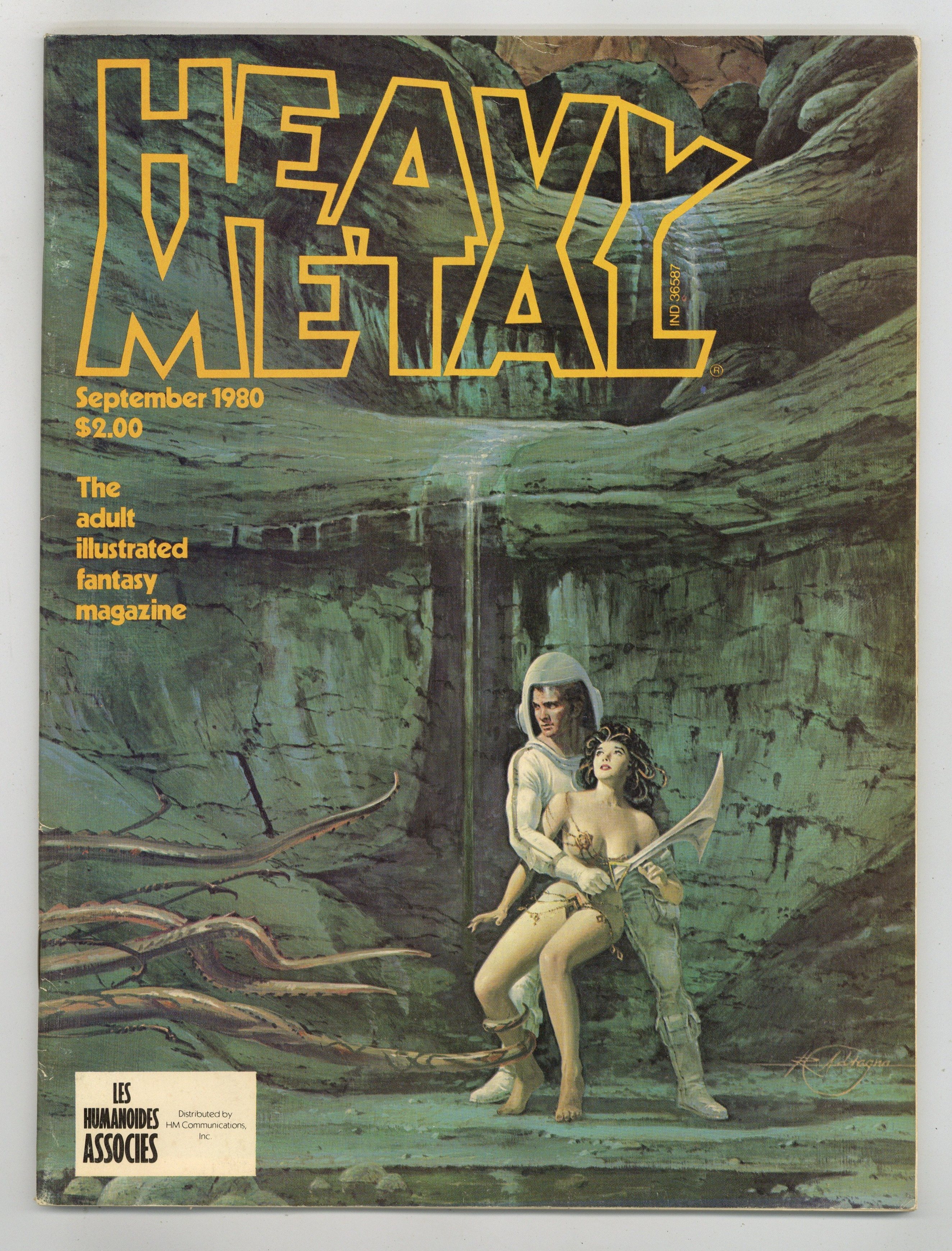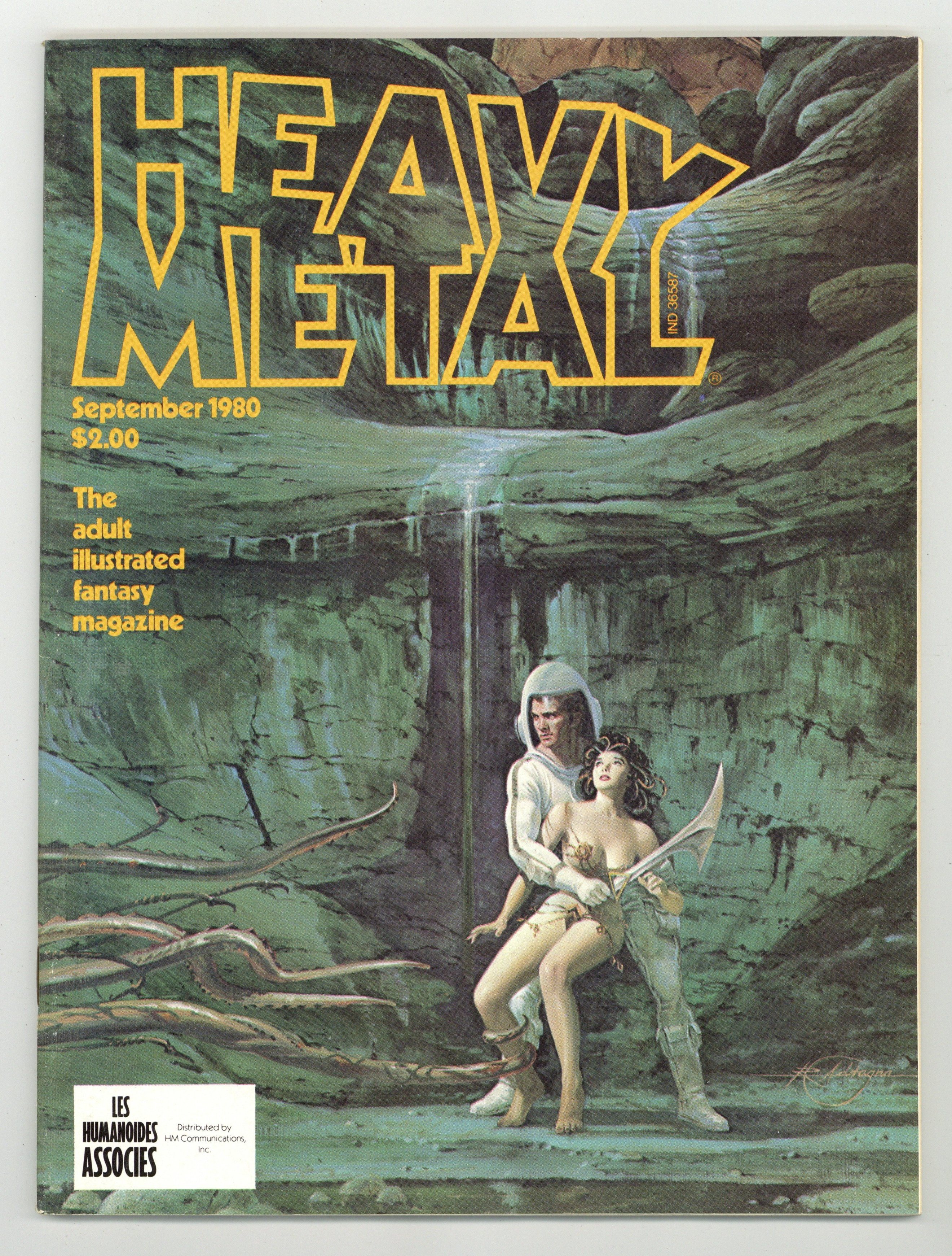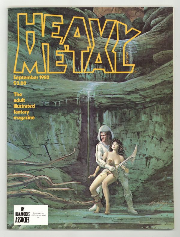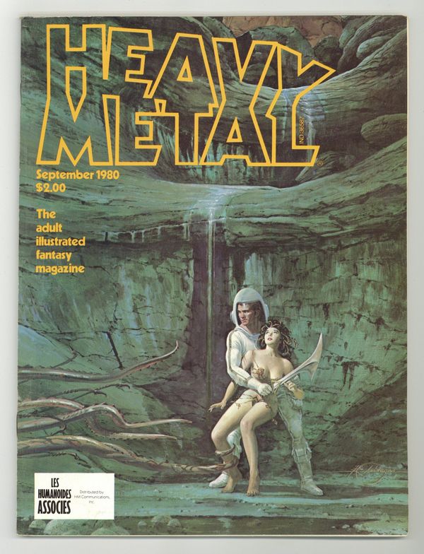 Published Sep 1980 by HM Communications.$12.50Robert Adragna cover September 1980, issue 42. Dubbed "The adult illustrated fantasy magazine," Heavy Metal also publishes tales of horror, science fiction, and adventure. This 42nd issue includes the following stories: Salammbo by Druillet; The Alchemist Supreme by Ribera and Godard; Professor Thintwhistle Steve Stiles and Richard Lupoff; The Bus by Paul Kirchner; The World of Fif by Jacques Rochberny; Into the Breach by John Shirley and Leo Duranona; Construction Project by Michael Gross; Zeitgeist by Greg Terpenning and Ernie Colon; Progress by Bilal; Changes by Matt Howarth; Under the Influence of a UFO by Howard Cruse; Rock Opera by Rod Kierkegaard, Jr.; and Shaman by Paul Kirchner. Includes a letter by Barry Malzberg and an interview with Druillet. Cover art by Robert Adragna. Back cover art by Berni Wrightson. Cover price $2.00.