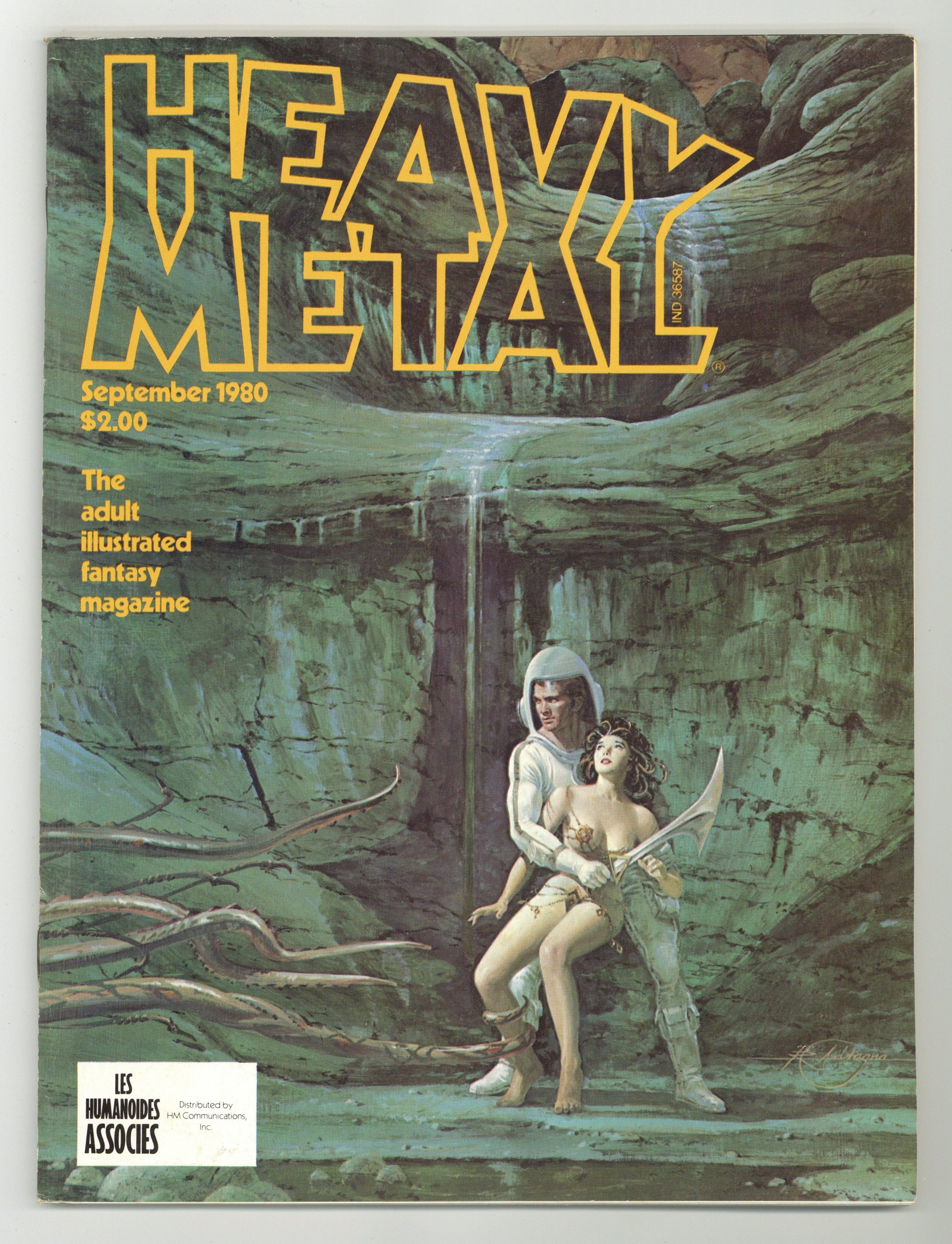 Published Sep 1980 by HM Communications.$13.00Robert Adragna cover September 1980, issue 42. Dubbed "The adult illustrated fantasy magazine," Heavy Metal also publishes tales of horror, science fiction, and adventure. This 42nd issue includes the following stories: Salammbo by Druillet; The Alchemist Supreme by Ribera and Godard; Professor Thintwhistle Steve Stiles and Richard Lupoff; The Bus by Paul Kirchner; The World of Fif by Jacques Rochberny; Into the Breach by John Shirley and Leo Duranona; Construction Project by Michael Gross; Zeitgeist by Greg Terpenning and Ernie Colon; Progress by Bilal; Changes by Matt Howarth; Under the Influence of a UFO by Howard Cruse; Rock Opera by Rod Kierkegaard, Jr.; and Shaman by Paul Kirchner. Includes a letter by Barry Malzberg and an interview with Druillet. Cover art by Robert Adragna. Back cover art by Berni Wrightson. Cover price $2.00.