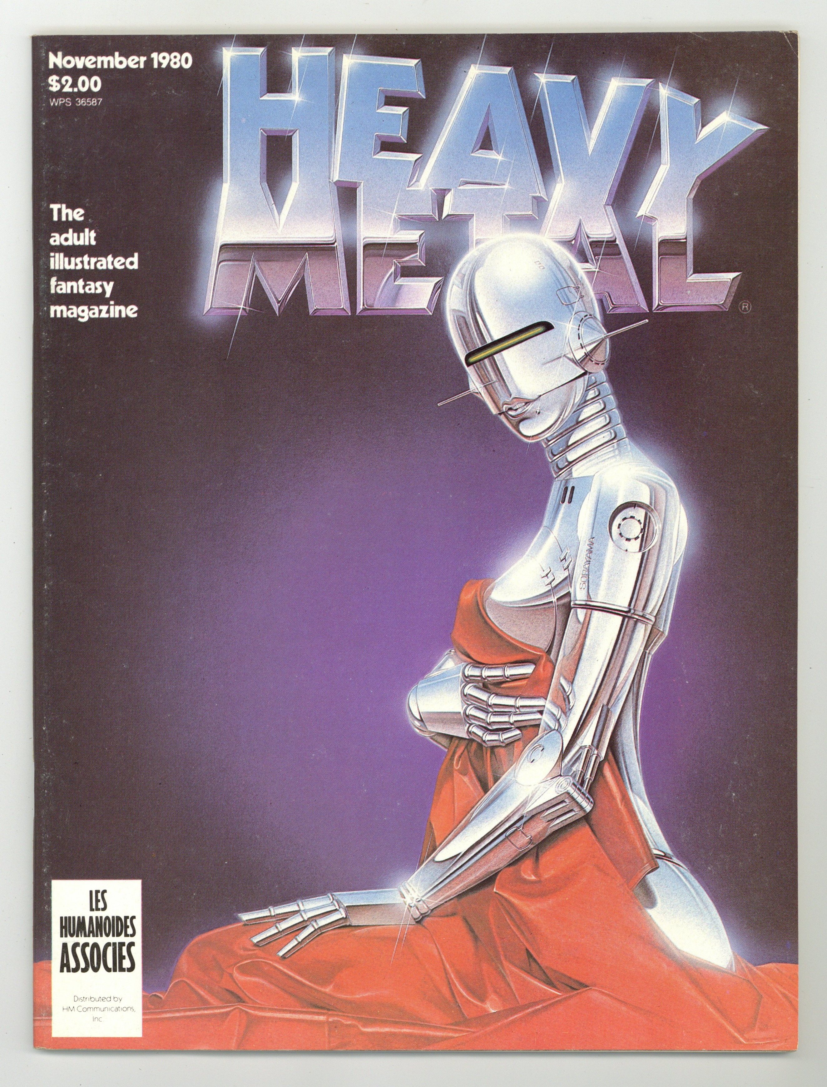 Published Nov 1980 by HM Communications.$20.00Direct Edition. The adult illustrated fantasy magazine. Cover art by Hajime Sorayama (painted). Murk in the Crystal Balls article by Robert Silverberg. Heavy Metal on Film article by Bhob Stewart, art by Mike Ploog. Blind Citadel, script and art by Jean Giraud. Awaken, script and art by Martin Springett. The Bookshelf, script and art by Michael Kaluta (one page). The Rub (part two), script and art by Matt Howarth. Sans Family, script and art by Nicole Claveloux. Metropolitan Opera, script and art by Philippe Cazaumayou [as Caza]. The Prophet and the Dictator, script and art by P. Poirier. Little Tiny Comics #3, script and art by Rick Veitch. The Adventures of Professor Thintwhistle and His Incredible Aether Flyer, script by Richard Lupoff, art by Stephen Stiles. Rock Opera, script and art by Rod Kierkegaard, Jr. Red-Beard and the Brain Pirate, script and art by Jean Giraud [as Moebius]. Progress! Conclusion, script by Pierre Christin, art by Enki Bilal. Back cover art by Chris Achilleos. Nov, 1980, issue 44. 100 pgs. Cover price $2.00. Cover price $2.00.