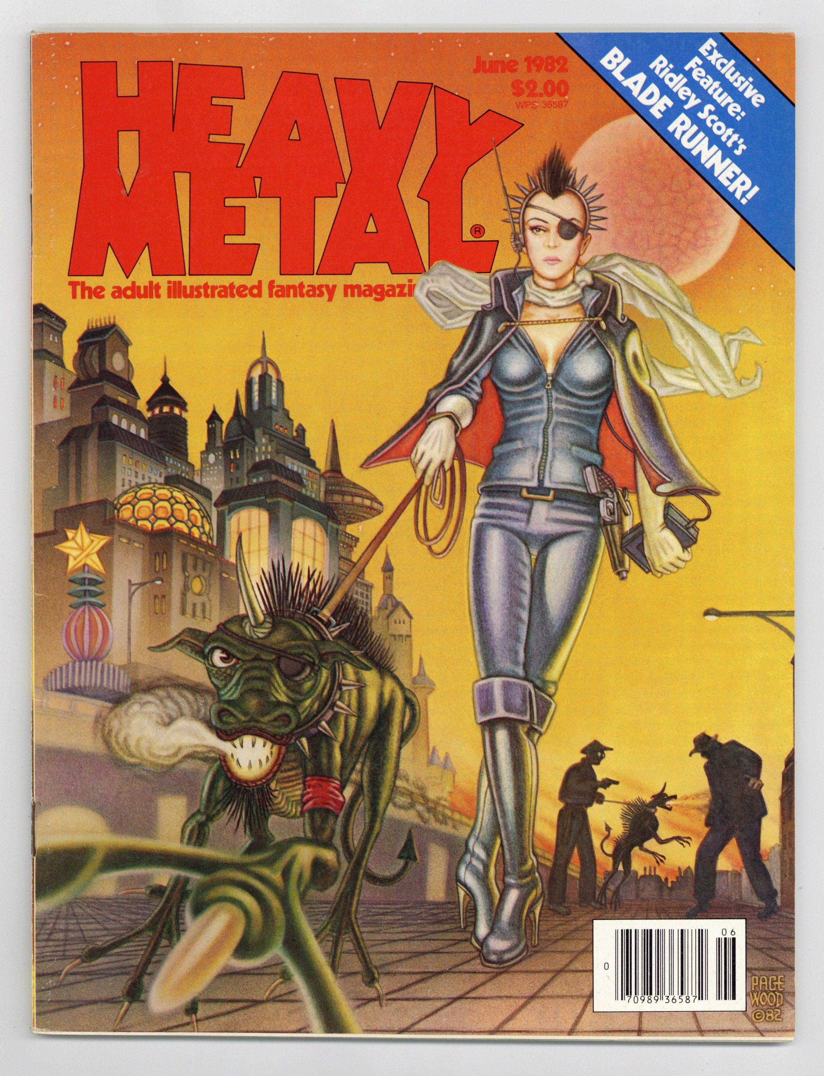 The adult illustrated fantasy magazine. Cover art by Page Wood. Philip K. Dick (1928-1982) article. Tough Guys: A Man Called Hammett article. Emperoratrix--The Incal Light, script by Alexandro Jodorowsky, art by Jean Giraud (as Moebius). Den II, script and art by Richard Corben. At the Middle of Cymbiola, script by Claude Renard, art by Francois Schuiten. I'm Age, script and art by Jeff Jones (one page). Blade Runner: This Is the City article. Little Star in New York, script and art by Ceesepe. A History of America, script and art by Robert Crumb. The Messerschmitt Attack, script and art by Anthony Scibelli. Concorde, script and art by Philippe Cazaumayou (as Caza). The Gladiators, script and art by Al Voss. Nova 2, script and art by Luis Garcia. H.R. Giger's New York City gallery. The Voyage of Those Forgotten, script by Pierre Christin, art by Enki Bilal. Back & Forth, script and art by Marc Hempel (one page). Zora, script and art by Fernando Fernandez. Yragael, script and art by Philippe Druillet. Rock Opera, script and art by Rod Kierkegaard, Jr. June, 1982, issue 63. 100 pgs. Cover price $2.00. Cover price $2.00.