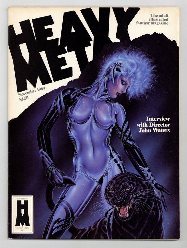 Published Nov 1984 by HM Communications.$19.25Olivia cover, Bilal, Thorne November 1984, issue 92. Dubbed "The adult illustrated fantasy magazine," Heavy Metal also publishes tales of horror, science fiction, and adventure. Issue 92 includes the following stories: Triton by Daniel Torres; A Second Babel by Joost Swarte; The Great Passage by Jeronaton; The Hunting Party by P. Christin and Enki Bilal; The Walls of Samaris by Schuiten; Lann by Frank Thorne; I'm in Love With an Economist! by Salomon and Nicole Claveloux; and Tex Arcana by John Findley. Includes interview with John Waters. Cover art by Olivia. Cover price $2.50.