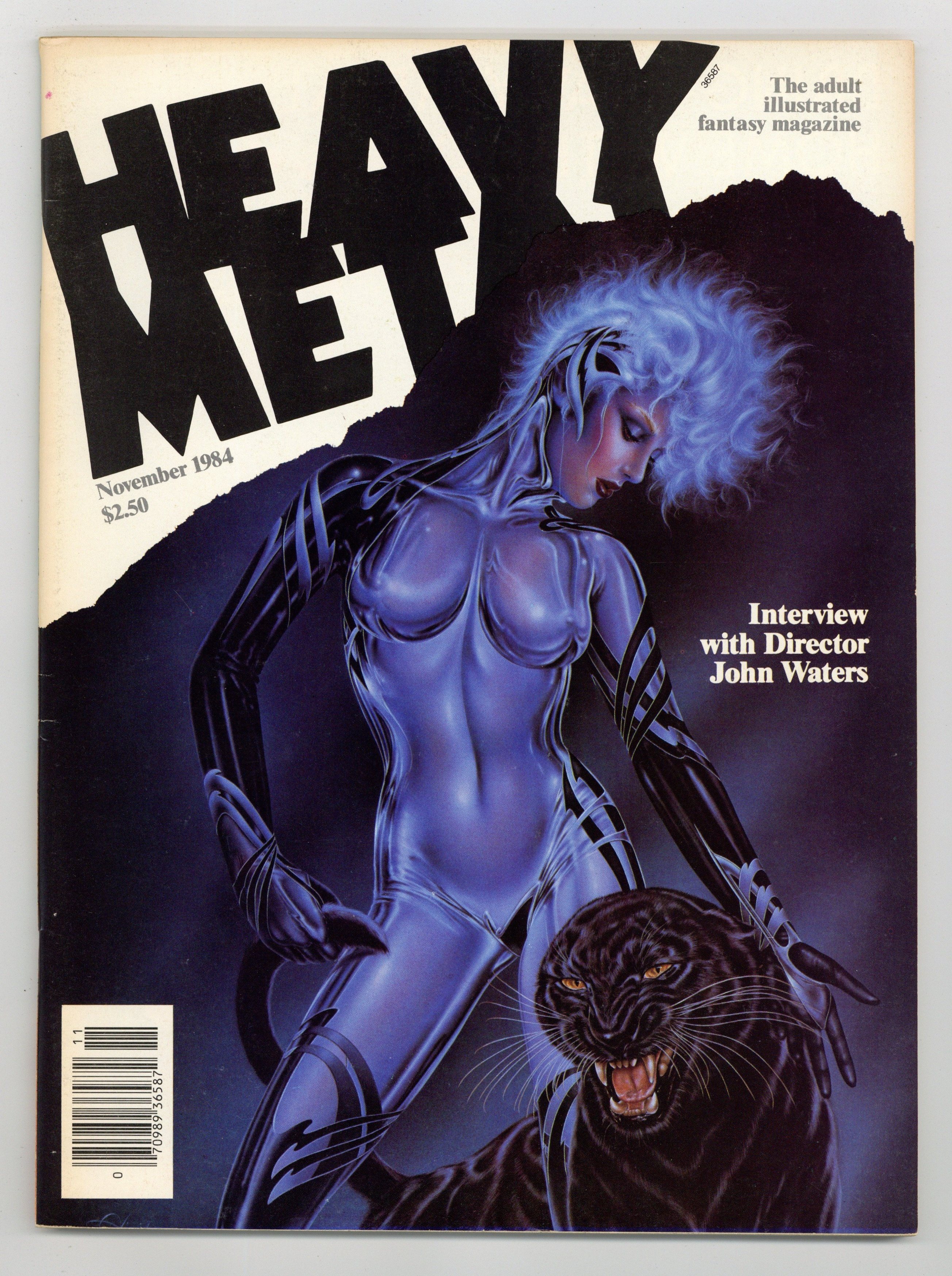 Olivia cover, Bilal, Thorne November 1984, issue 92. Dubbed "The adult illustrated fantasy magazine," Heavy Metal also publishes tales of horror, science fiction, and adventure. Issue 92 includes the following stories: Triton by Daniel Torres; A Second Babel by Joost Swarte; The Great Passage by Jeronaton; The Hunting Party by P. Christin and Enki Bilal; The Walls of Samaris by Schuiten; Lann by Frank Thorne; I'm in Love With an Economist! by Salomon and Nicole Claveloux; and Tex Arcana by John Findley. Includes interview with John Waters. Cover art by Olivia. Cover price $2.50.
