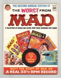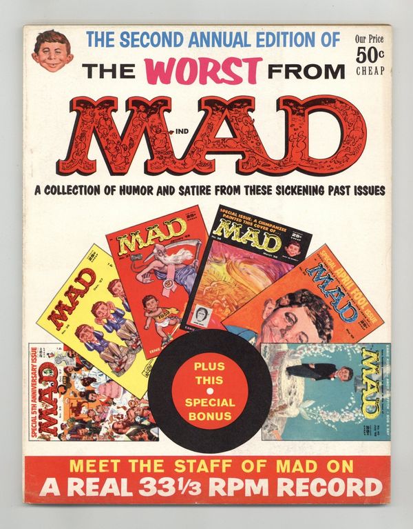 $45.50COMPLETE WITH BONUS: 33 1/3 rpm record entitled "Meet the Staff of Mad". Stories and art by Wally Wood, Reed Crandall, Al Feldstein, Paul Krassner, Don Martin, Paul Laikin, Tom Koch, Albert Meglin, Frank Jacobs, Henry Wadsworth Longfellow, George Mandel, John Putnam, Kelly Freas, Mort Drucker, Bob Clarke, George Woodbridge, Dave Berg, and Joe Orlando. The Worst from Mad was an annual collection of classic material from Mad magazine, with new material attached in the form of posters, stickers and even vinyl recordings. Mad's parody of Better Homes and Gardens magazine, and other stories illustrated by comics legend Wally Wood. Early articles by satirist Paul Krassner, later to gain fame as the publisher of The Realist. A Longfellow poem illustrated by Don Martin. Early pre-"Lighter Side" strips by Dave Berg, and early Don Martin cartoons and art. Includes Bonus Record, a detachable vinyl novelty disk that plays "Meet the Staff of Mad" when played on a phonograph record music player. Report to Russia; Mad Summer Vacation Guide; Mad's College Entrance Exam; Secret Sportalk; The Seaside Incident; Backyard Barbecue; Personalized TV Antennas; Scenes We'd Like to See - The Beast Falls In Love; Sin-Doll Ella by Tennessee Williamsburg; Cowboys 'n Indians; Meet the Staff of Mad; Future Specialized Magazines; Scenes We'd Like to See - The Duel; How to Read Your Palm; The Top Ten Bomb Song Hits; Mad Goes HiFi; If Comic Strip Characters Answered Those Little Ads; Outstanding Americans: Arthur A. Freen; Parking Meters; Distinctive Rejection Slips; Scratchpad Doodles; Home Movies; Mad Eating Utensils; Shakespeare Up-To-Date; Raw Guts - The Magazine for He-Men; TV Movies with Built-In Commercials; How Neurotic Are You?; Mad's Up-To-Date Sky; Scenes We'd Like to See - Tied to the Powder Keg; The Children's Hour by Henry Wadsworth Longfellow; How to Wage Peace; Mike Malice Interviews Mother Goose; Sneaky Advertisements; Scenes We'd Like to See - The Bank Examiner; Bitter Homes and Gardens; Scenes We'd Like to See - The Human Shield; Morris Philip Cigarettes; Sailem Cigarettes. 8.5-in. x 11-in., 96 pages, B&W. Cover price $0.50.