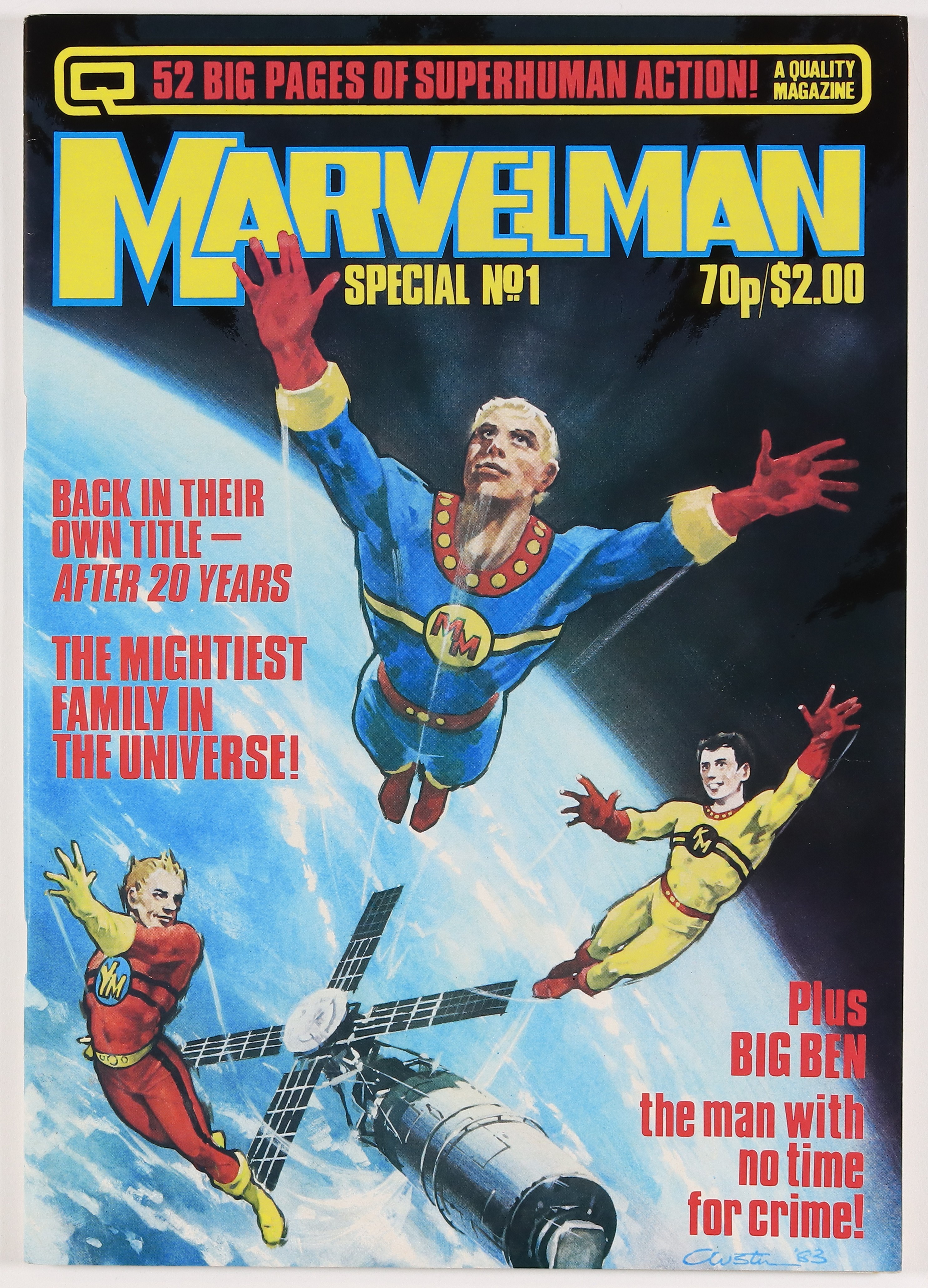Miracleman Family reprints by Mick Anglo, Don Lawrence, and Roy Parker. Stories: "Marvelman Family and the Invaders from the Future," "Marvelman and the Dreams," "The Young Marvelman and the Moon of Doom," and "Marvelman and the Foam Fanatic." Also "Big Ben Versus King Arthur" by Edgar Henry and Ian Gibson. Framing sequence, "Saturday Morning Pictures" by Alan Moore and Alan Davis. Mick Austin cover. 8 1/4-in. x 11 5/8-in., 48 pages; black and white. Cover price $2.00.