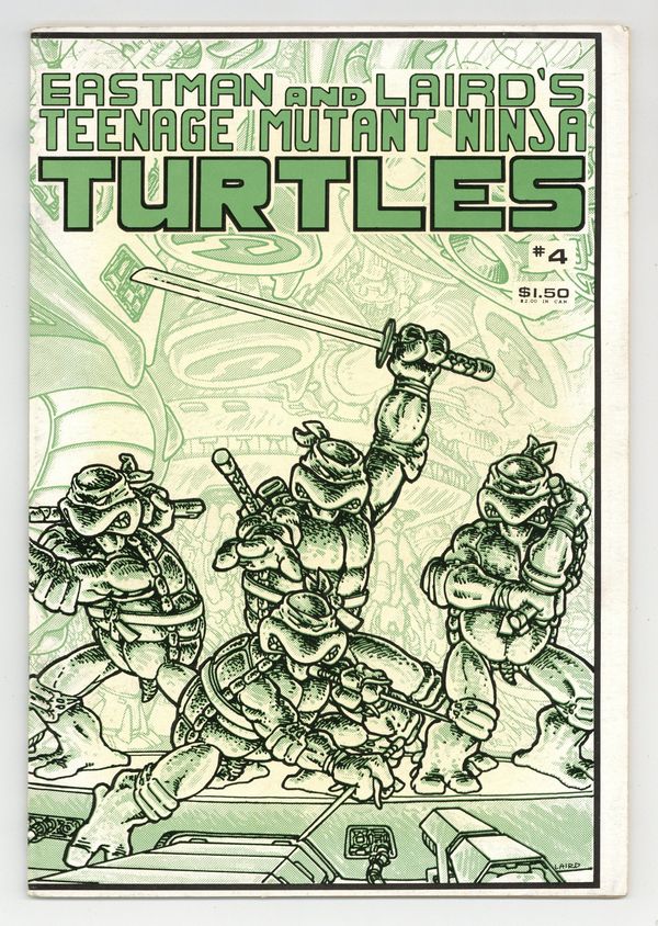 Published 1985 by Mirage Studios.$95.00First printing. According to Overstreet, this issue has one additional printing, which can be identified as such on the inside cover. The original series that introduced the Turtles to the world. Searching for Splinter, the Turtles encounter the alien androids known as the Utroms. Story, art and cover by Kevin Eastman & Peter Laird. Final issue in magazine format; series continues in comic format as Teenage Mutant Ninja Turtles (1985). Black and white; 40 pages. Cover price $1.50.
