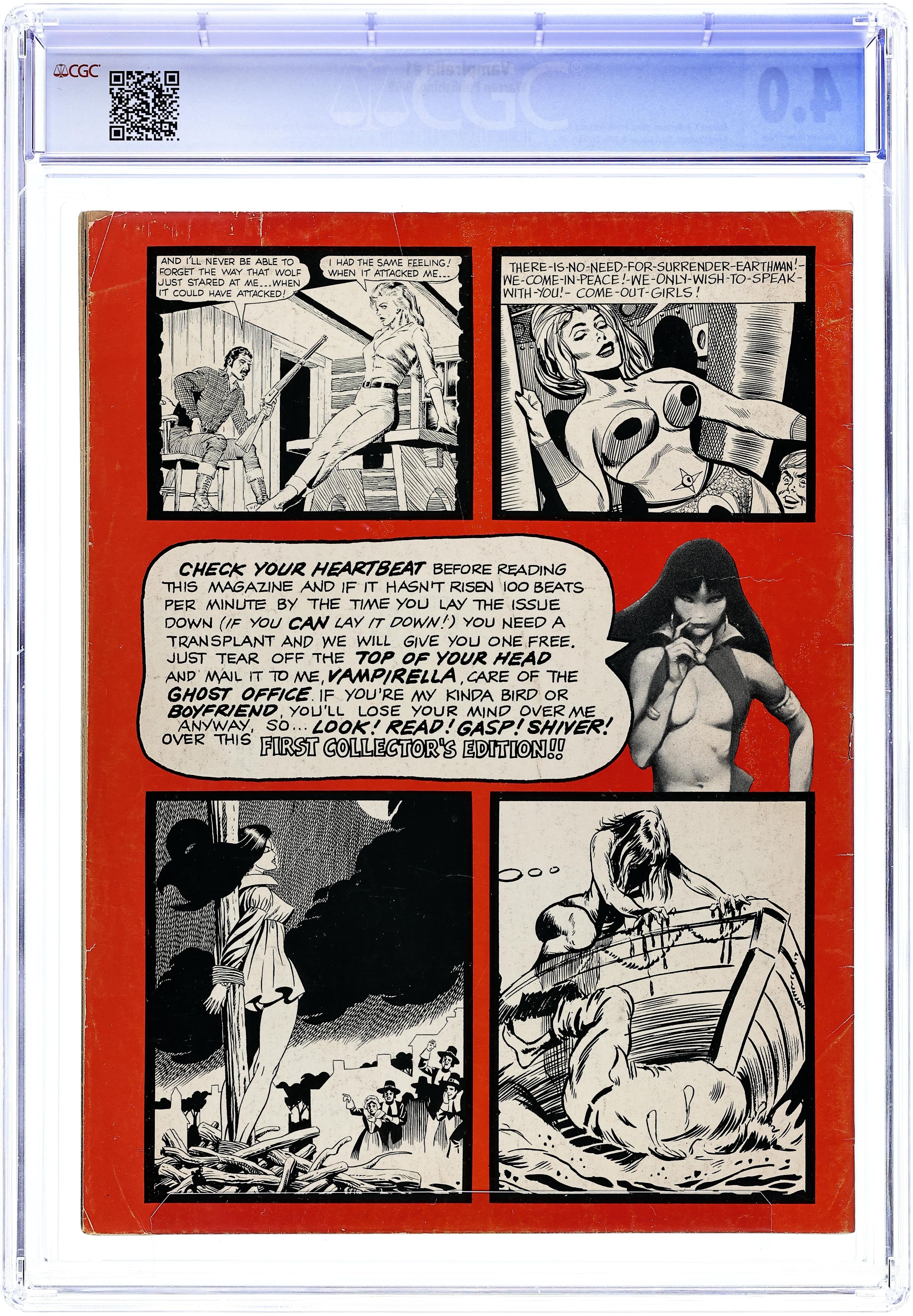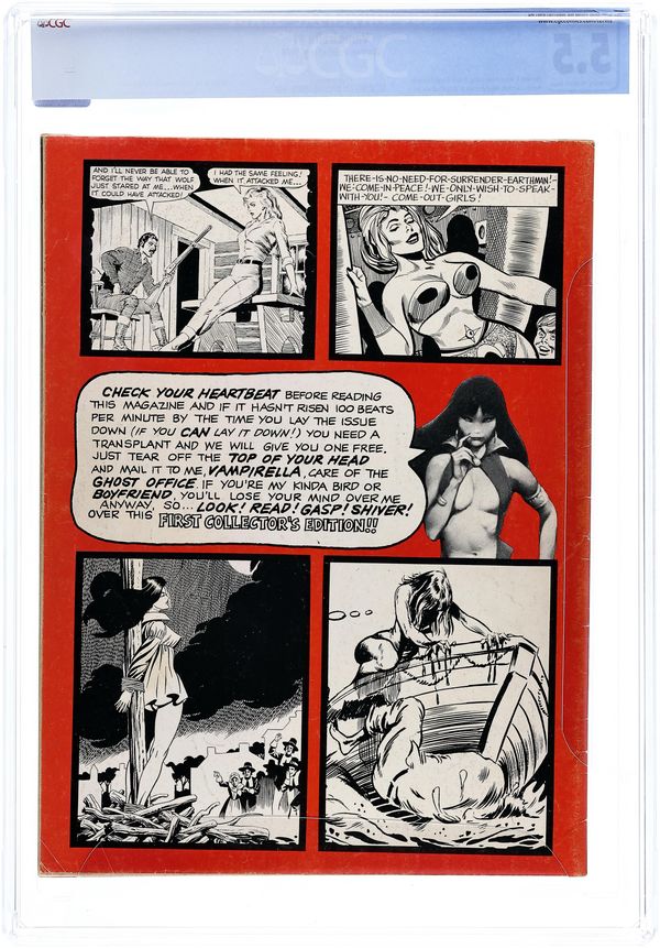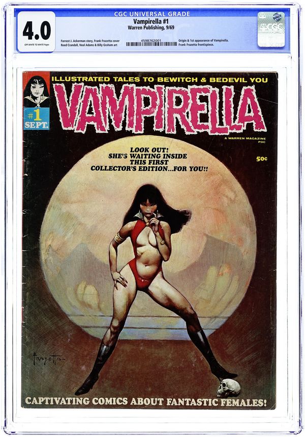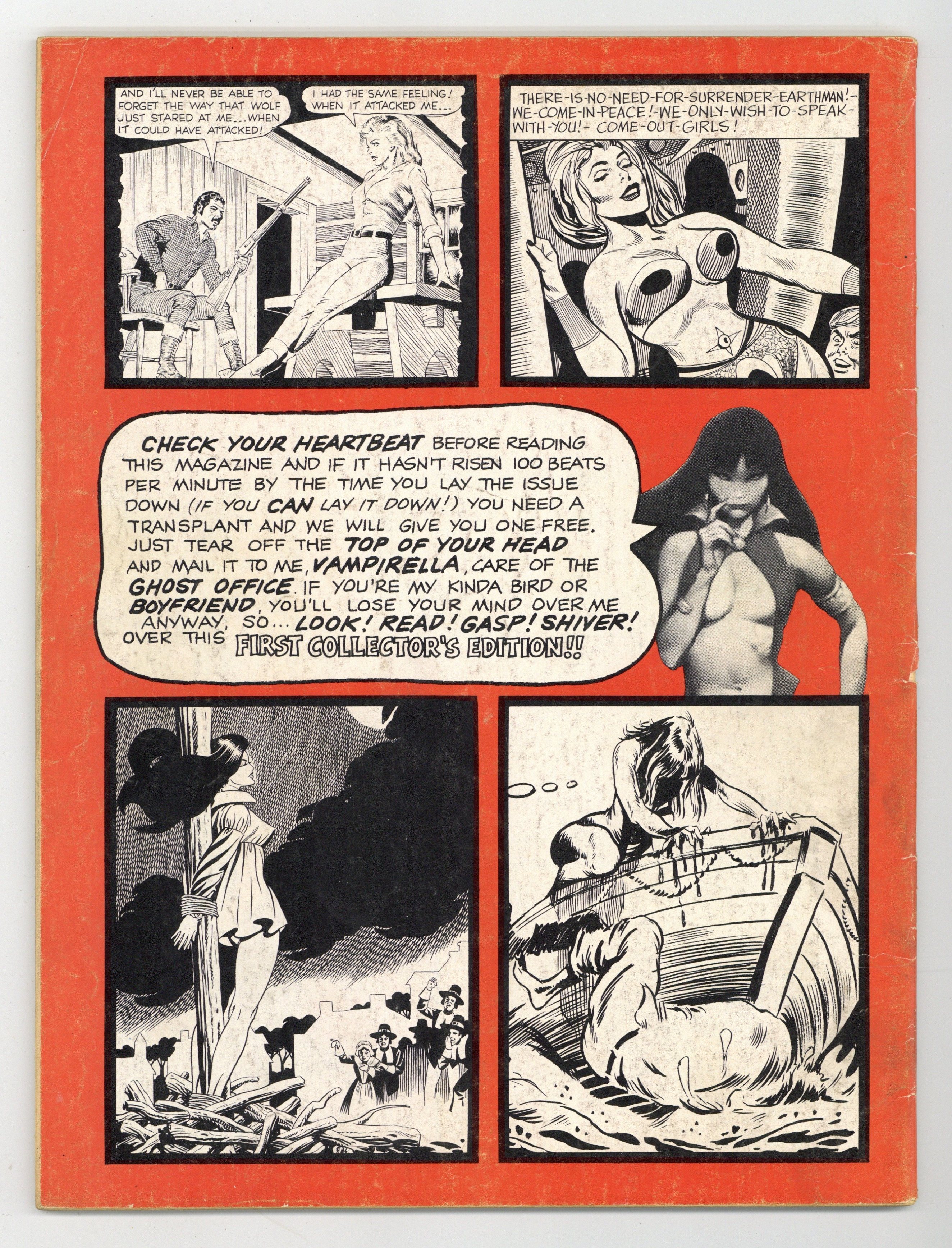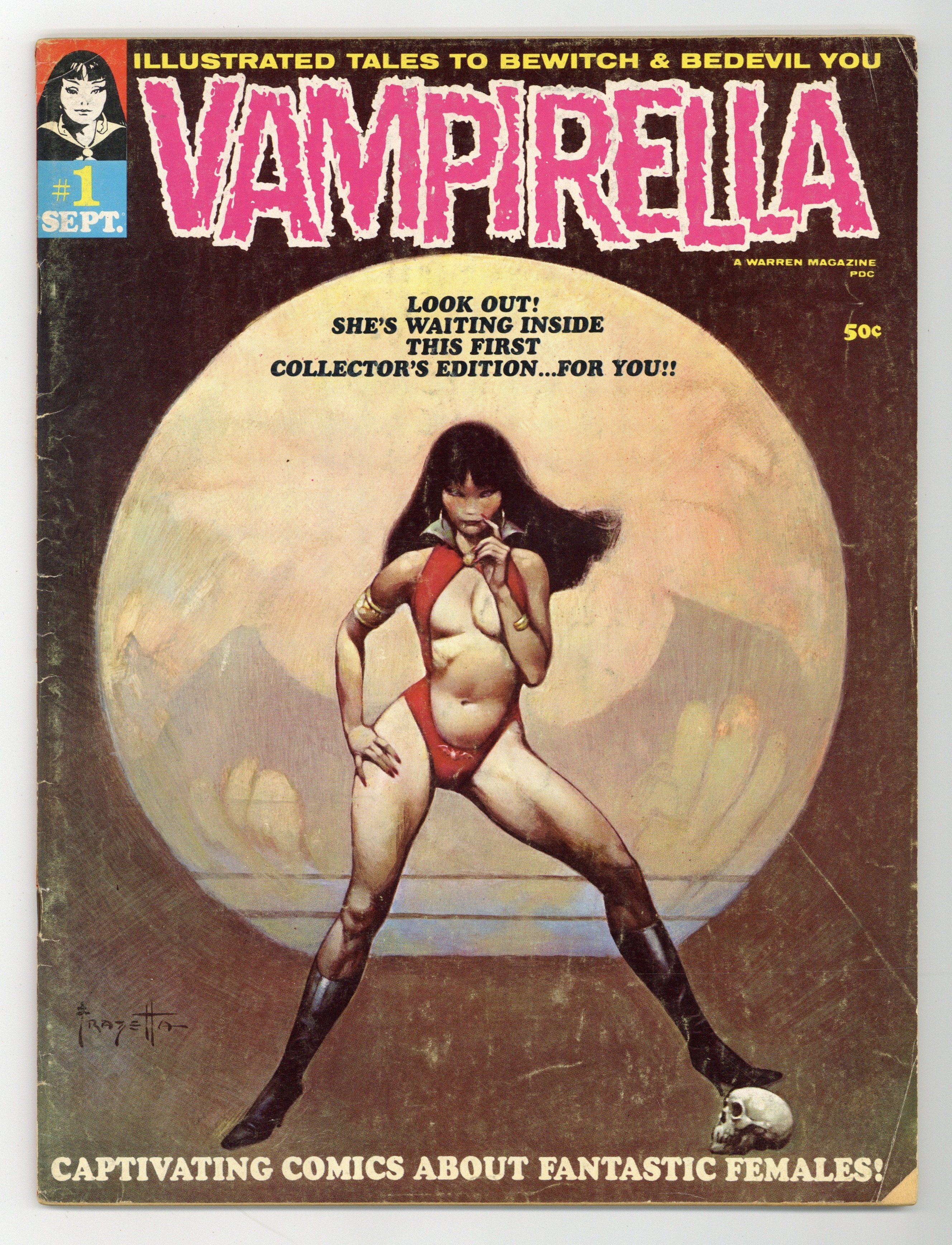 Published by James Warren, who gave fandom Famous Monsters, Eerie, Creepy, and other great magazines, Vampirella is a horror anthology series that featured stories and art by such genre giants as Richard Corben, Neal Adams, Archie Goodwin, Steve Englehart, Don Glut, Wally Wood, and many, many others. This first issue includes the following: "Vampirella's Welcome" by Bill Parente and Frank Frazetta; "Vampirella of Draculon" by Forrest J Ackerman (who had a hand in creating vampi vixen Vampirella) and Tom Sutton; "Death Boat" by Don Glut and Billy Graham; "Two Silver Bullets" by Don Glut and Mike Royer; "Spaced-Out Girls" by Don Glut, Bill Fraccio, and Tony Tallarico; and "Room Full of Changes" by Nicola Cuti and Ernie Colon. Cover art by Frank Frazetta. NOTE: A commemorative edition of this magazine was published in October 2001. It is very similar to the original, but can be easily identified by the $4.95 cover price (original 1969 edition was 50c cover priced), and an indica noting it as the commemorative edition. 68 pages, B&W. Cover price $0.50.