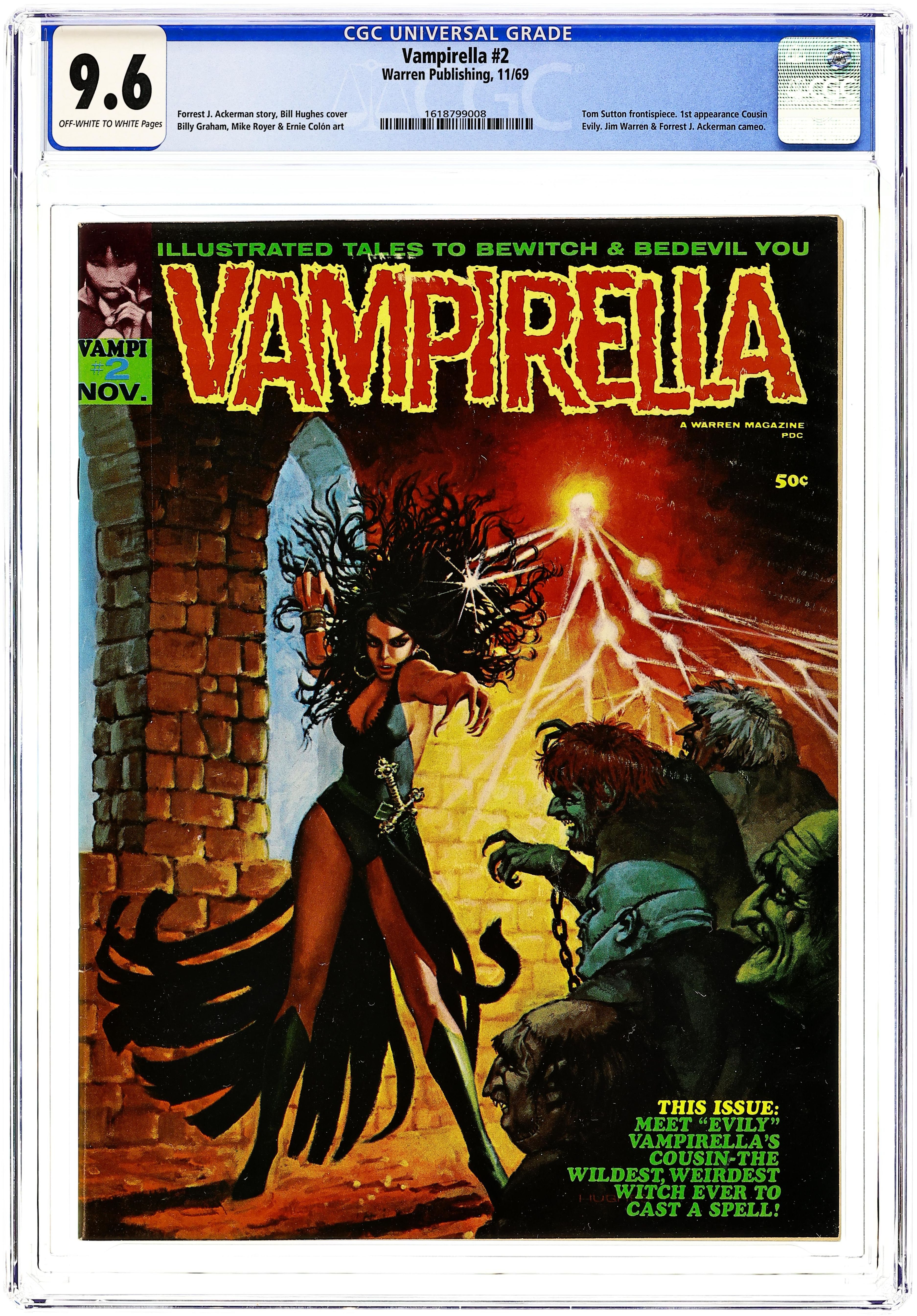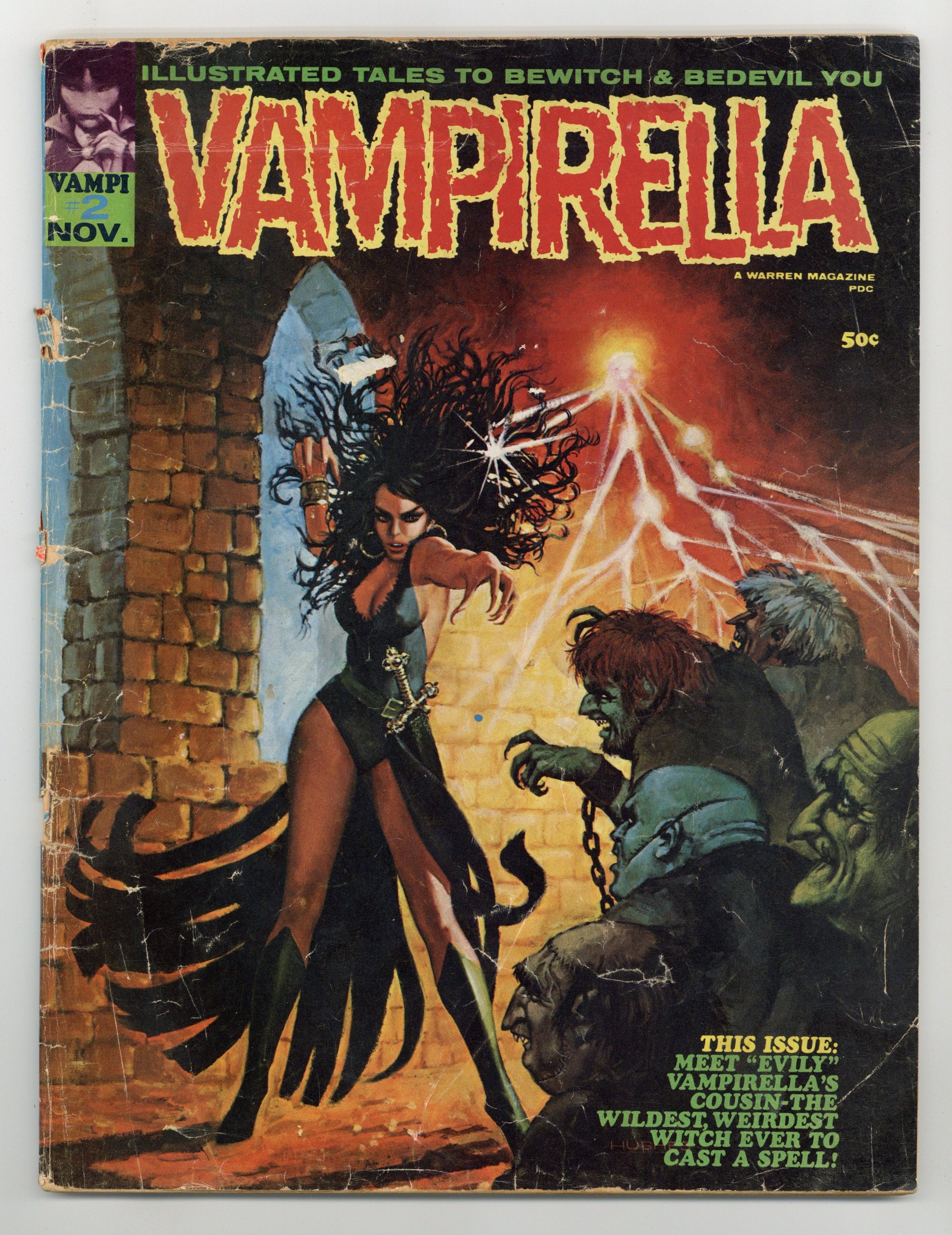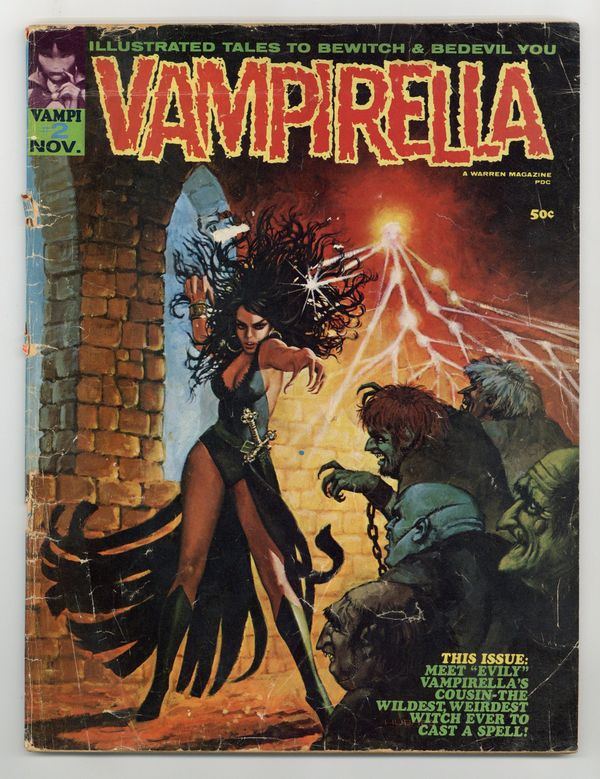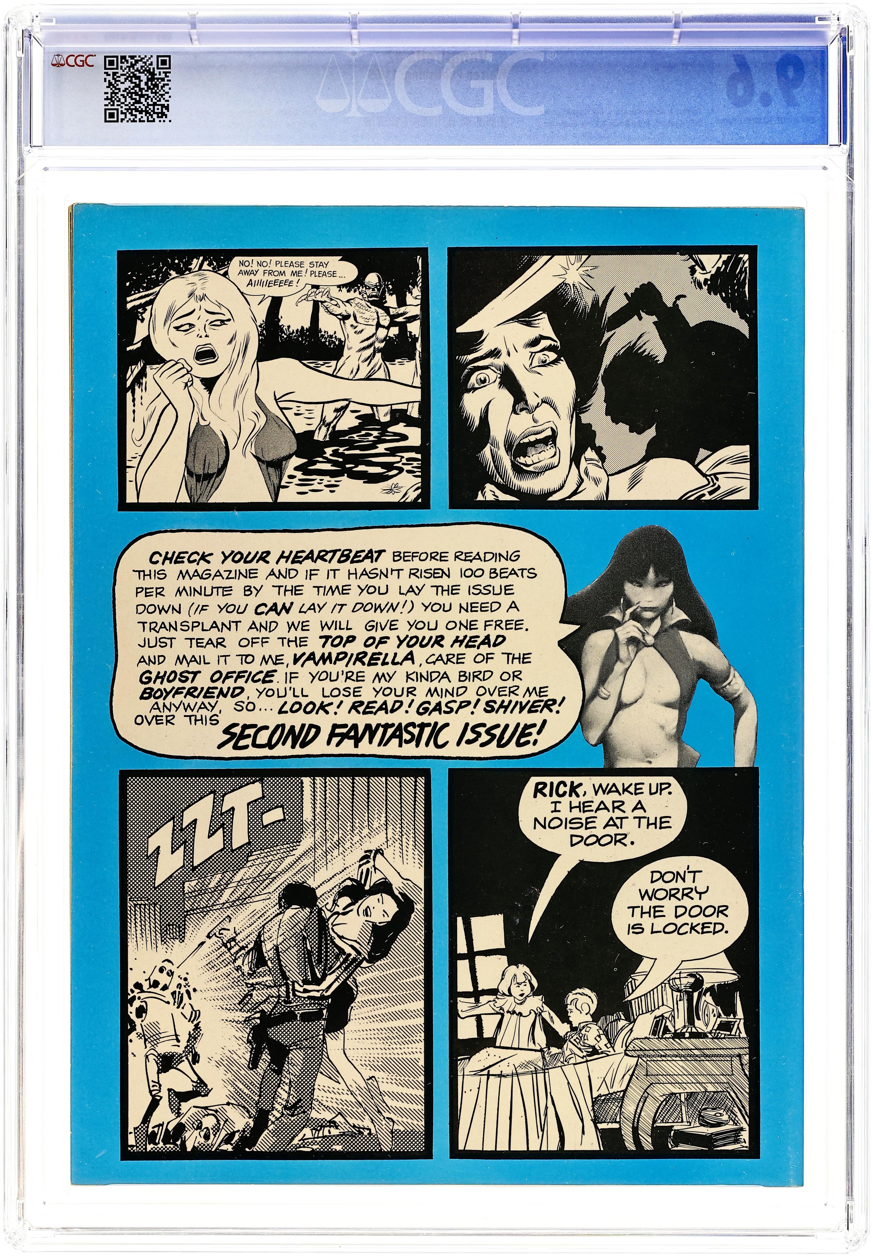 Stories in this issue include: "Vampi's Feary Tales," "Evily" (starring Vampirella's cousin); "Montezuma's Monster"; "Down to Earth" (with cameos by Forry Ackerman and James Warren); "Queen of Horror"; "The Octopus"; "One, Two, Three" (a robot tale); and "Rhapsody in Red." Written by Forrest J Ackerman, Nicola Cuti, Don Glut, Bill Parente, and R. Michael Rosen. Art by William Barry, Ernie Colon, Billy Graham, Mike Royer, Jerry Grandenetti, Dick Piscopo, and Tony Williamsune. Cover art by Bill Hughes. 68 pages, B&W. Cover price $0.50.