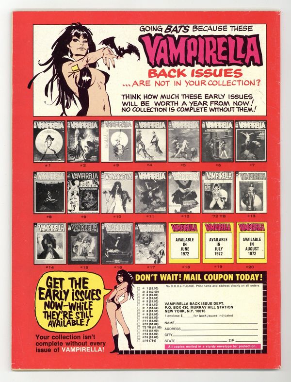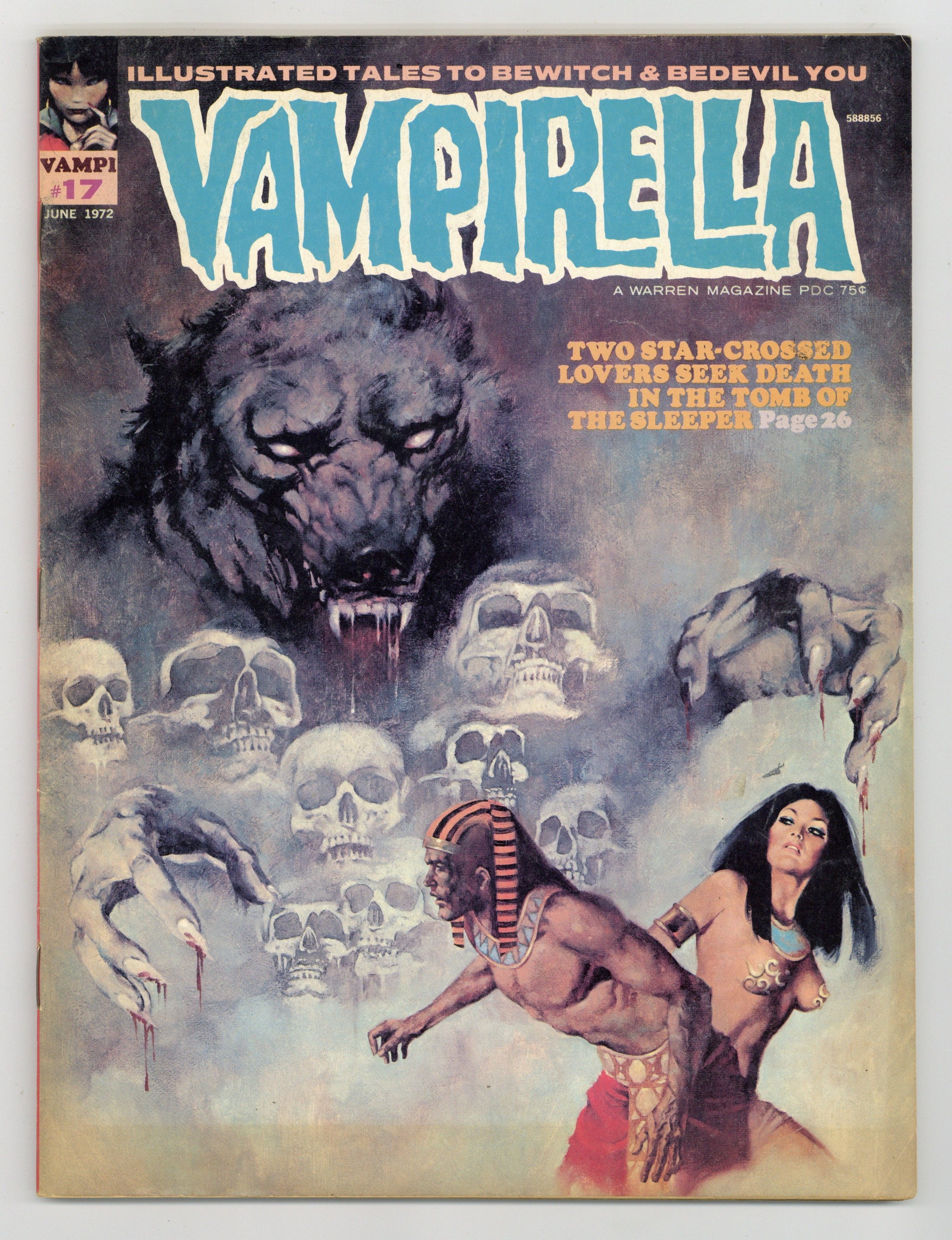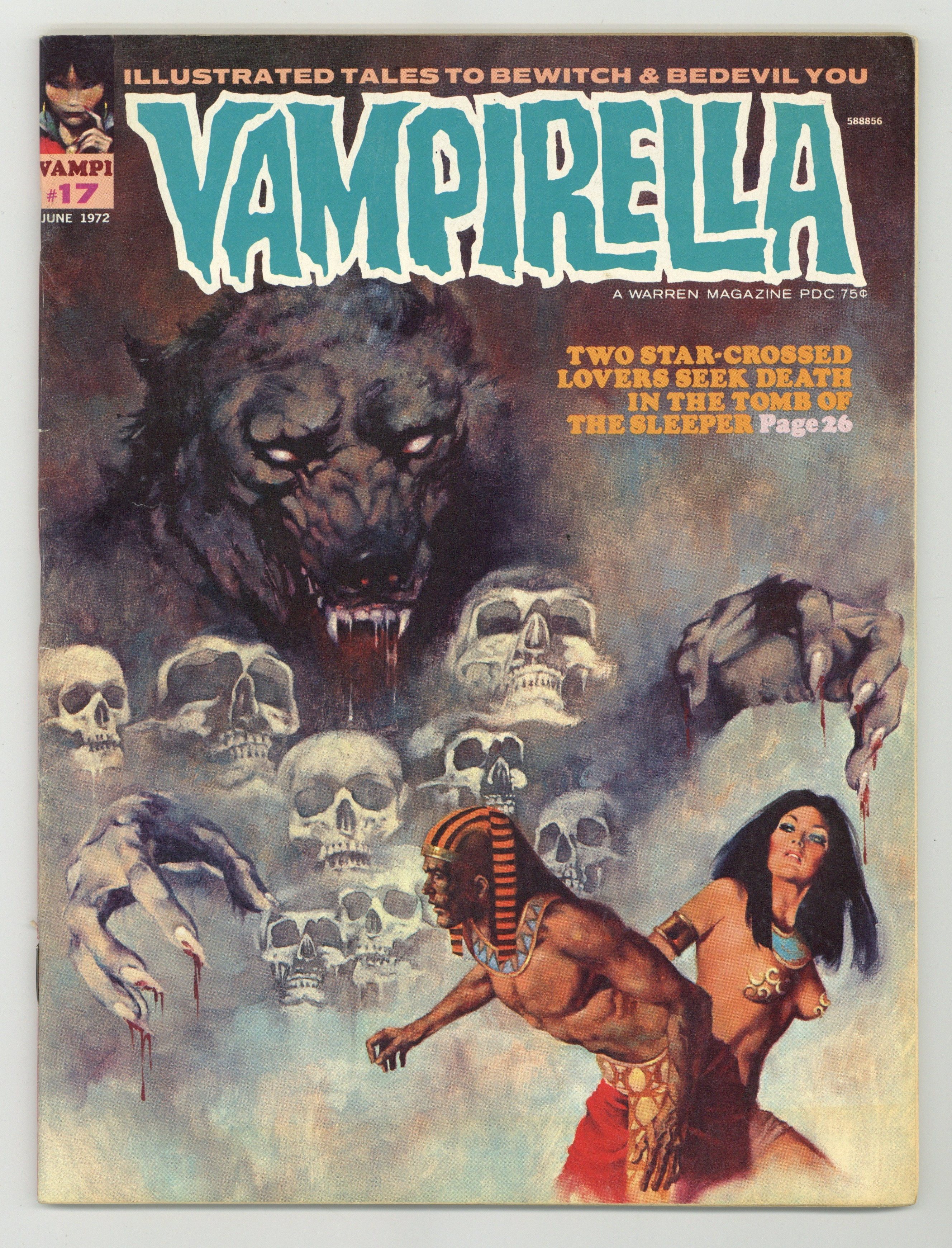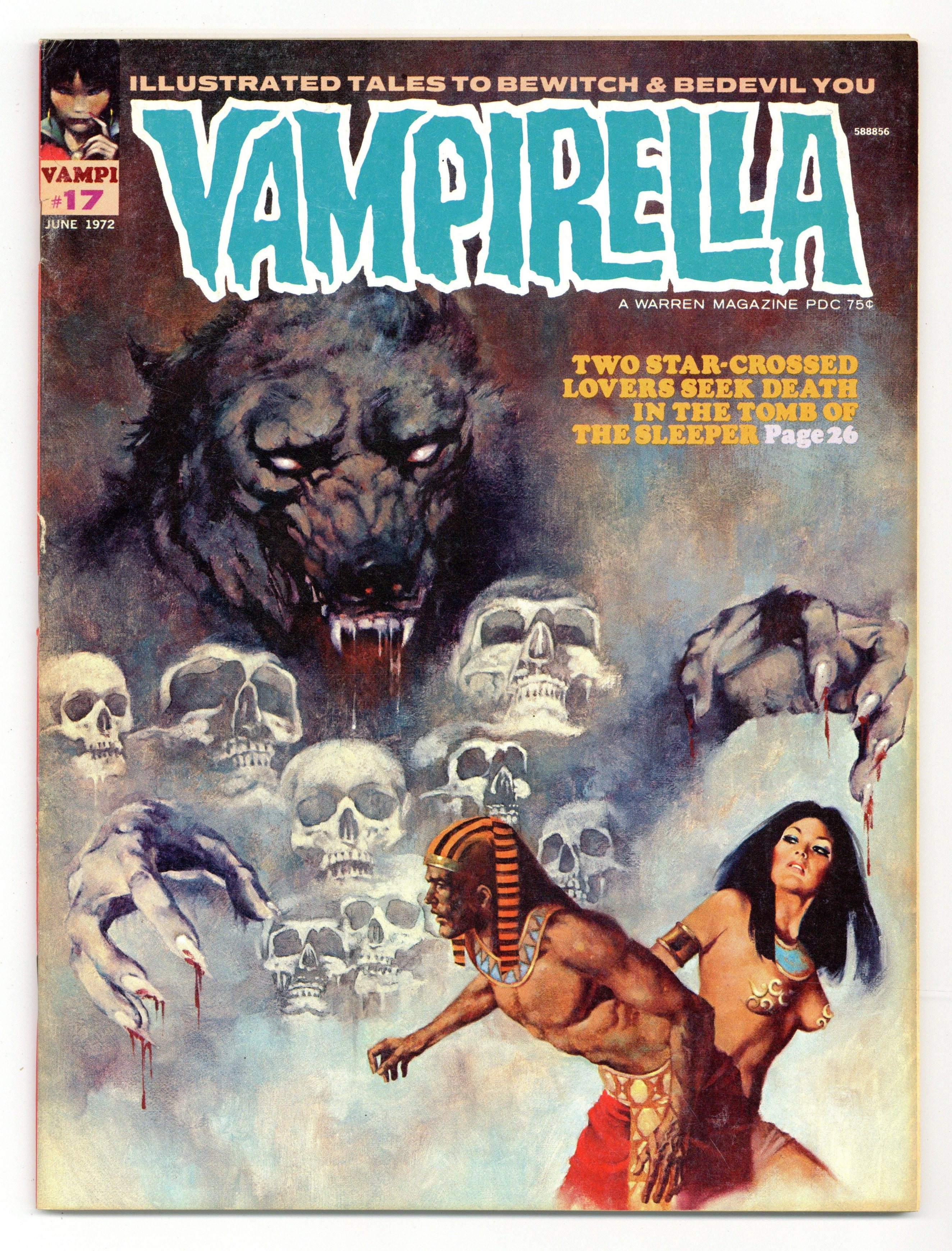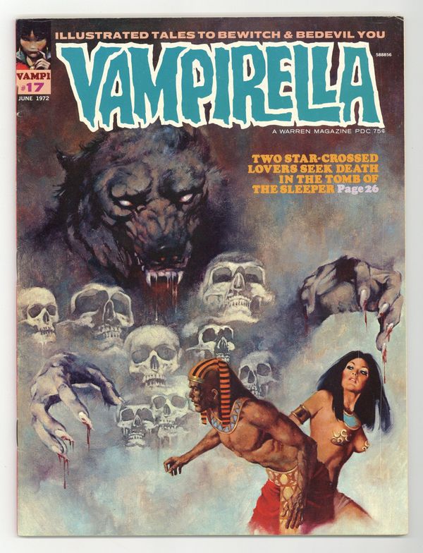 Stories in this issue include: "Vampi's Feary Tales: The Story of Arachne"; "Beware, Dreamers" (Vampirella and Adam go to the Florida Everglades); "Horus"; "Death in the Shadows"; "A Man's World"; "Lover of the Bayou"; and "The Wedding Ring." Includes letter by Don McGregor complaining about Vampirella's comments at the end of his "Witches Coven" story from issue #15. Written by T. Casey Brennan, Mike Jennings, Esteban Maroto, Douglas Moench, Steve Skeates, and Jan S. Strnad. Art by Auraleon, Jose M. Bea, Luis Garcia, Jose Gonzalez, Jerry Grandenetti, Esteban Maroto, L.M. Roca. Cover art by Enrich Torres. Cover price $0.75.