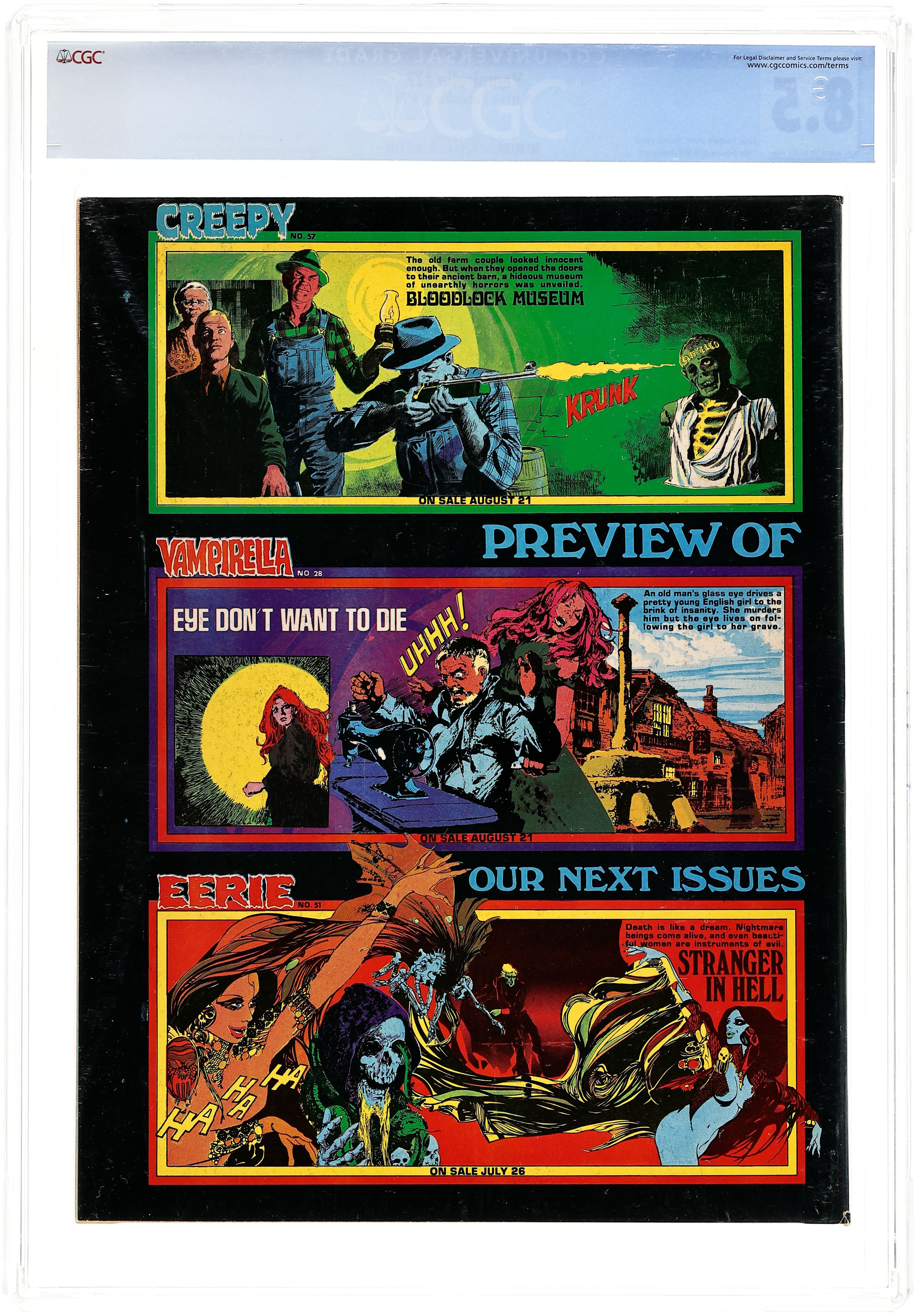 Starts Jan 19 Stories in this issue include: "Wolf Hunt" (featuring a female werewolf); "Welcome to the Coven"; "Quavering Shadows" (haunted castle story); "The Frog Prince"; "Return Trip" (the only new story in an issue filled with reprints); "Cilia"; "Quest"; "War of the Wizards." Written by Nicola Cuti, Jeff Jones, Doug Moench, Wally Wood, and others. Art by Jose Gonzalez, Jeff Jones, Wally Wood, and others. Includes playable game called "Capture Vampirella." Cover art by Enrich Torres. Cover price $1.00.