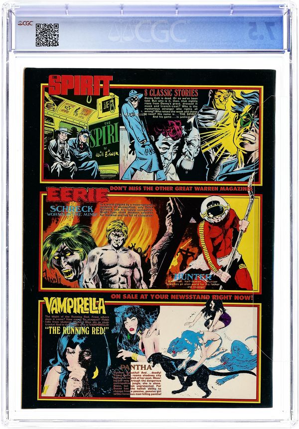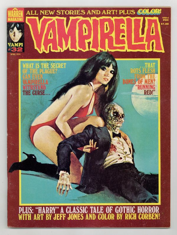 $26.00Stories in this issue include: "The Running Red" (starring Vampirella); "Pantha: Black on White" (featuring a she-cat); "Harry" (in full color); "Dead Run"; "The Man of Spoiling Soul"; and "Just Like Old Times." Written by Fernando Fernandez, Jeff Jones, Flaxman Loew, Rich Margopoulos, and Steve Skeates. Art by Auraleon, Fernando Fernandez, Jose Gonzalez, Jeff Jones, Ramon Torrents. Includes feature on the 1973 Warren Awards. Cover art by Enrich Torres. Cover price $1.00.