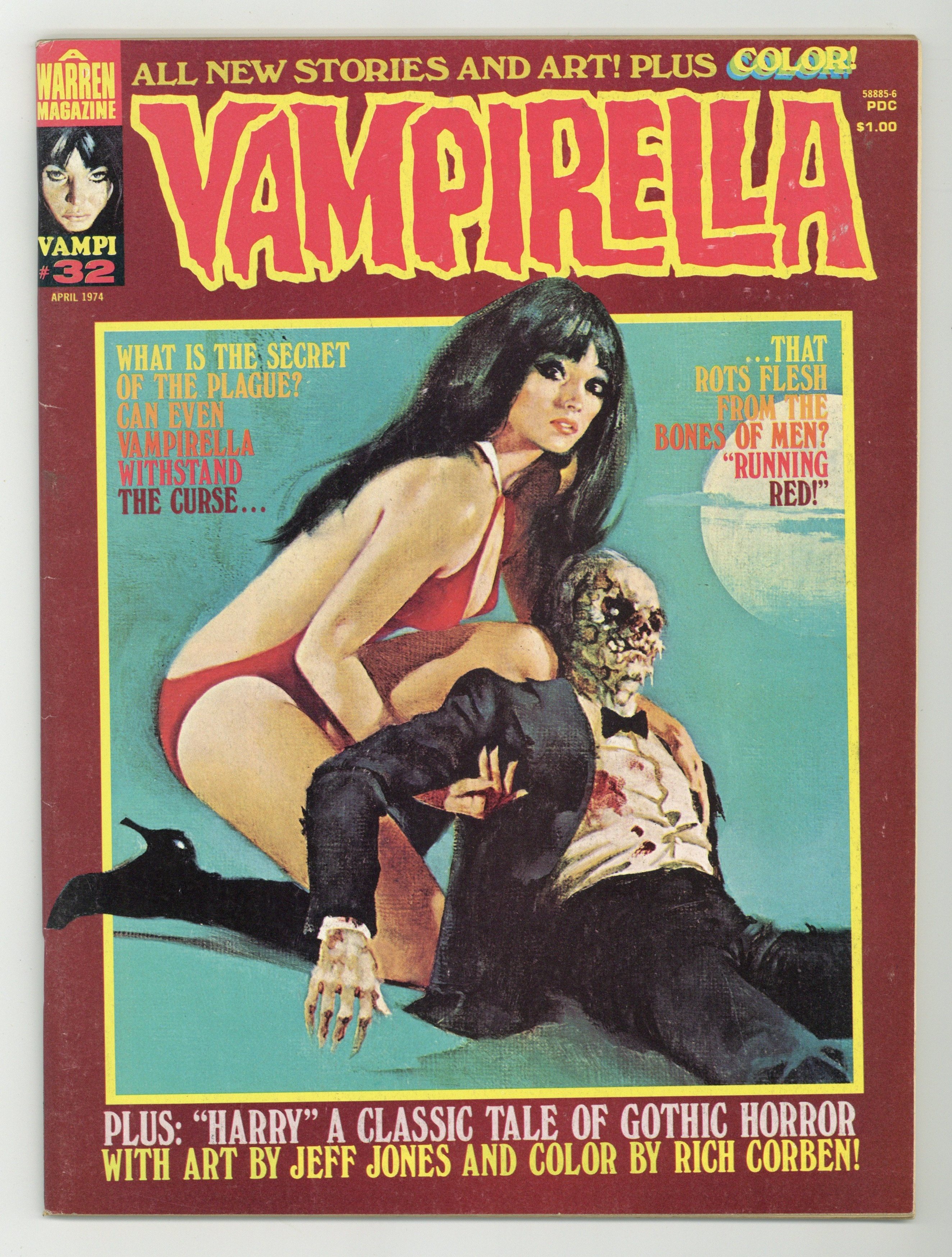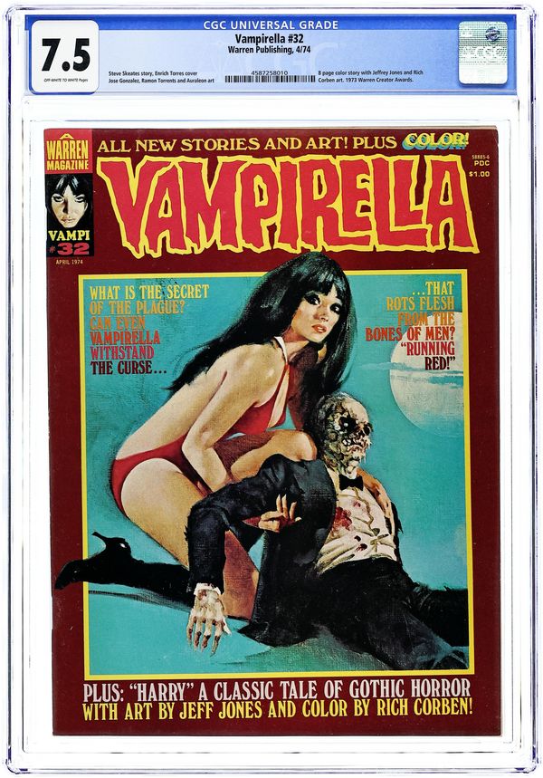 $14.75Stories in this issue include: "The Running Red" (starring Vampirella); "Pantha: Black on White" (featuring a she-cat); "Harry" (in full color); "Dead Run"; "The Man of Spoiling Soul"; and "Just Like Old Times." Written by Fernando Fernandez, Jeff Jones, Flaxman Loew, Rich Margopoulos, and Steve Skeates. Art by Auraleon, Fernando Fernandez, Jose Gonzalez, Jeff Jones, Ramon Torrents. Includes feature on the 1973 Warren Awards. Cover art by Enrich Torres. Cover price $1.00.
