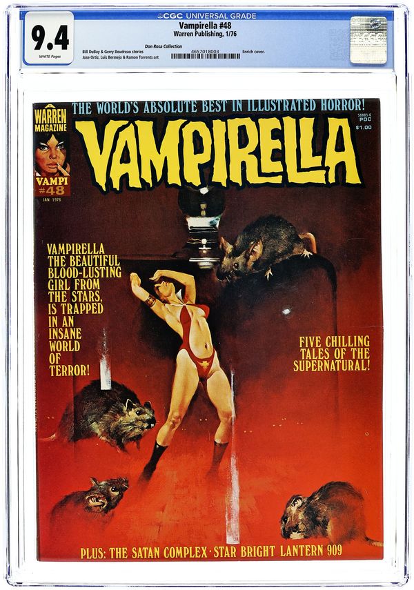 Stories in this issue include: "Ambergris, Kato & Tonto" (starring Vampirella); "The Satan Complex"; "Of Death & Distinction"; "Magic Hands/Silvershoe"; and "Starbright Lantern 909" (lighthouse story). Written by Gerry Boudreau and Bill DuBay. Art by Luis Bermejo, Joaquin Blasquez, Jose Ortiz, Ramon Torrents, and Zesar. Cover art by Enrich Torres. Back cover features ad for Hammer Vampirella film that was never produced. Cover price $1.00.