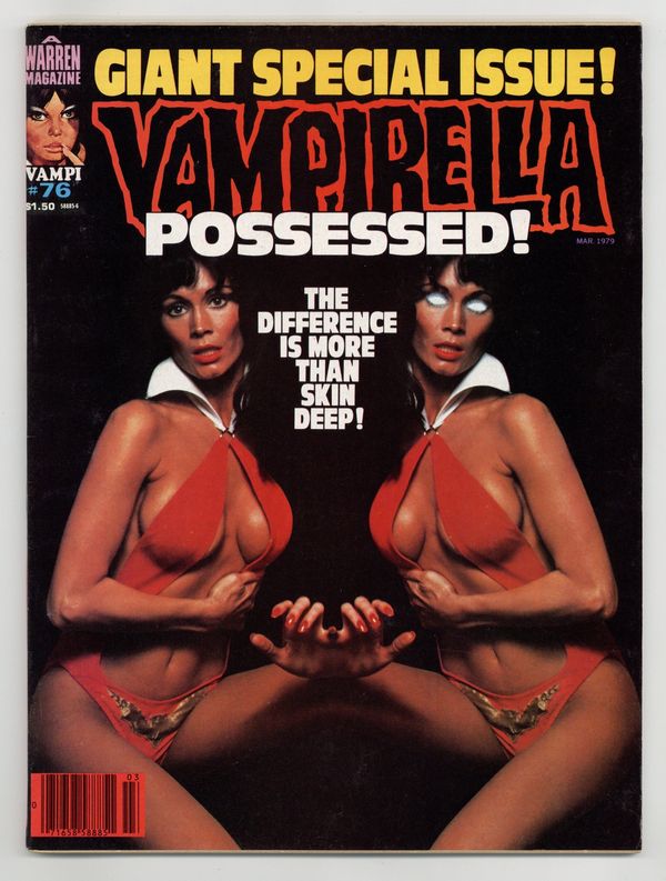 This Giant Special Issue features the following stories: Vampirella in "Curse of the Pasha's Princess" (script by Bill DuBay, art by Jose Gonzalez), "Gravity Field" (scripit by Bob Toomey, art by Moreno Casares), "The Games of Sharn" (script by Bruce Jones, art by Ramon Torrents), "Swift Sculpture" (script by Toomey, art by Val Mayerik), "Time for a Change" (script by Nicloa Cuti, art by Alex Nino), and "The Haunted" (script by Jones, art by Russ Heath). Also: Joe Brancatelli's column on the comic book industry. Photo cover: Barbara Leigh as Vampi. Cover price $1.50.