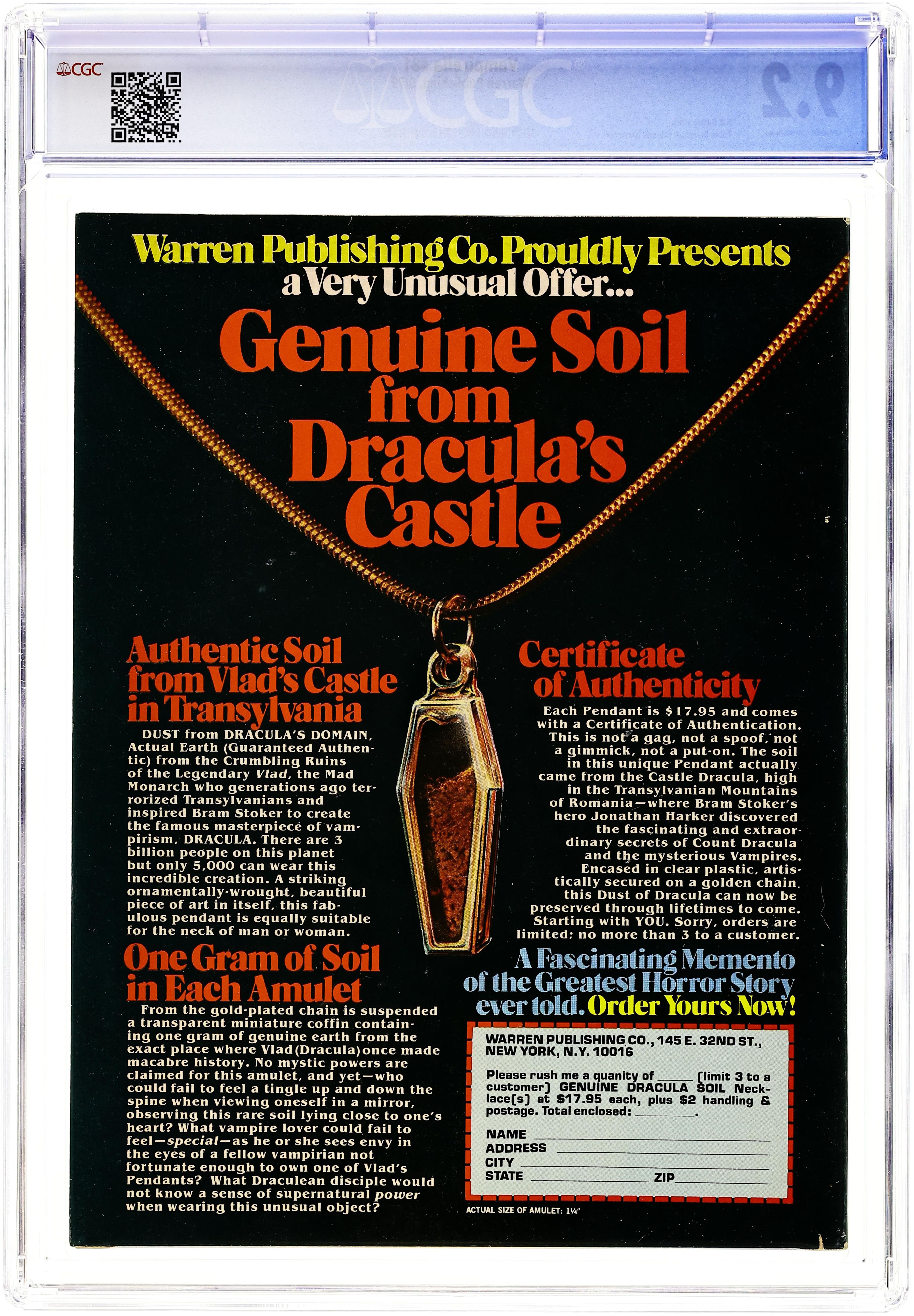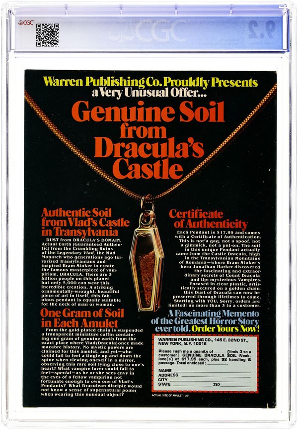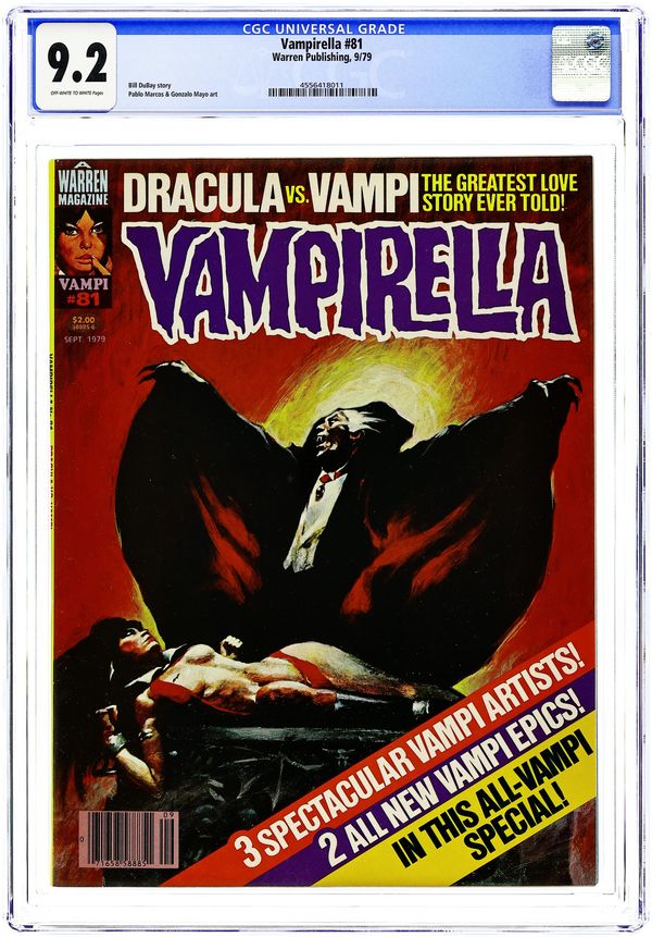 Stories in this issue include: "Alien Amazon" (starring Vampirella); "Scourge of the Dragon"; "And Be a Bride of Chaos"; and "Dracula Still Lives" (Drac vs. Vampi!). Written by T. Casey Brennan, Bill DuBay, and Archie Goodwin. Art by Jose Gonzalez, Pablo Marcos, and Gonzalo Mayo. Joe Brancatelli's comic books column is about Max and Bill Gaines. Cover art is a classic Sanjulian piece retouched by Kim McQuaite. Cover price $1.75.