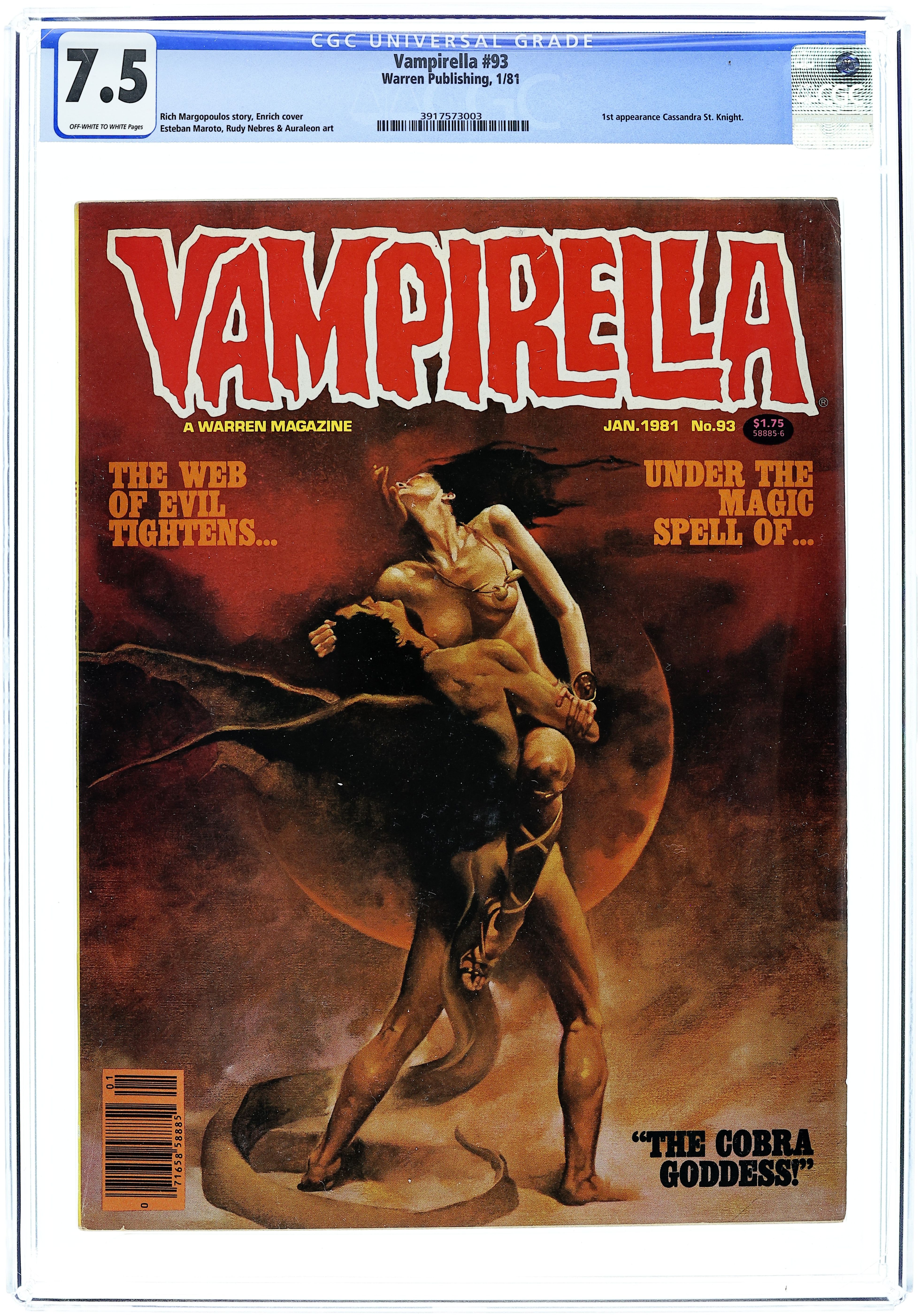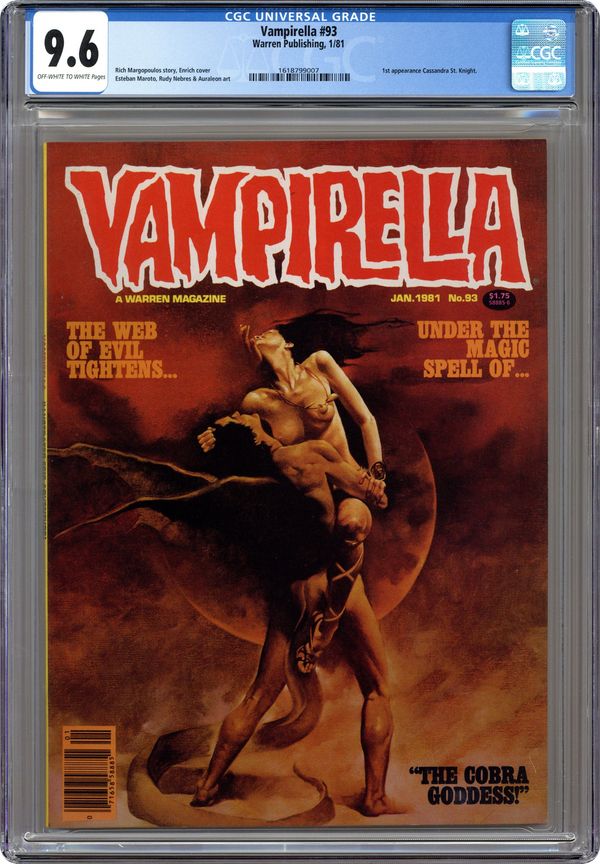 Stories in this issue include: "Vampirella: Apocalypse Inc."; "Cassandra St. Knight: The Psychic Assault" part one; "Pantha: Encore for Anubis"; and "Cobra Goddess." Written by Rich Margopoulos and Esteban Maroto. Art by Alfredo Alcala, Auraleon, Leo Duranona, Esteban Maroto, and Rudy Nebres. Cover art by Enrich Torres. Cover price $1.75.