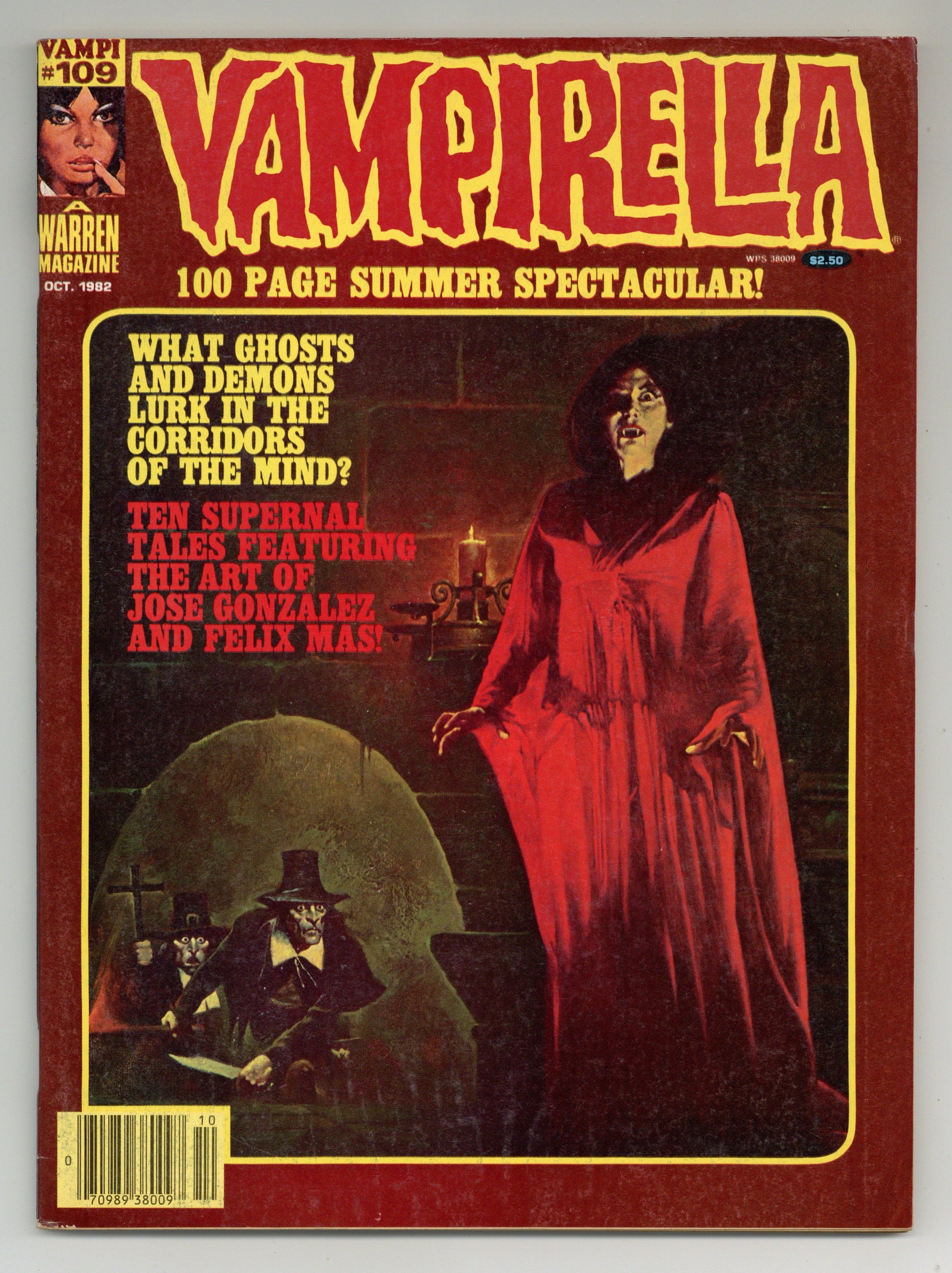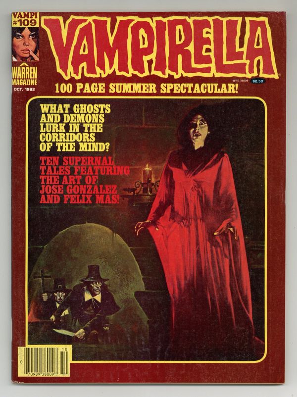 Stories in this 100 Page Summer Spectacular reprint issue include: "Vampirella: The Corpse with the Missing Mind"; "The Sultan of 42nd Street"; "Dungeons of the Soul"; "Out of the Nameless City"; "The Climbers of the Tower"; "Miranda"; "The Dorian Gray Syndrome"; "The Killer"; "Minra"; and "Changes." Written by Gerry Boudreau, T. Casey Brennan, Bill DuBay, Don Glut, John Jacobson, Ed Newsome, Fred Ott, Steve Skeates, and Carl Wessler. Art by Jose Gonzalez and Felix Mas. Cover art by Sanjulian. Cover price $2.50.