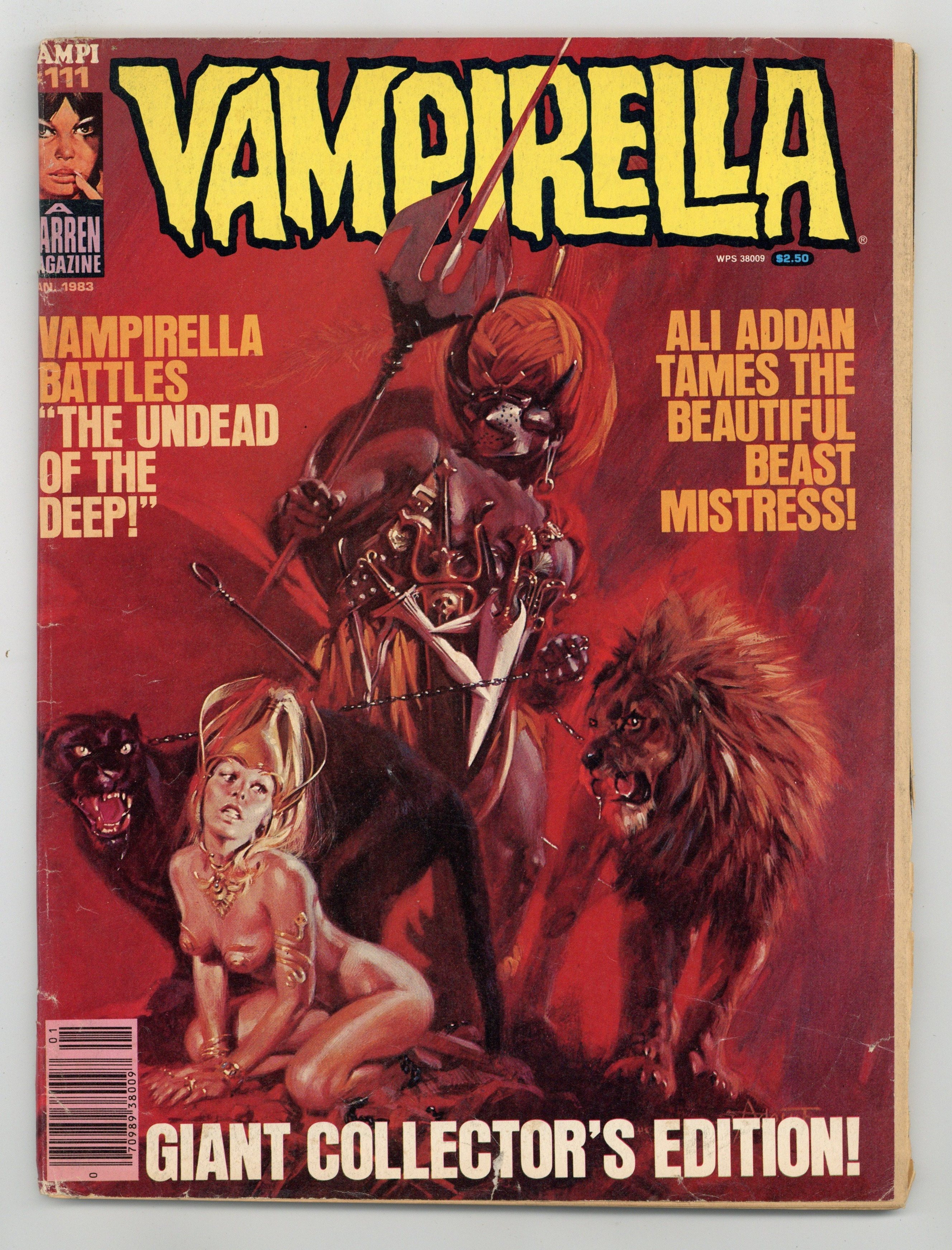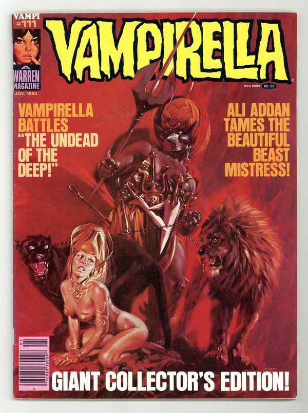 $11.75Stories in this all-reprint Giant Collector's Edition include: "Vampirella: The Curse of the MacDaemons"; "Vampirella: The Undead of the Deep"; "The Time Eater"; "Ali Addan and Son"; "Force-Feed"; "Fog"; and "The French Coagulation." Written by Flaxman Loew, Jack Butterworth, Bill Dubay, Esteban Maroto, Cary Bates, Nicola Cuti, Gerry Boudreau, and Carl Wessler. Art by Jose Gonzalez, Paul Neary, Esteban Maroto, Leopold Sanchez, Carmine Infantino, Dick Giordano, and Luis Bermejo. "The Noxious Newspage" has piece on Forrest J Ackerman stepping down as Editor-in-Chief of Famous Monsters of Filmland. Cover art by Pujolar. Cover price $1.75.