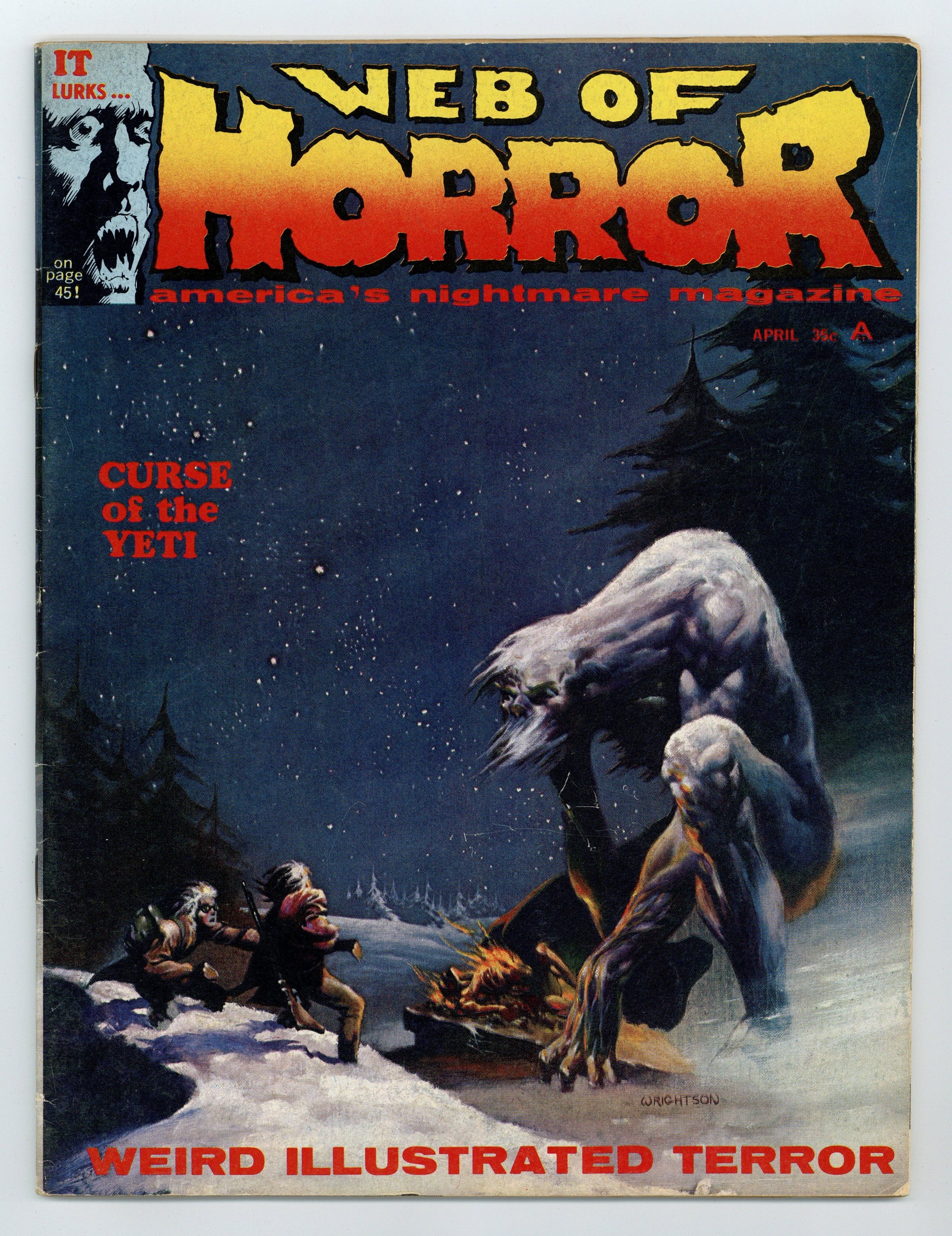 Final issue of the series. "Dead End" (script by Otto Binder, art by Mike Kaluta), "Curse of the Yeti" (script by Binder, art by Ralph Reese), "Santa's Claws" (art by Frank Brunner), "Strangers" (script and art by Syd Shores), "Point of View" (script and art by Bruce Jones), and "Feed It!" (script by Mike Friedrich, art by Berni Wrightson. Two-page center spread by Wrightson. Inside front cover by Brunner. Front and back cover painting by Wrightson.