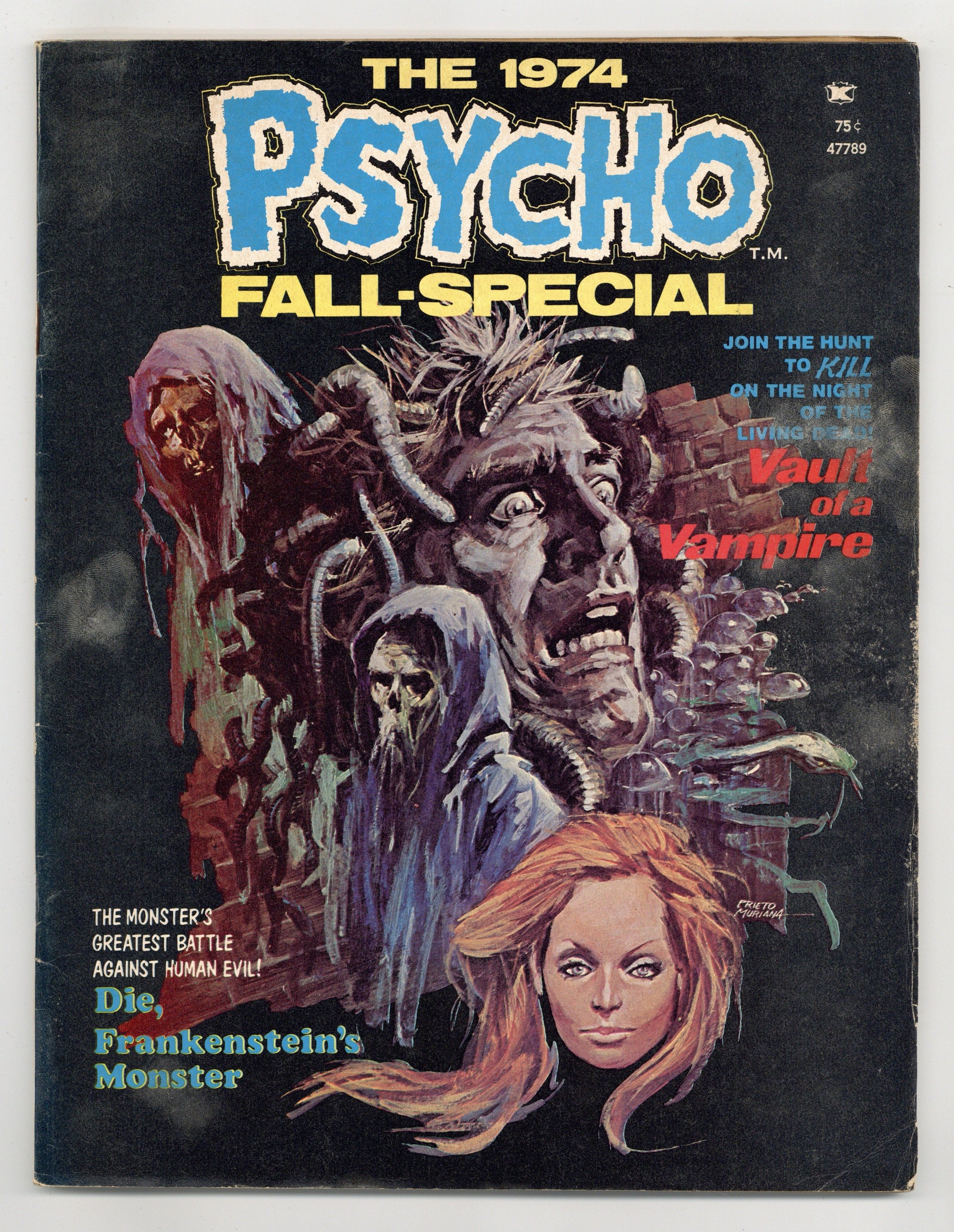 No # on cover or in indicia. 1974 Fall-Special. Includes: cover art by Prieto Muriana; Die, Frankenstein's Monster!, script by Al Hewetson, art by Cesar Lopez; editorial page, text by Hewetson, pencils by Virgil Finley and H.P. Lovecraft, inks by Zesar Lopez; Revolution!, script by Rich Margopoulos (as Rich Poulos), pencils by Tom Sutton (as Sean Todd), inks by Dan Adkins; The Wow! by Pat Boyette; Birth Announcement, script by Hewetson, pencils by Ramon Torrents; Phantom Of The Rock Era, script by Chuck McNaughton, art by Ralph Reese; The Midnight Slasher, script by Doug Moench, pencils by Pablo Marcos; Within The Torture Chamber, script by Kevin Pagan, pencils by Doug Wildey; Vault Of A Vampire, script by Al Hewetson, pencils by Serg Moren; and Nightmare Pin-Up by Gene Day. 68 pgs. Cover price: $0.75. Cover price $0.75.