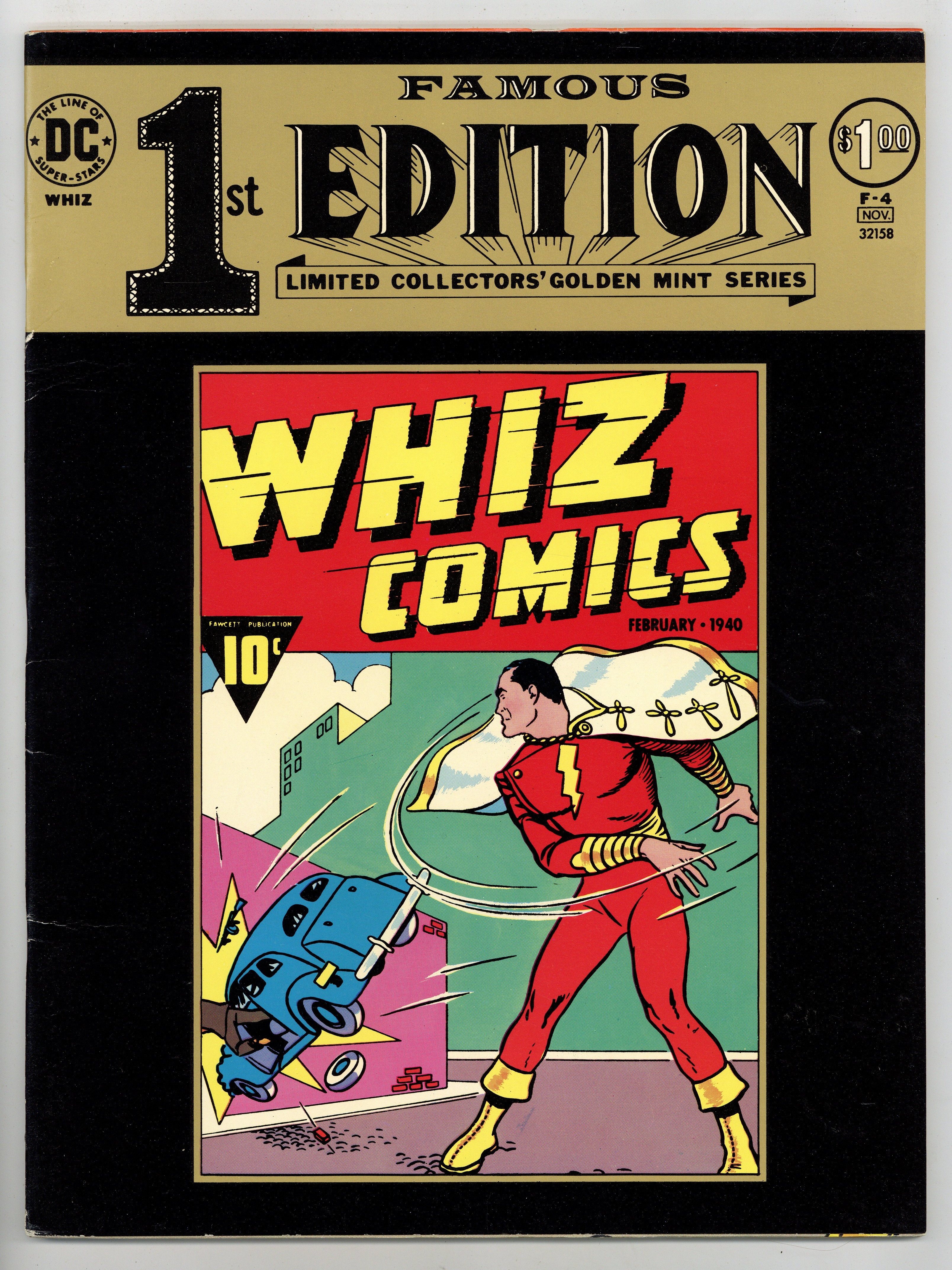 Softcover 1974 Edition. Famous First Edition (#F-4) Golden Mint Series: Whiz #1 (#2) features Fawcett Comics Captain Marvel. Reprints the entire issue from cover to cover including the original ads. NOTE: This almost exact replica edition is 10 x 13-1/2" (about the size of a Life magazine); it contains two covers. NOTE: The original, 1940 first edition is standard comic book size. Cover price $1.00.