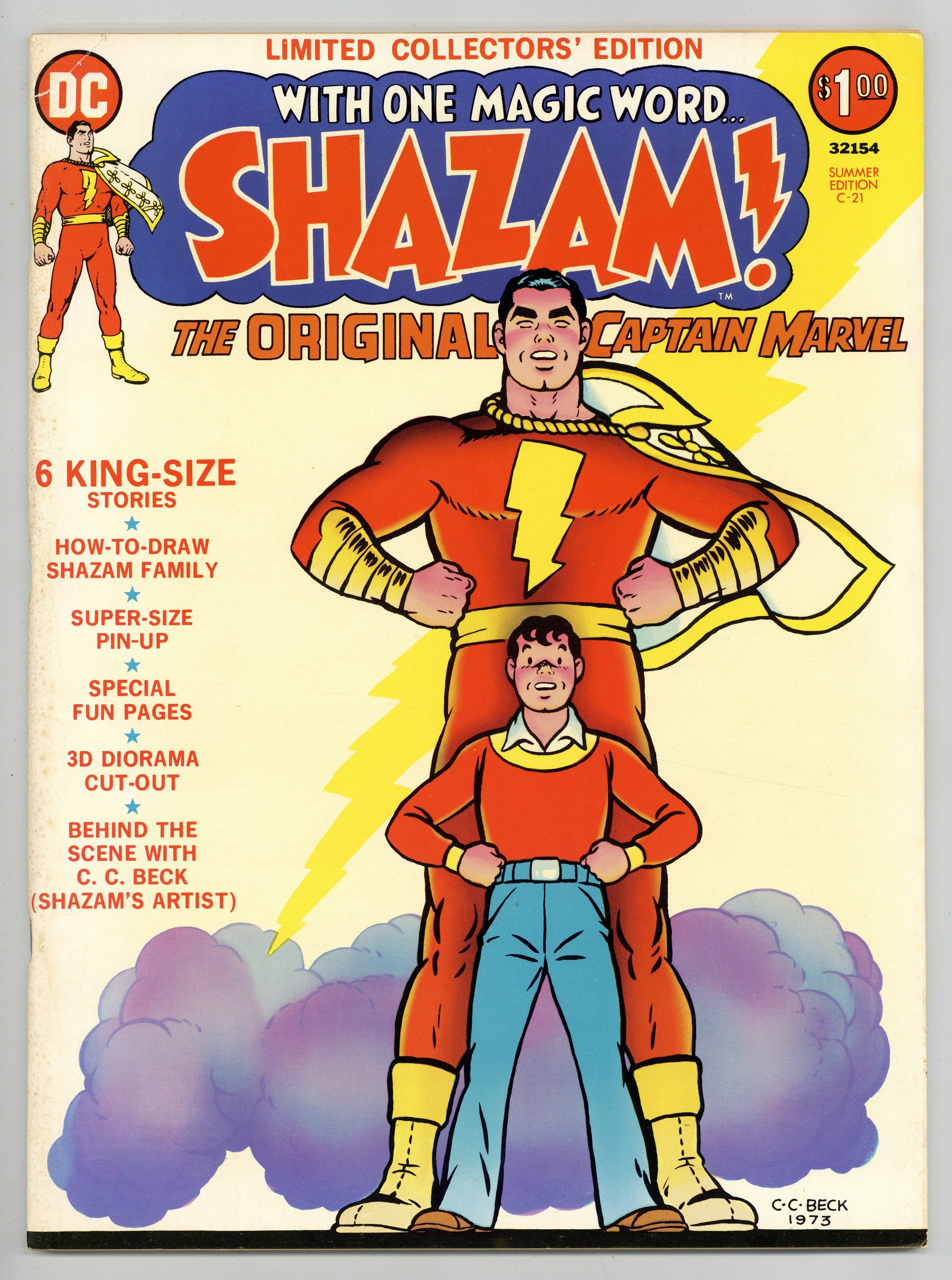 DC Treasury Edition (1974) #21 features Shazam the original Captain Marvel. Art by C.C. Beck. This treasury sized collector's edition features six stories starring the Marvel Family, a feature on how to draw the Marvel Family, a super-size pin-up, a 3-D diorama cut-out, and a behind the scene feature with C.C. Beck. Guest-starring Mary Marvel and Captain Marvel Jr. and featuring the evil genius of Dr. Sivana. 80 pages. Cover price $1.00.