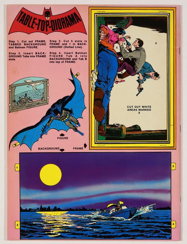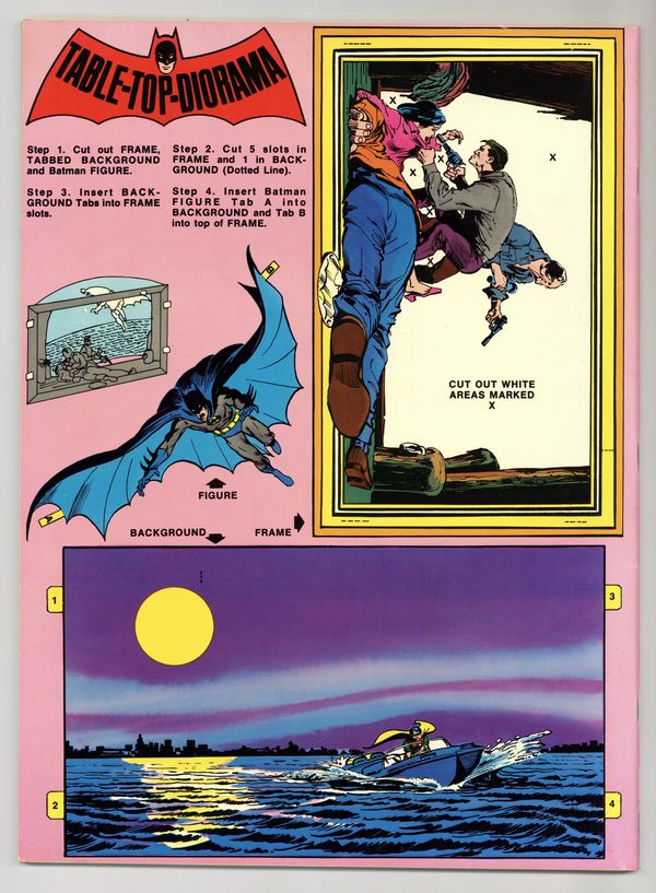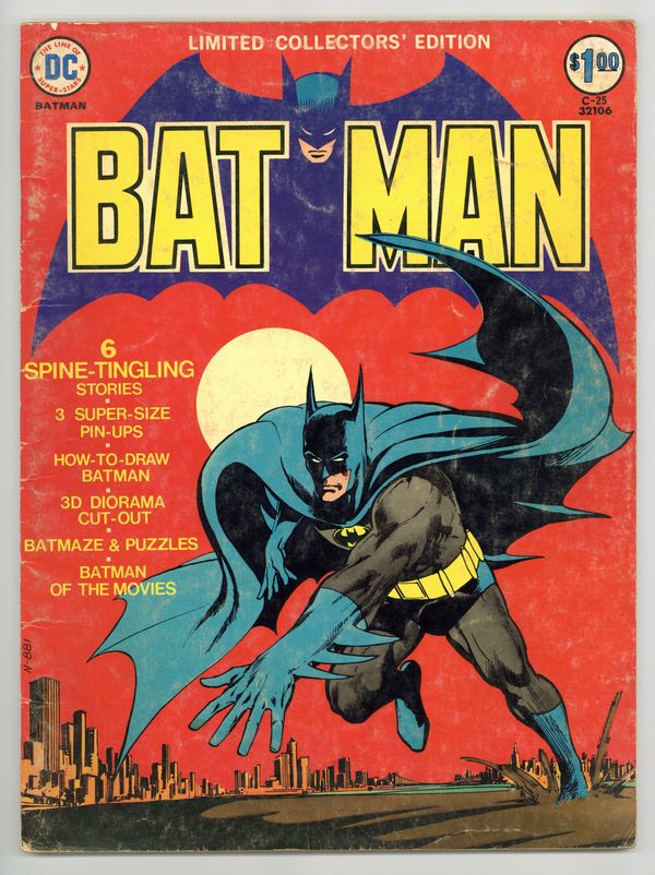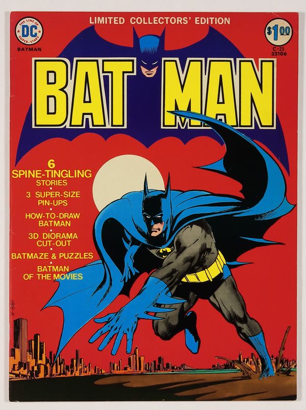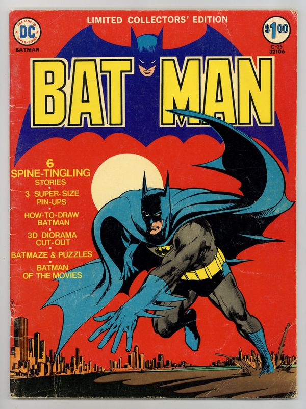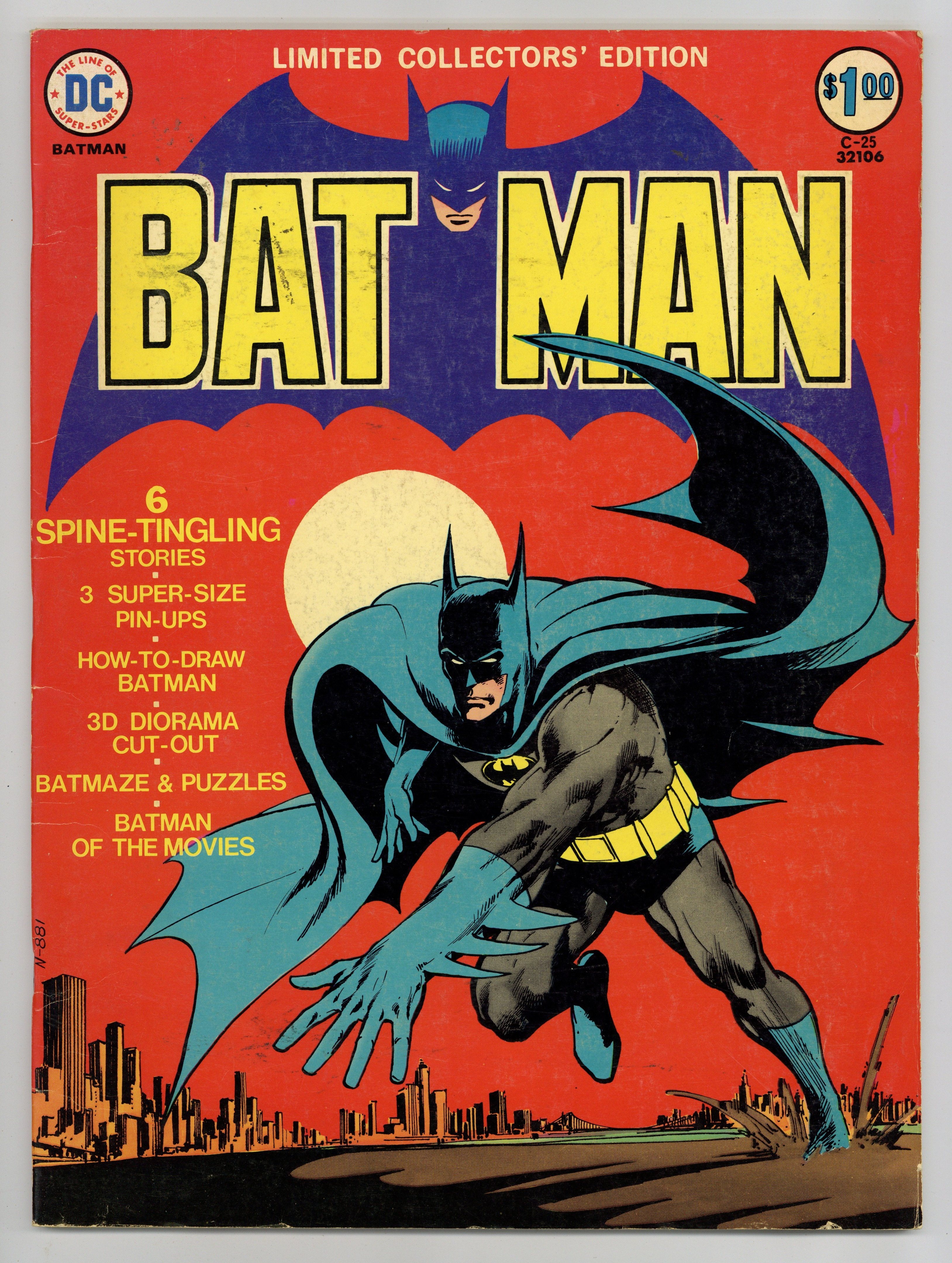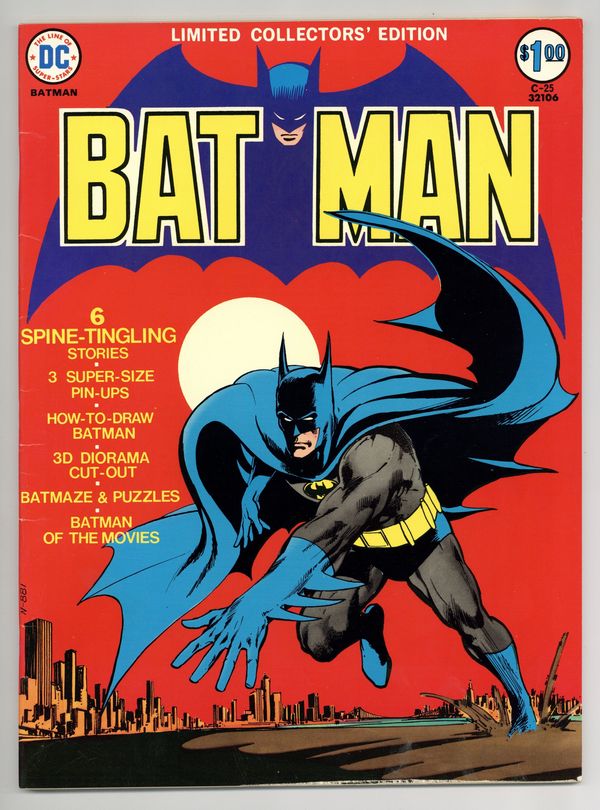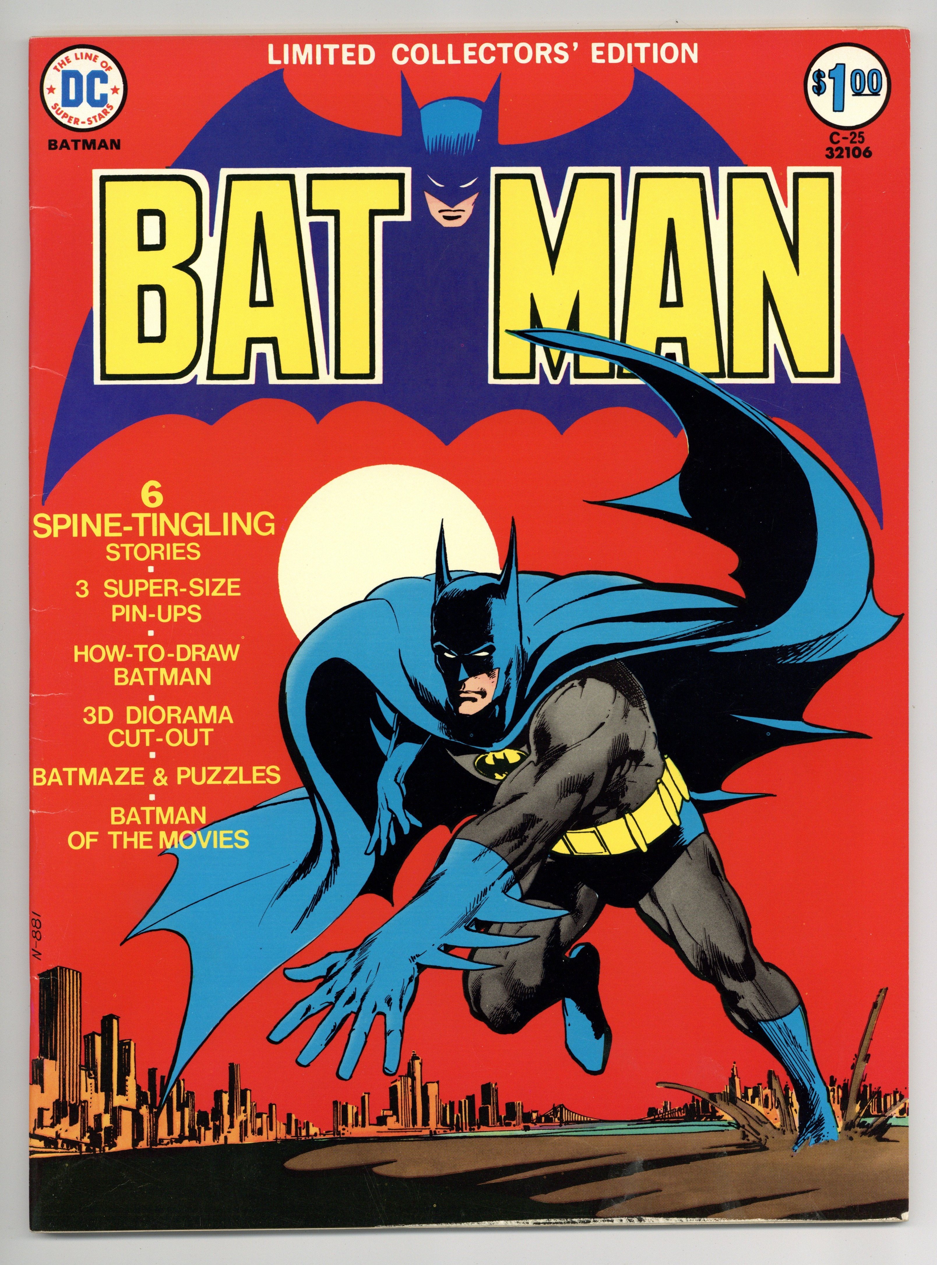 Limited Collectors' Edition: Batman reprints: "The Case of the Joker's Crime Circus" from 1941 (art by Bob Kane); ""The Case Batman Failed to Solve" from 1942 (art by Jerry Robinson); "The Majors of Yonville" from 1944 (art by Dick Sprang); "Hate of the Hooded Hangman" from 1966 (art by Carmine Infantino); "Hot Time in Gotham Town Tonight" from 1970 (art by Irv Novick); and "Ghost of the Killer Skies" from 1970 (art by Neal Adams). Centerspread by Adams. Joker and Penguin pin-ups by Infantino/Murphy Anderson. One-page "How to Draw Batman" by Infantino. Inside back cover contains photos from the 60s Batman TV show: Adam West & Burt Ward, Cesar Romero, Burgess Meredith, Julie Newmar, and Frank Gorshin, plus Lewis Wilson and Douglas Croft from the 1943 Batman serial. Size is 10 x 13-1/2" (about the size of a Life magazine). 80 pages. Adams covers. Cover price $1.00.