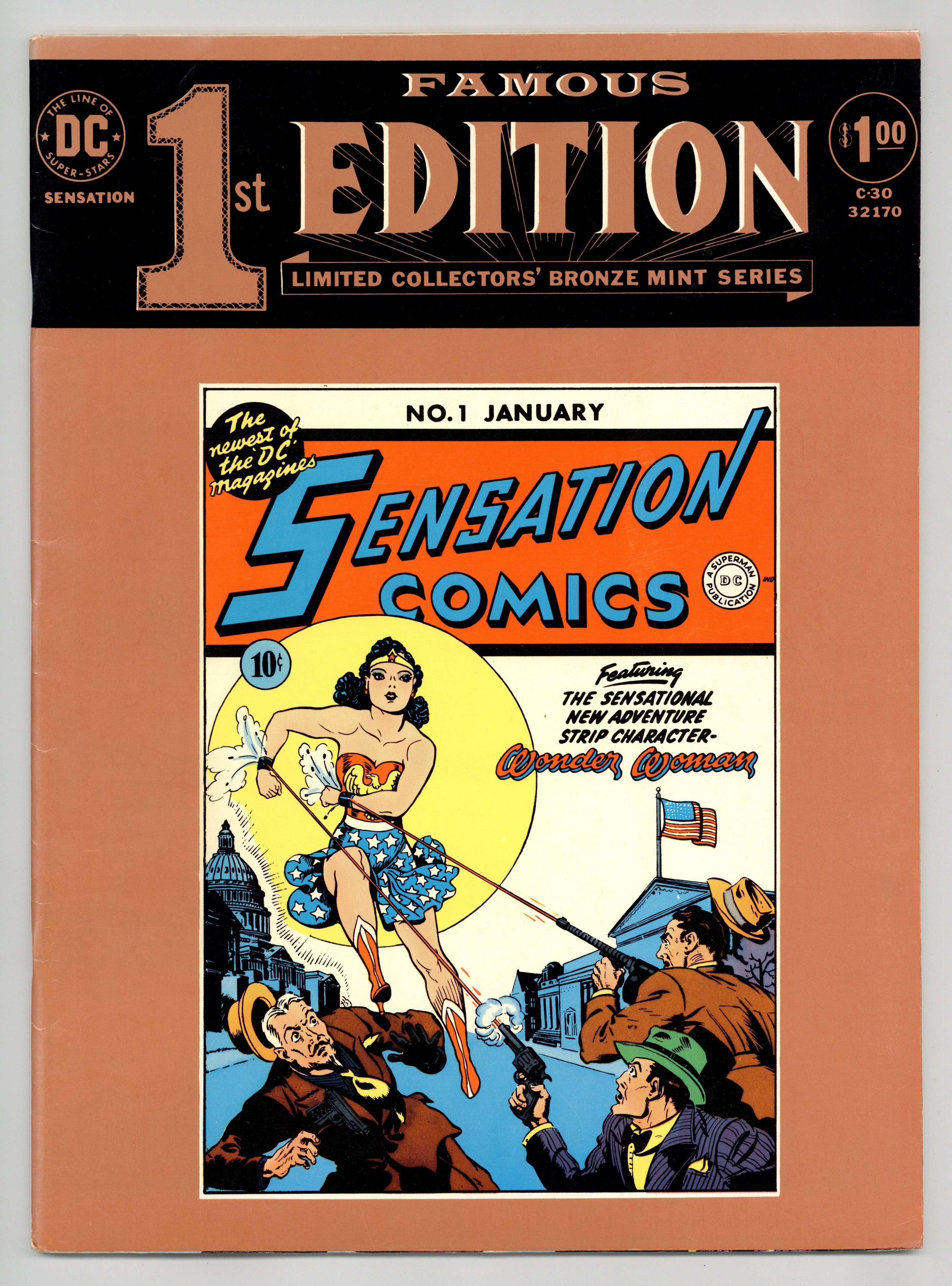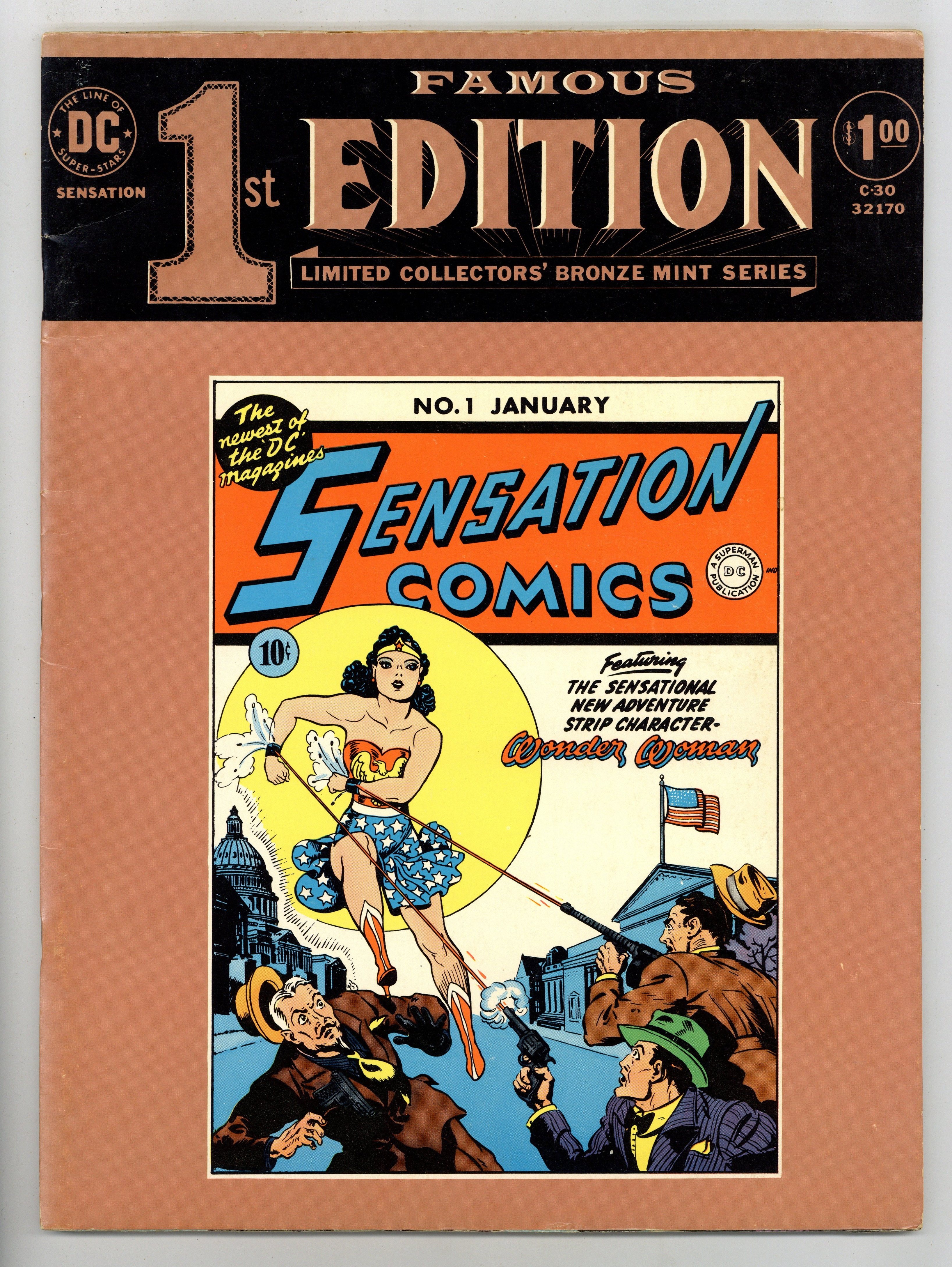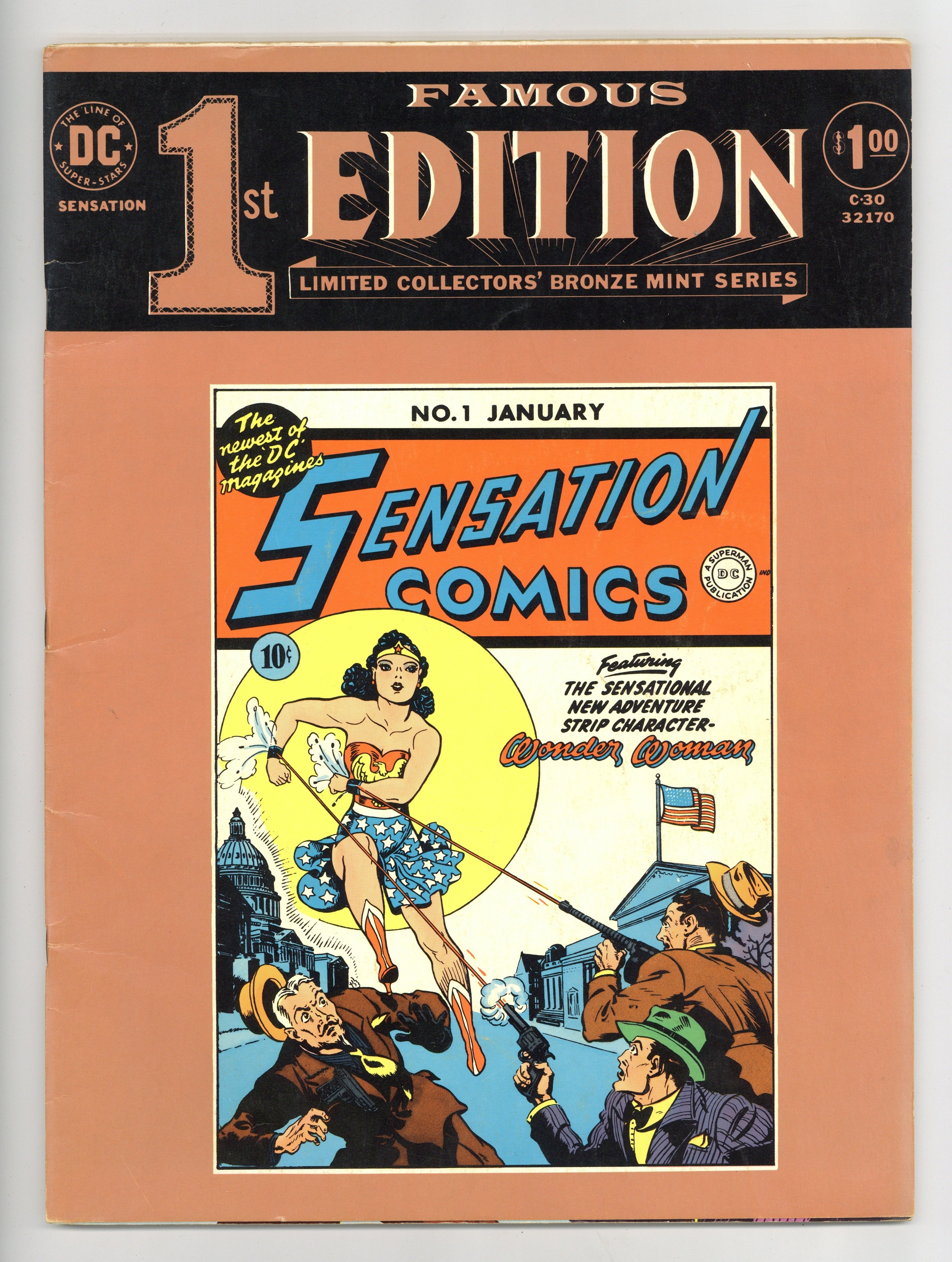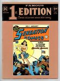 Softcover edition. Famous First Edition #C-30: Sensation #1 (early Wonder Woman appearance). NOTE: This almost exact replica edition is 10 x 13-1/2" (about the size of a Life magazine); it has two covers. The original, 1942 first edition is standard comic book size. Cover price $1.00.