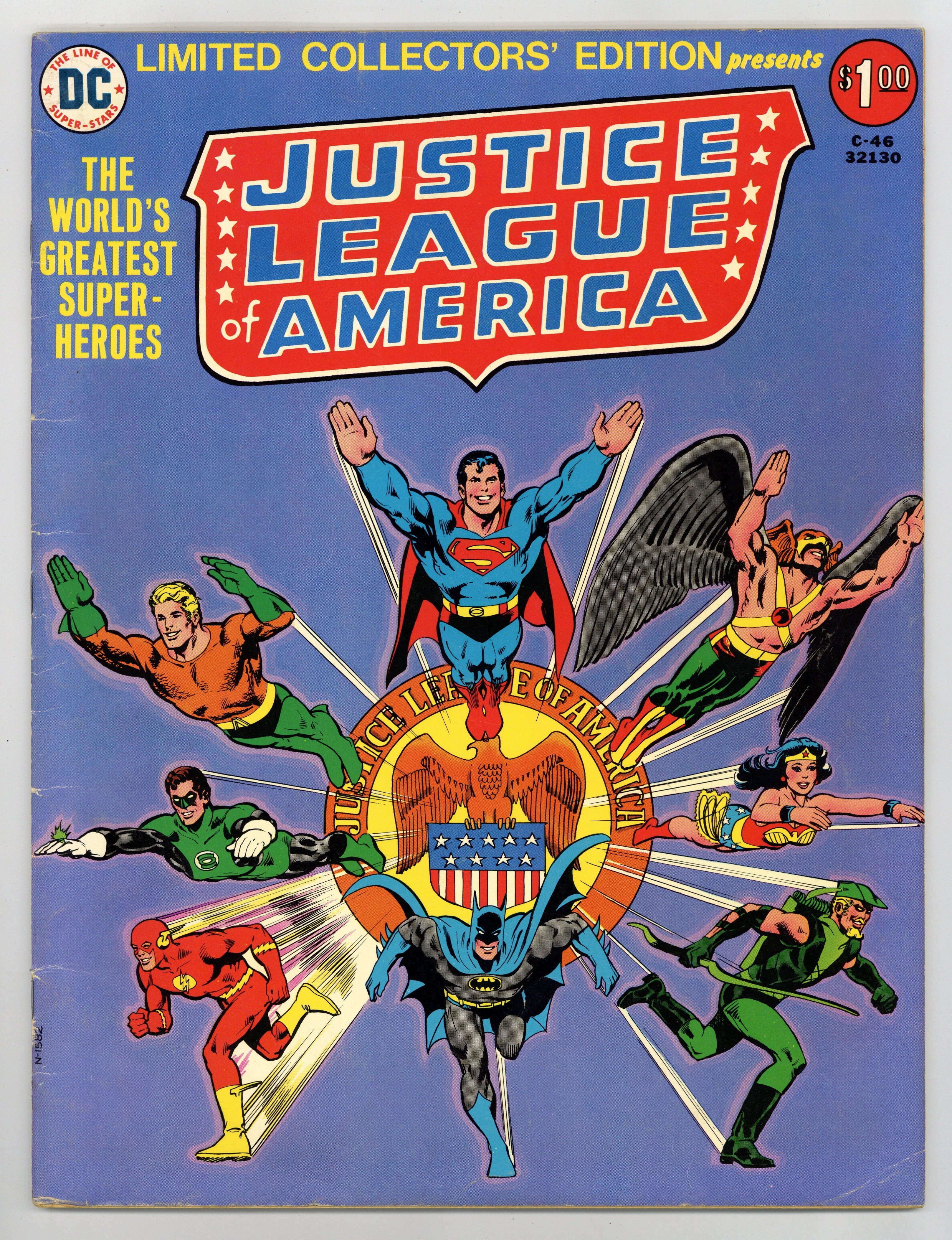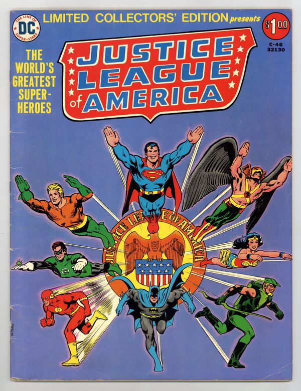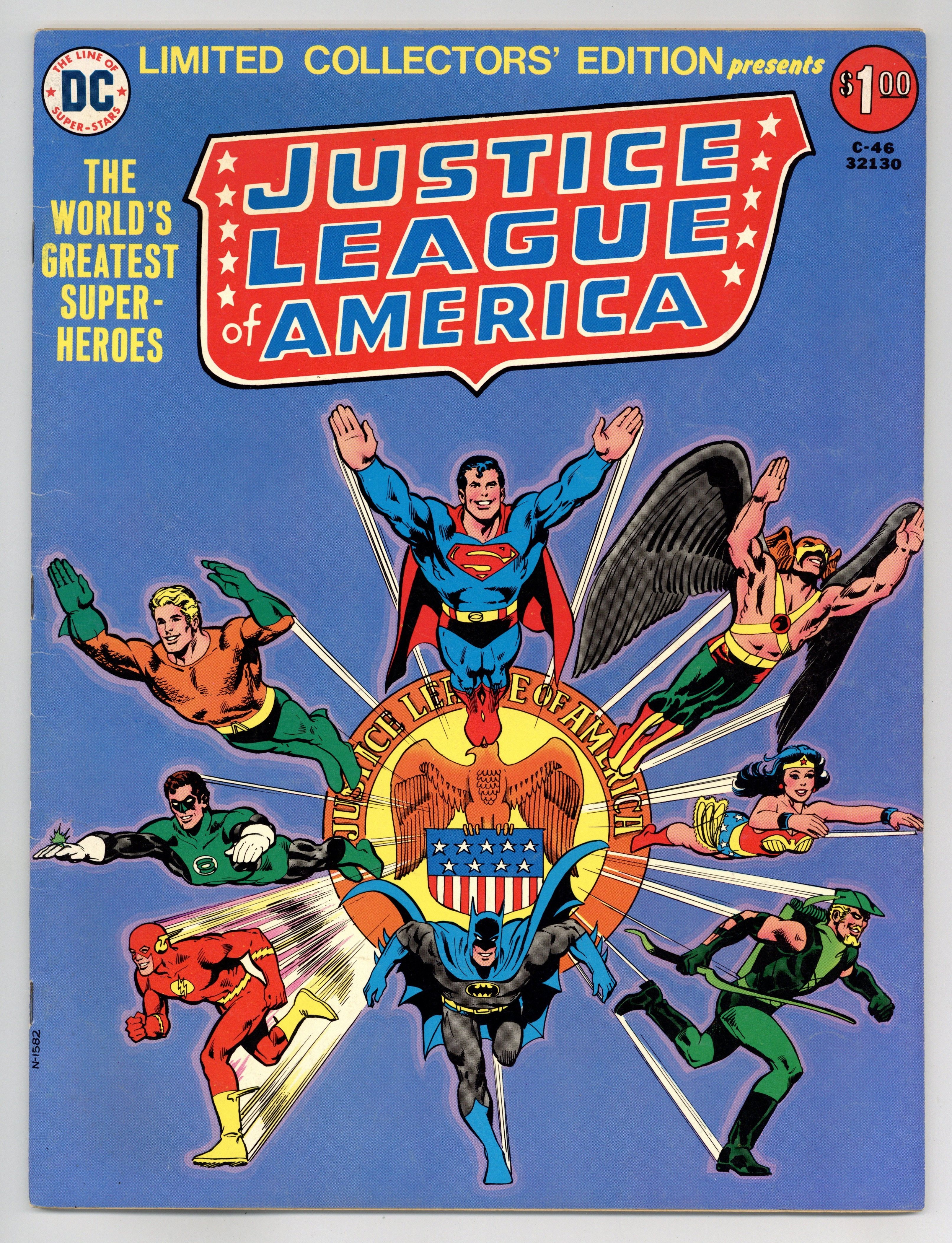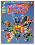 Limited Collectors' Edition: Justice League of America reprints. Decoy Missions of the Justice League, script by Gardner Fox, art by Mike Sekowsky and Bernard Sachs; Kanjar Ro, the villain from the planet Dhor, conceives a brilliant scheme to steal the entire Earth—without the Justice League even knowing it; guest-starring Adam Strange. The Deadly Dreams of Dr. Destiny, script by Gardner Fox, art by Mike Sekowsky and Bernard Sachs. Two-page JLA pinup by Austin and Giordano. The JLA on TV featuring Alex Toth Super Friends art. Treasury-sized. 52 pgs. Size is 10 x 13-1/2" (about the size of a Life magazine). Cover price $1.00. Cover price $1.00.