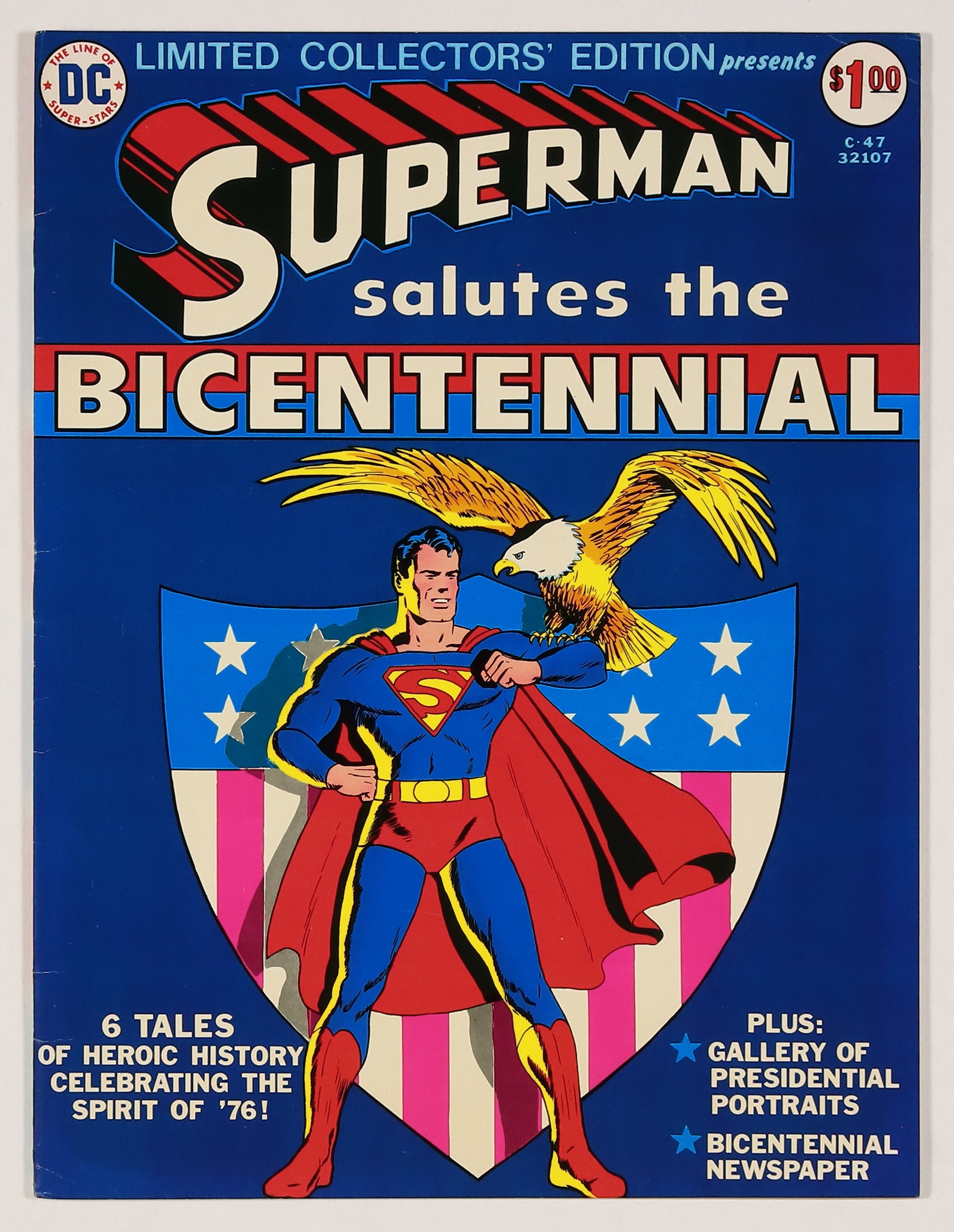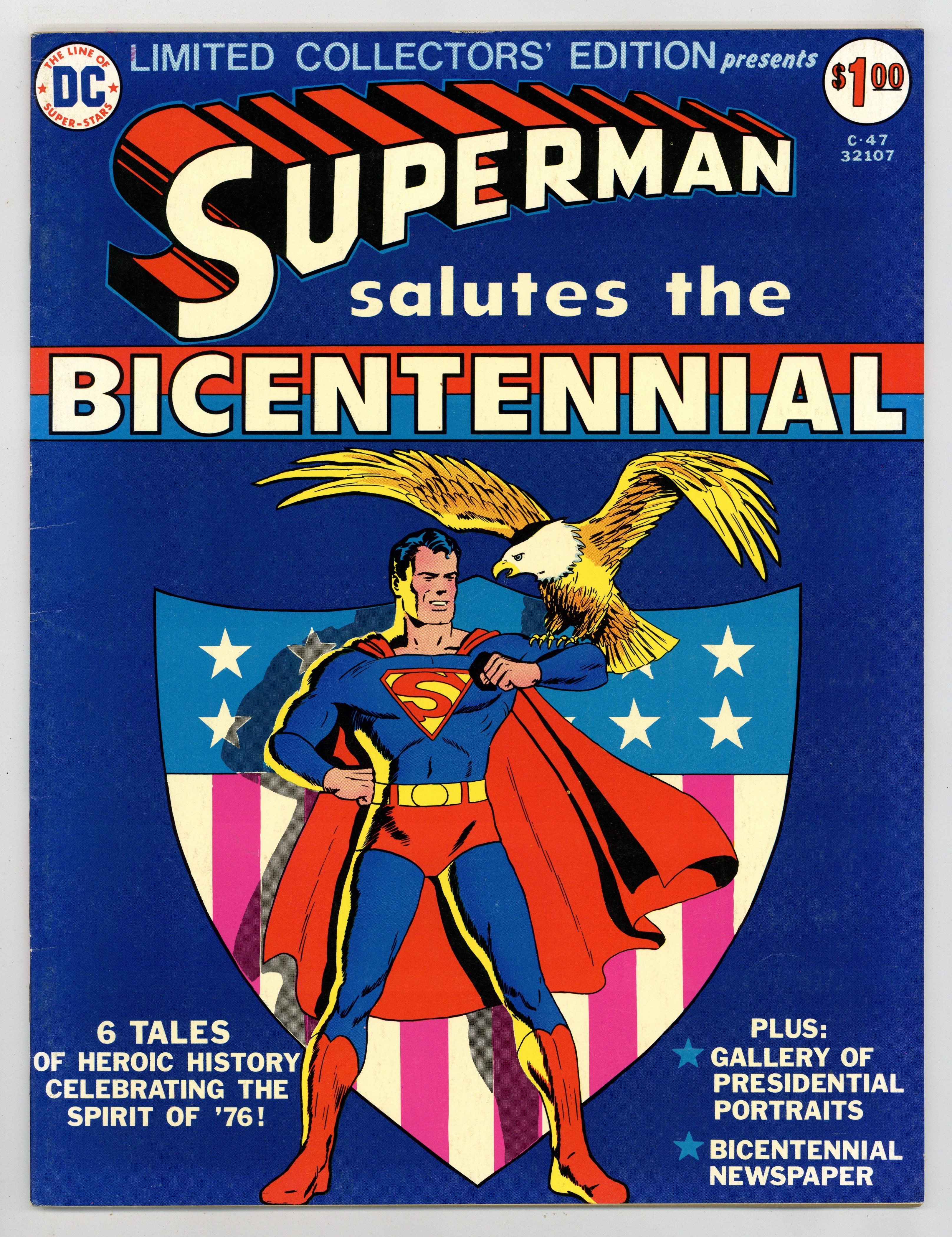 Limited Collectors' Edition: Superman cover and two interior pages only (bicentennial edition); rest is Tomahawk reprints. Size is 10 x 13-1/2" (about the size of a Life magazine). Cover price $1.00.
