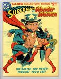 Tags: Treasury Sized Editions (part C54)$48.00All-New Collectors' Edition: Superman vs. Wonder Woman. Story by Gerry Conway. Story, front and back cover pencils by Jose Luis Garcia-Lopez. Story, front and back cover inks by Dan Adkins. It is 1942. In separate incidents, Superman and Wonder Woman each hear the term, "The Manhattan Project". Both set off to find out what it is, and both end up doing so. Superman is assured by government officials that the bomb will never be used as a weapon. Wonder Woman finds out what the bomb is on her own and decides no one should have it. This brings the two into conflict when Wonder Woman attempts to disrupt the project. Their battle is halted when Baron Blitzkrieg and the samurai Sumo each steal a component of the bomb. Can Superman and Wonder Woman recover the prototype, or will the Axis powers gain control of the atom bomb? Inside back cover includes information on the storys creators. 72 pages. Full color. Size is 10 x 13-1/2" (about the size of a Life magazine). Cover price $2.00.