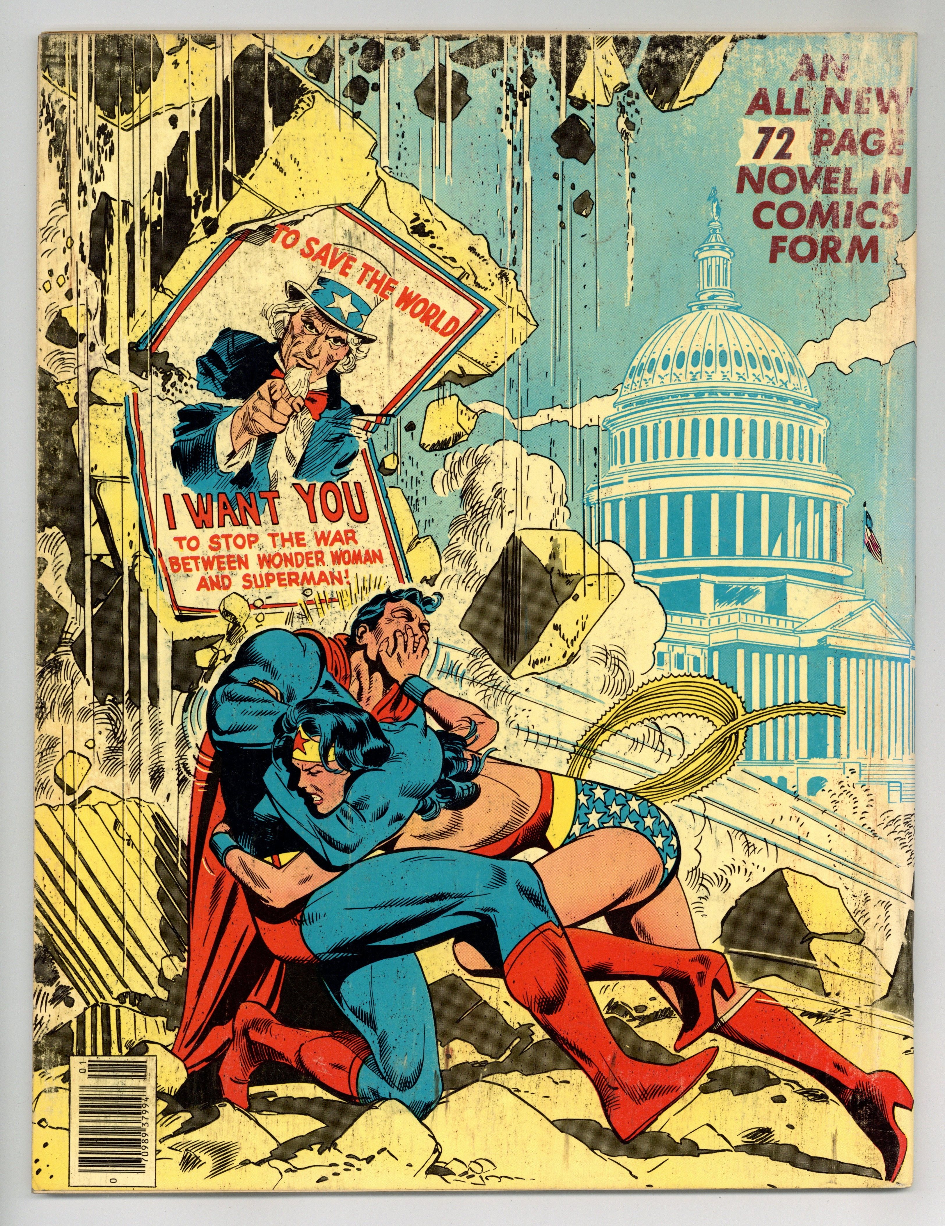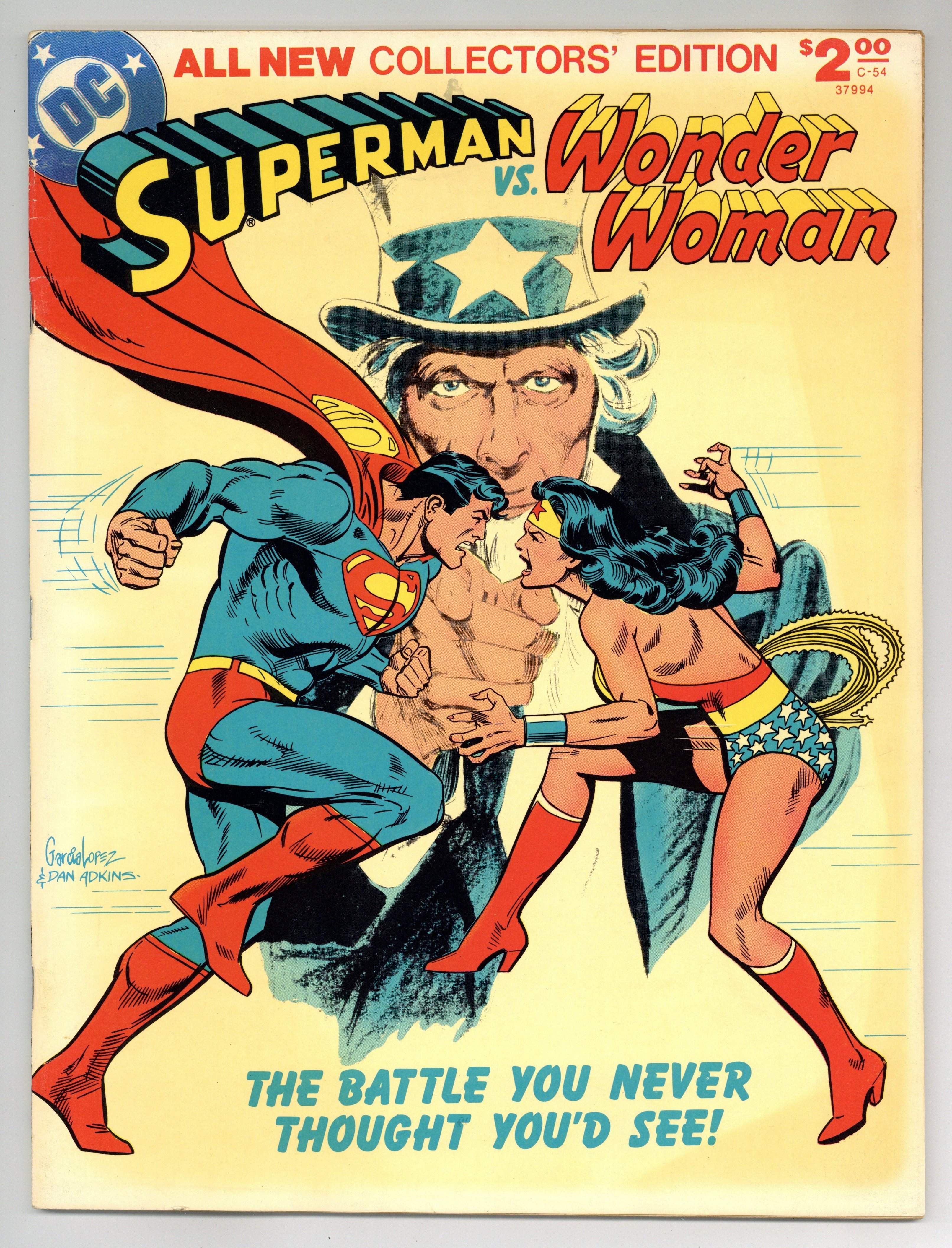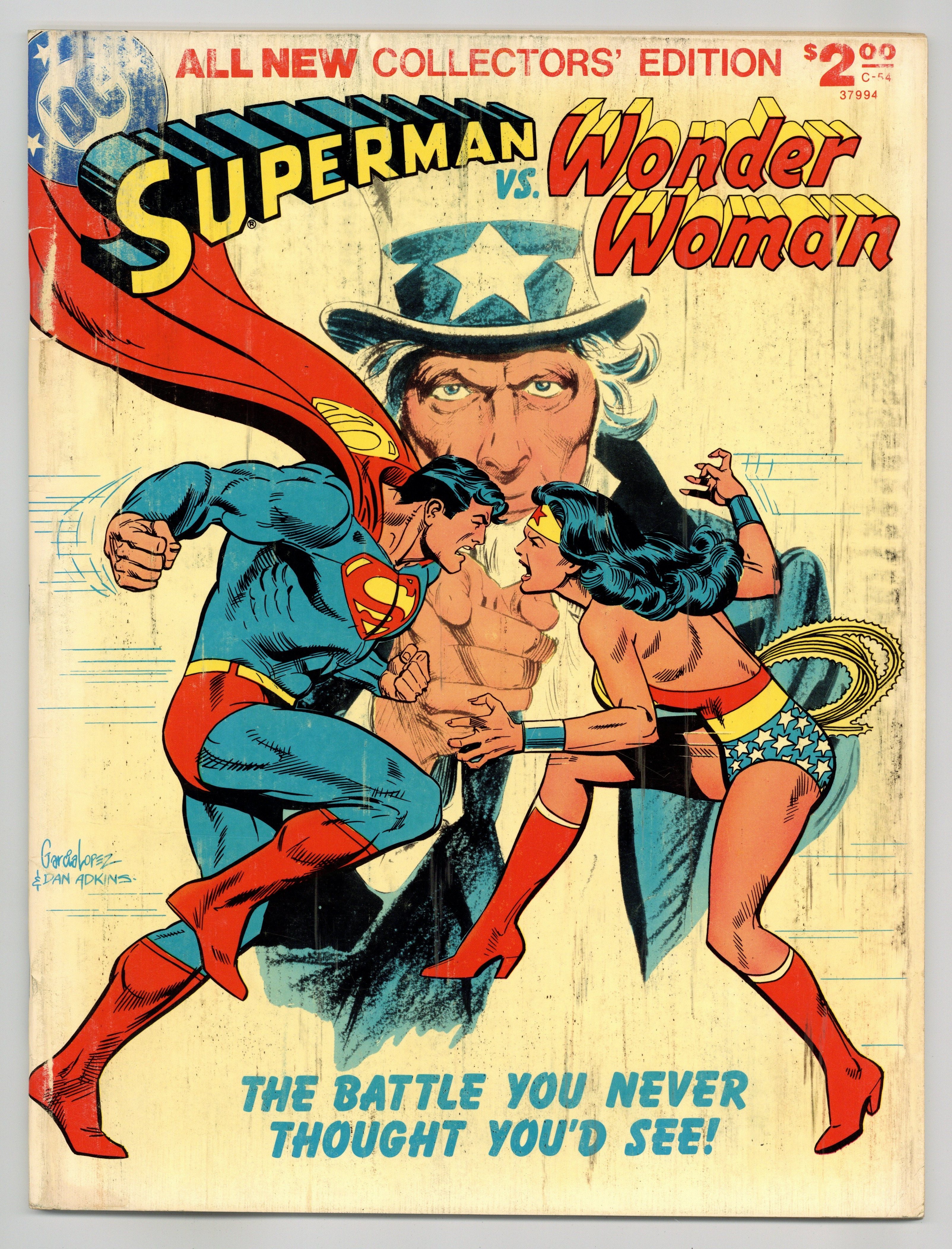 All-New Collectors' Edition: Superman vs. Wonder Woman. Story by Gerry Conway. Story, front and back cover pencils by Jose Luis Garcia-Lopez. Story, front and back cover inks by Dan Adkins. It is 1942. In separate incidents, Superman and Wonder Woman each hear the term, "The Manhattan Project". Both set off to find out what it is, and both end up doing so. Superman is assured by government officials that the bomb will never be used as a weapon. Wonder Woman finds out what the bomb is on her own and decides no one should have it. This brings the two into conflict when Wonder Woman attempts to disrupt the project. Their battle is halted when Baron Blitzkrieg and the samurai Sumo each steal a component of the bomb. Can Superman and Wonder Woman recover the prototype, or will the Axis powers gain control of the atom bomb? Inside back cover includes information on the storys creators. 72 pages. Full color. Size is 10 x 13-1/2" (about the size of a Life magazine). Cover price $2.00.