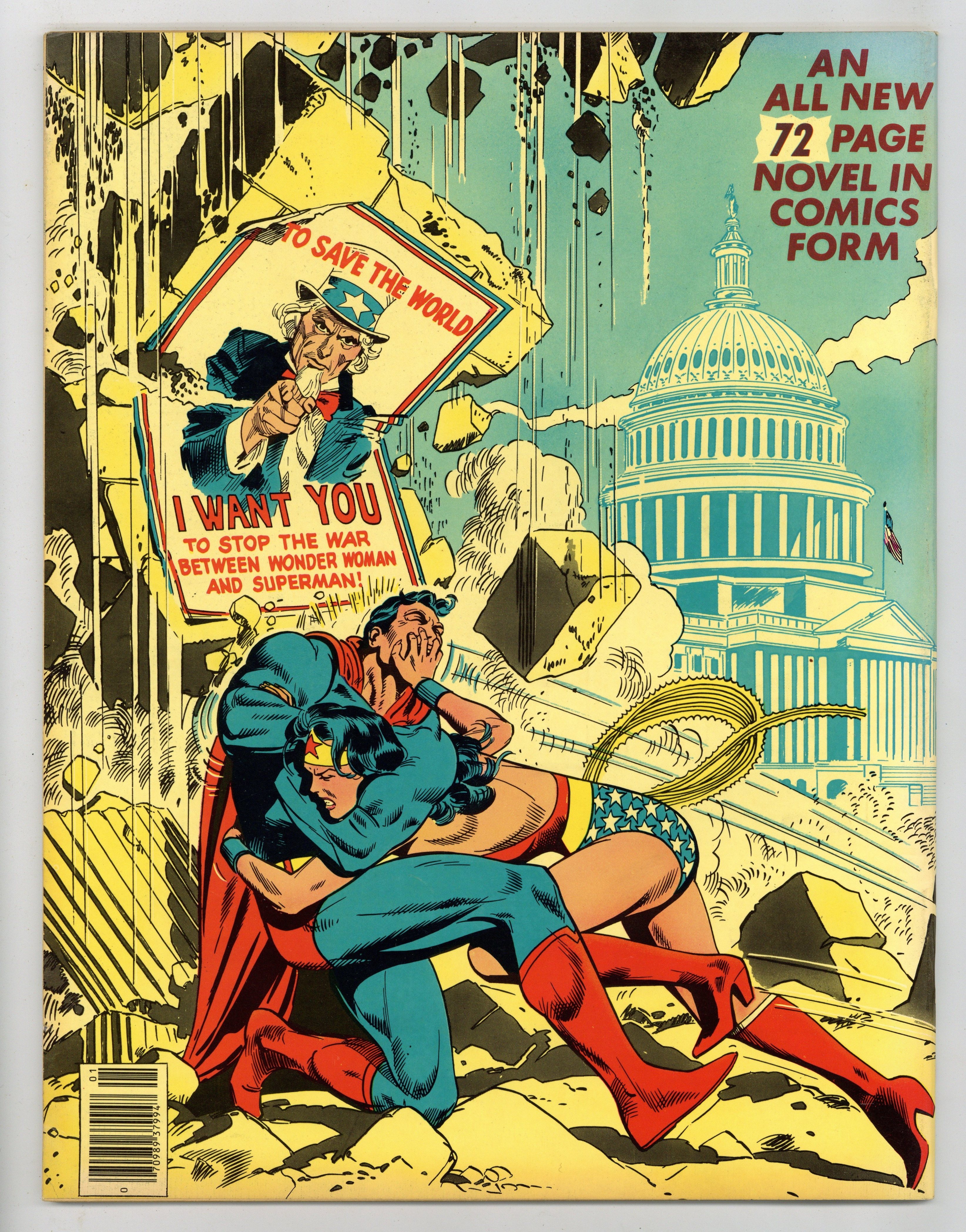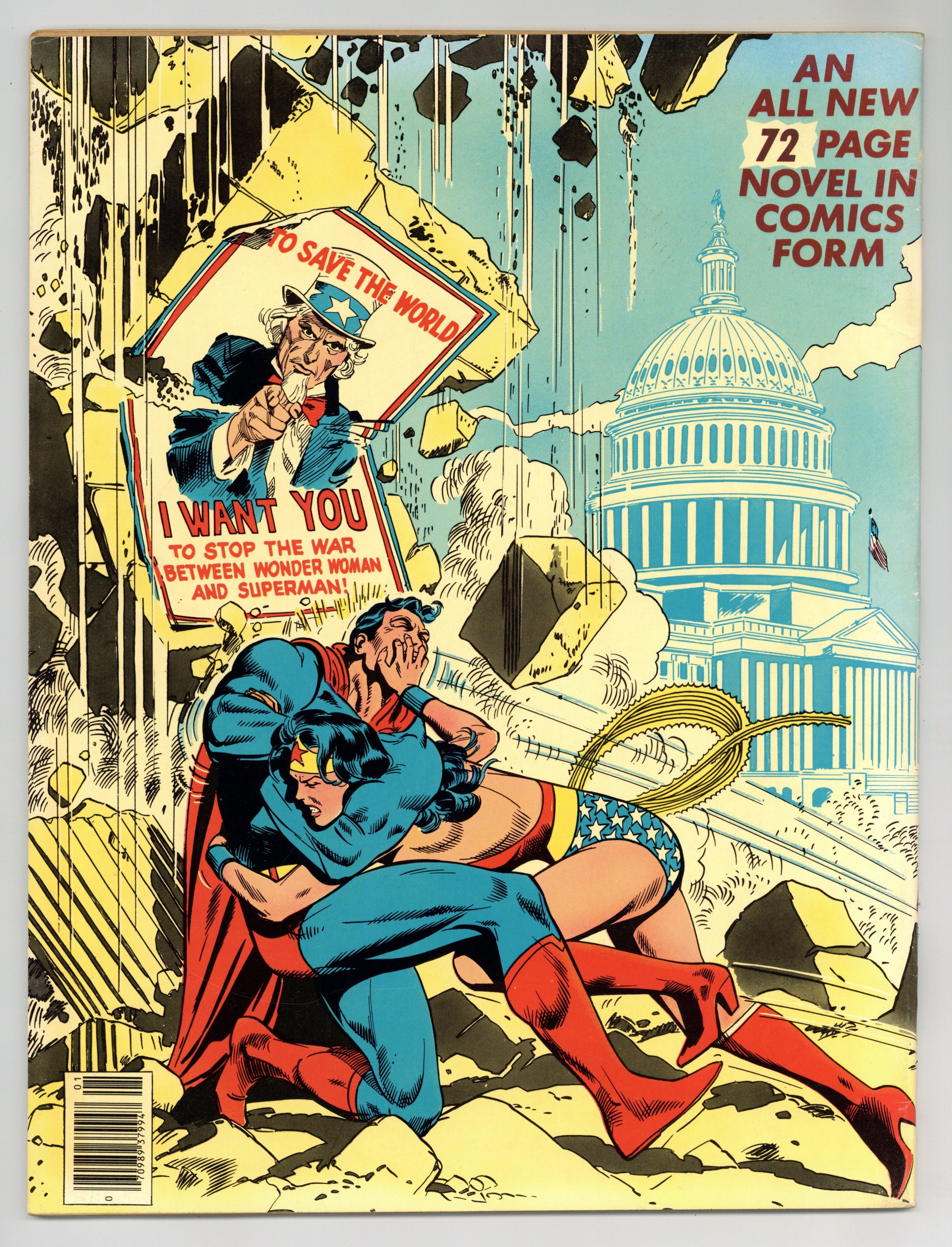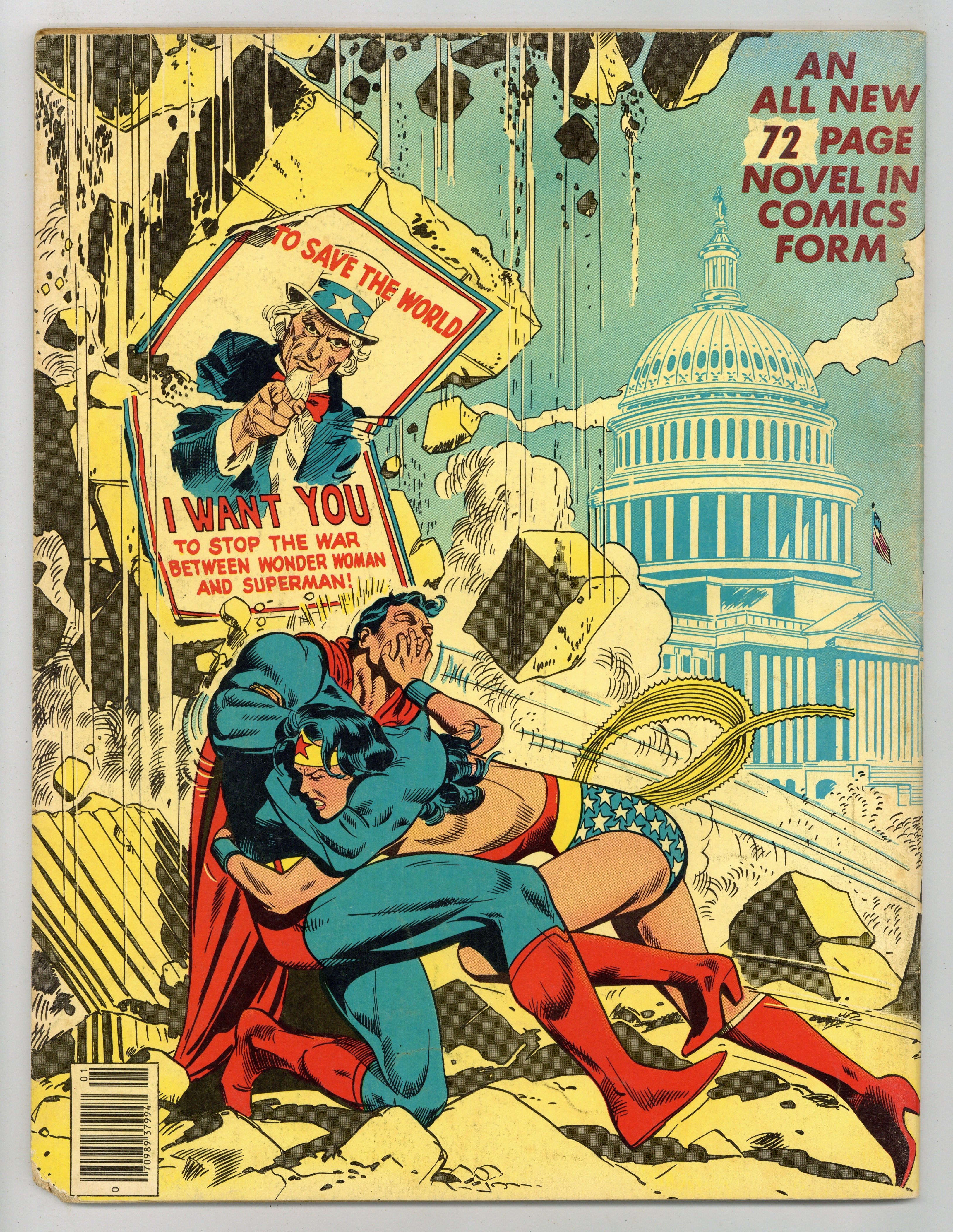 All-New Collectors' Edition: Superman vs. Wonder Woman. Story by Gerry Conway. Story, front and back cover pencils by Jose Luis Garcia-Lopez. Story, front and back cover inks by Dan Adkins. It is 1942. In separate incidents, Superman and Wonder Woman each hear the term, "The Manhattan Project". Both set off to find out what it is, and both end up doing so. Superman is assured by government officials that the bomb will never be used as a weapon. Wonder Woman finds out what the bomb is on her own and decides no one should have it. This brings the two into conflict when Wonder Woman attempts to disrupt the project. Their battle is halted when Baron Blitzkrieg and the samurai Sumo each steal a component of the bomb. Can Superman and Wonder Woman recover the prototype, or will the Axis powers gain control of the atom bomb? Inside back cover includes information on the storys creators. 72 pages. Full color. Size is 10 x 13-1/2" (about the size of a Life magazine). Cover price $2.00.