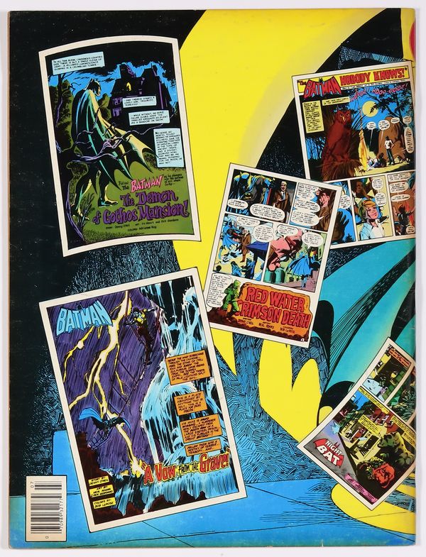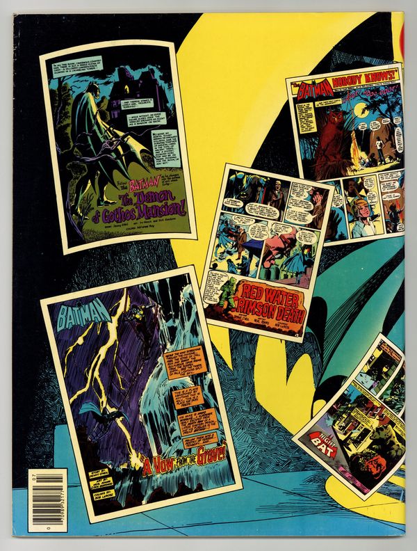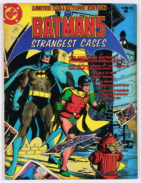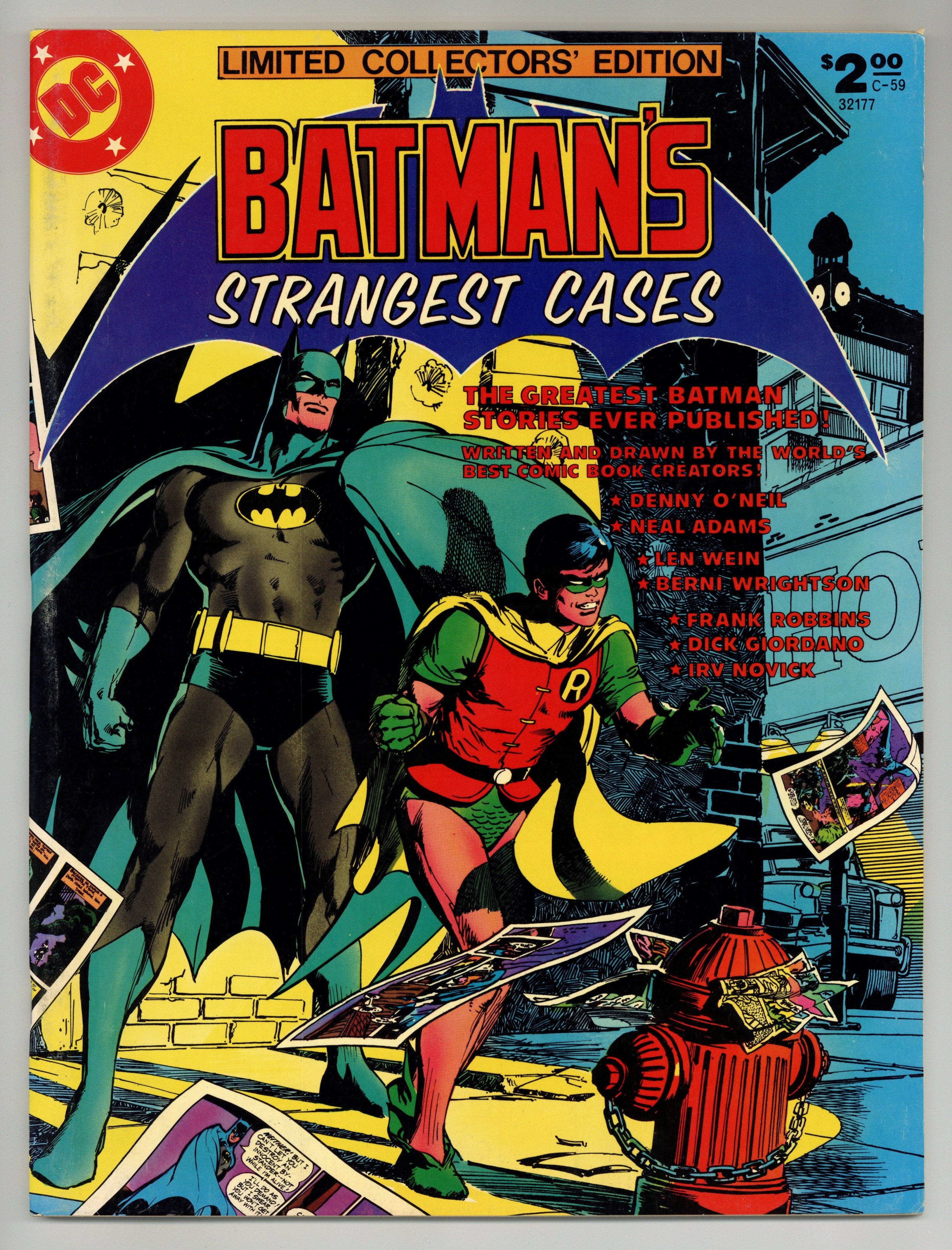 Limited Collectors' Edition: Batman's Strangest Cases. Reprints: "Red Water, Crimson Death" (art by Neal Adams), "Night of the Bat" co-starring Swamp Thing (art by Berni Wrightson), "The Batman Nobody KNows" (art by Dick Giordano), "The Demon of Gothos Mansion" (art by Irv Novick), and "A Vow From the Grave" (art by Adams). Size is 10 x 13-1/2" (about the size of a Life magazine). 80 pages. Adams cover. Cover price $2.00.