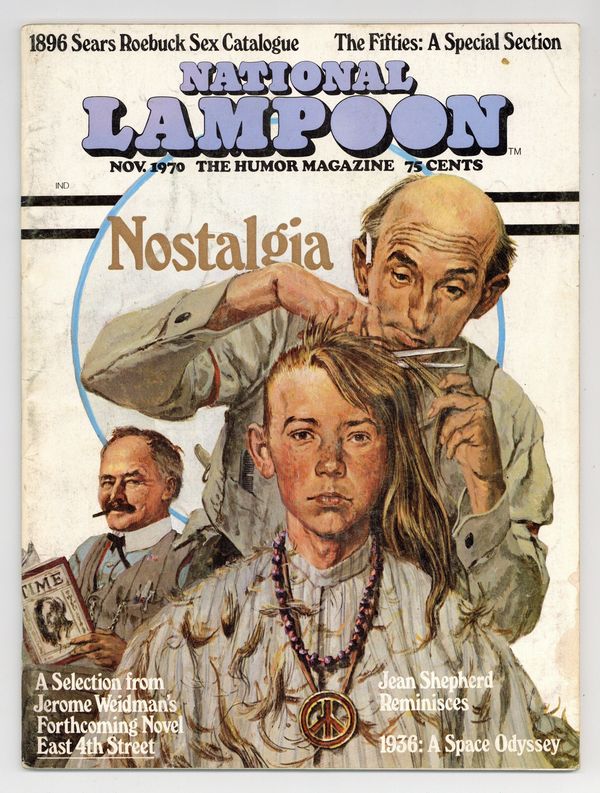 Published Nov 1970 by National Lampoon.$14.00Issue #8. November 1970. Nostalgia. A parody of 19th century Sears Roebuck catalogues; 1956 High School Yearbook. Stories and art by Michael O'Donoghue, Jean Shepherd, Rick Meyerowitz, Arnold Roth, Stan Mack, and Doug Kenney. Plus letters from the editors, cartoons, and more tasteless jokes. First issue with art director Michael Gross, who went on to create some of the Lampoons most famous/infamous covers and ad parodies. Mature readers. Cover spoof of Norman Rockwell by Lou Glanzman. 8.25" x 11". 72 pages. Partial color. Cover price $0.75.