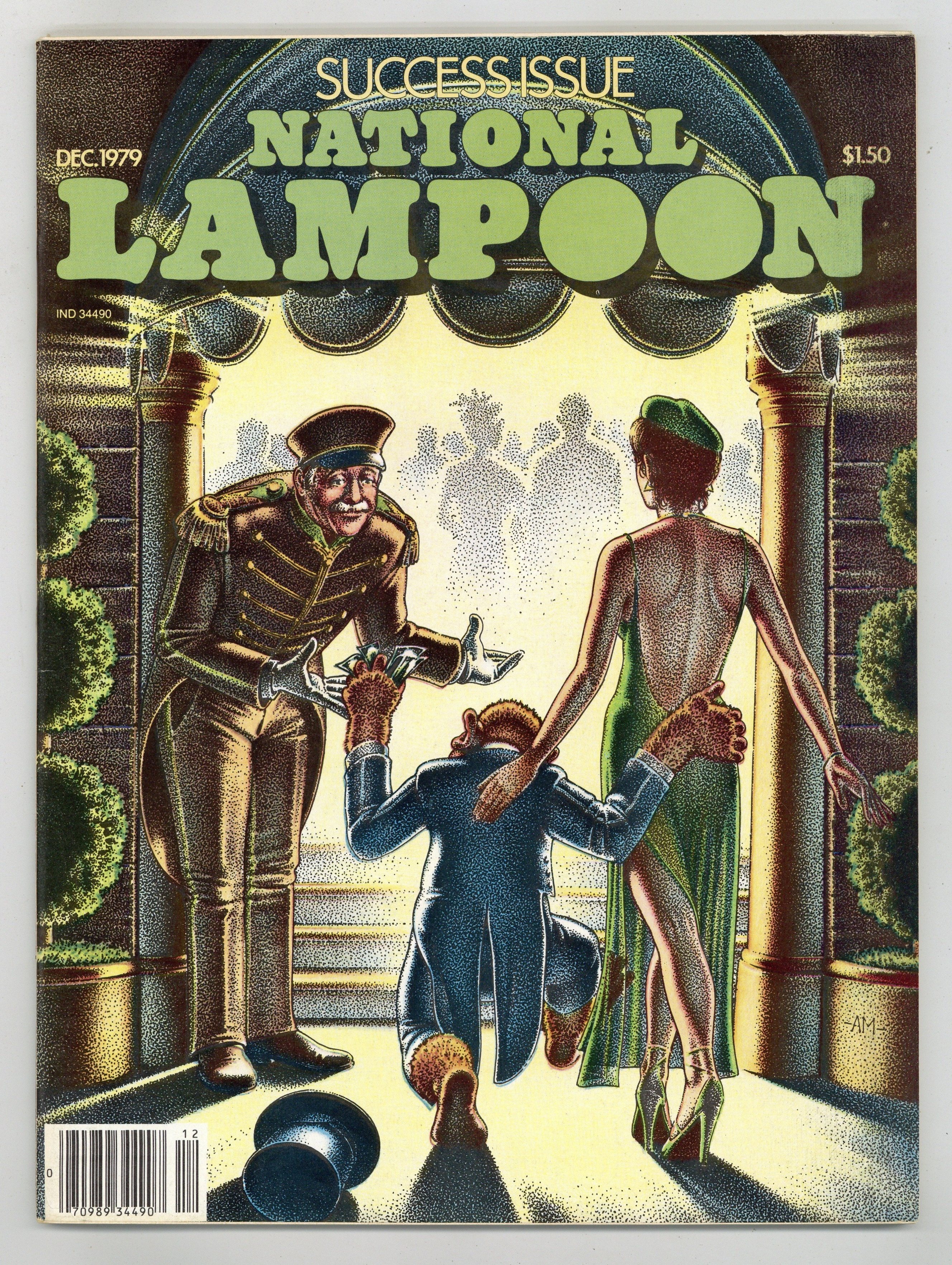 Published Dec 1979 by National Lampoon.$12.00December 1979. Success. A comic about getting ahead in the grocery biz, illustrated by Ernie Colon; a modern-day Christmas Carol; a guide to failure, written by John Hughes and illustrated by Leslie Carbanga. Stories and art by P. J. O'Rourke, Rick Meyerowitz, Roz Chast, Gahan Wilson, Shary Flenniken, Rick Geary, Sam Gross, Ron Barrett, and B. K. Taylor. Plus letters from the editors, cartoons, and Foto Funnies. Mature readers. Cover by Alex Murawaki. Cover price $1.50.