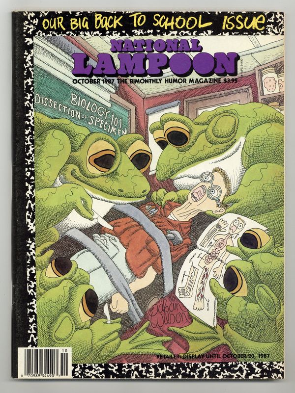 Published Oct 1987 by National Lampoon.$7.80October 1987. Back to School. The Klaus Barbie Doll, a Nazi paper doll illustrated by Ralph Reese; a story by Chris Miller (of Animal House fame) illustrated by Rick Geary; a one-page Harvey Pekar story illustrated by Drew Friedman. Stories and art by Paul Krassner, Gerald Sussman, Frank Springer, Buddy Hickerson, Shary Flenniken, Rick Meyerowitz, Gerard Jones, Alan Kupperberg, Ron Barrett, and M.K. Brown. Plus letters from the editors, cartoons, and Foto Funnies. Mature readers. Cover by Gahan Wilson. Cover price $3.95.